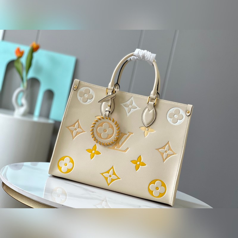 LV M45081 OnTheGo suuri kantolaukku, maidonvalkoinen kohokuvioitu nahka