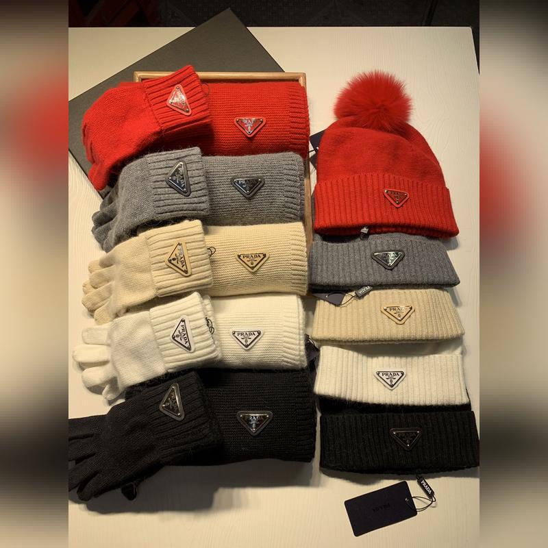 Prada Wool -kolmiosainen setti Fox Fur Hat -huivi ja -hanskat Classic Warmth