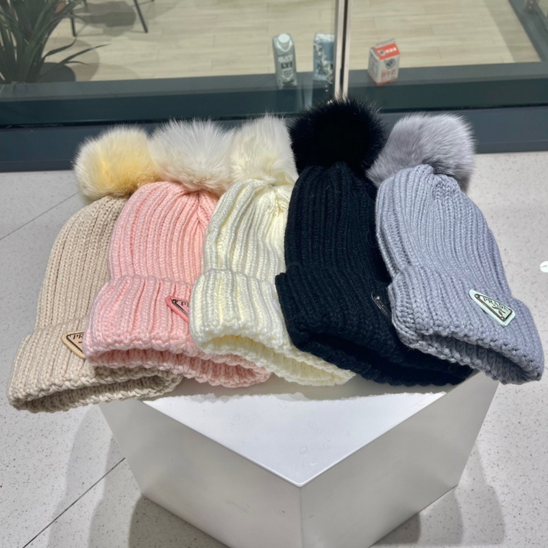 PRADA 2023 Syksy/Talvi Kettuturkis Pom Pom Neulottu Hattu Premium Quality