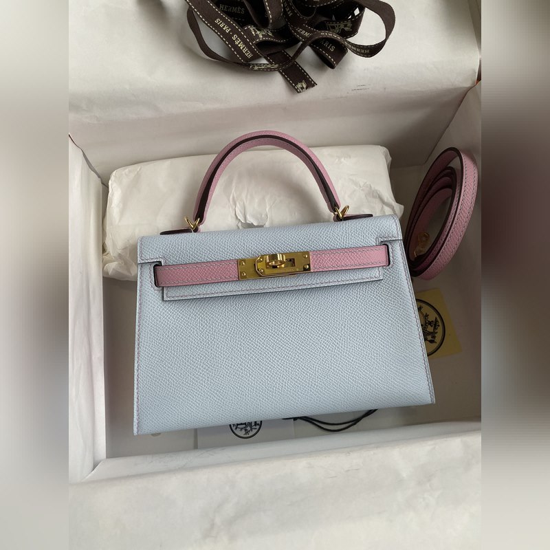 Käsin ommeltu Hermes Mini Kelly 19cm Epsom Leather Misty Blue&Hibiscus