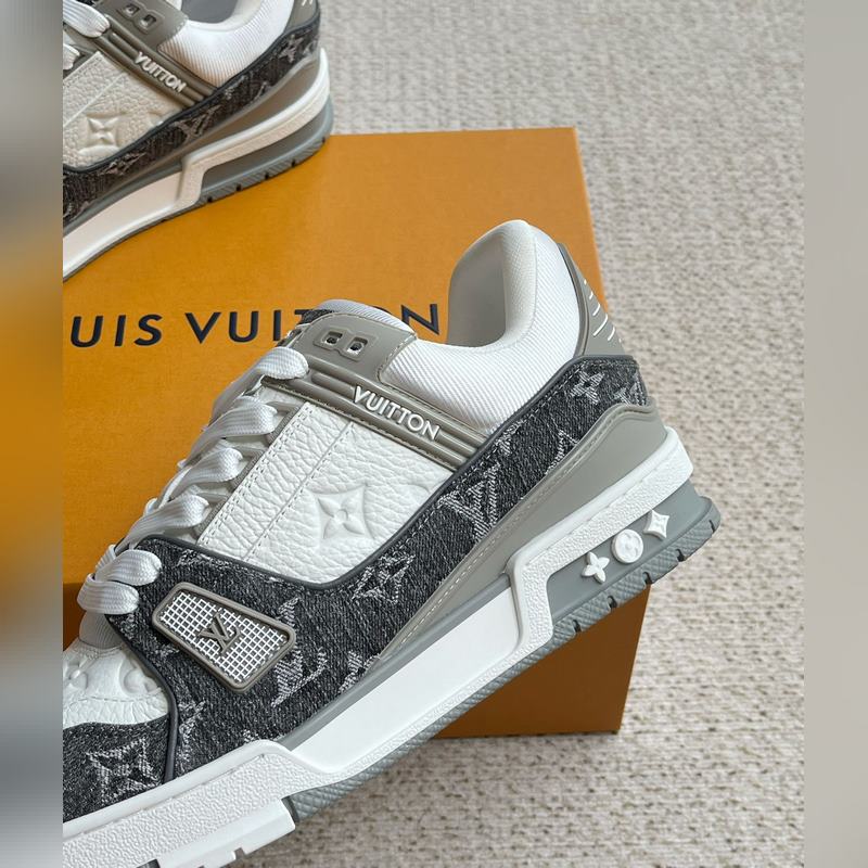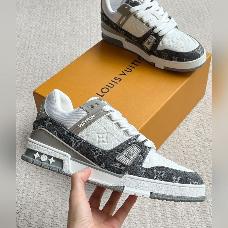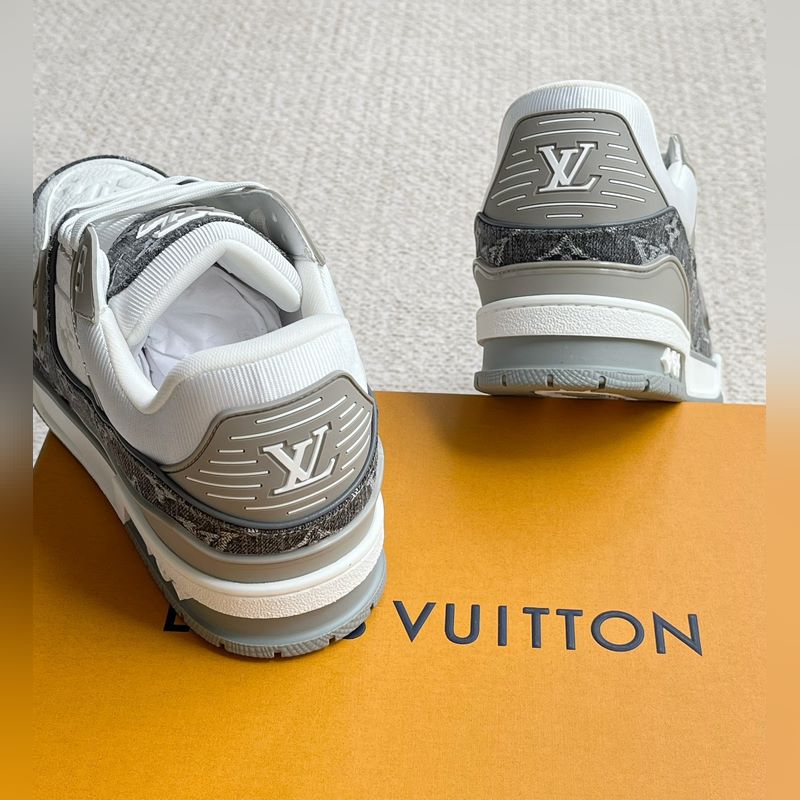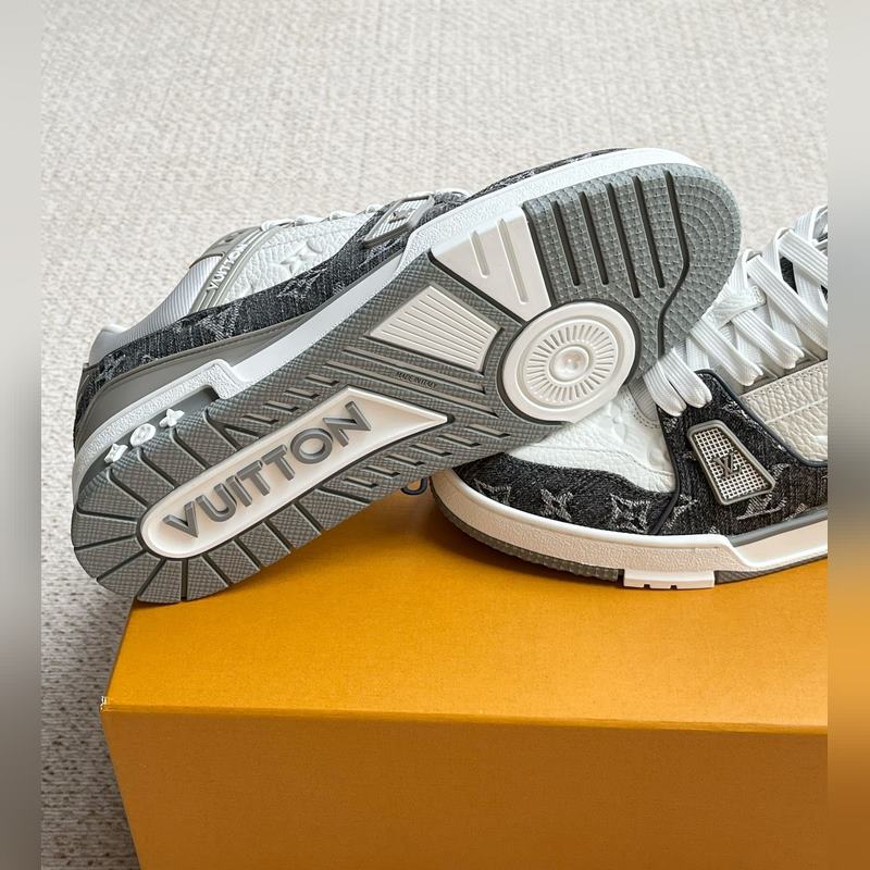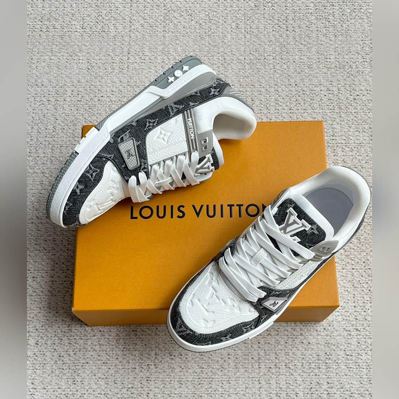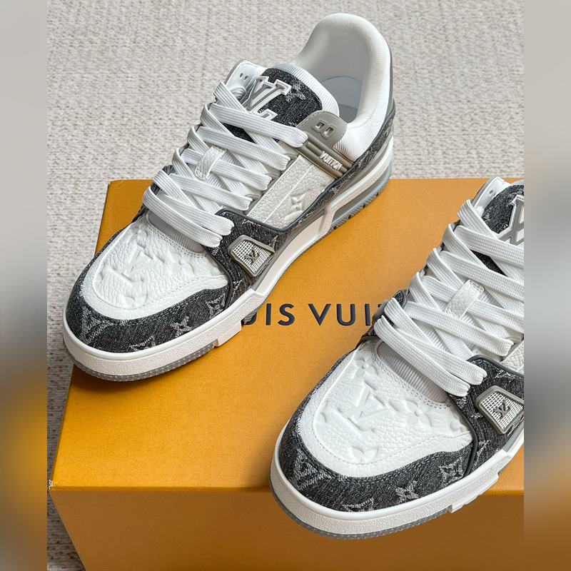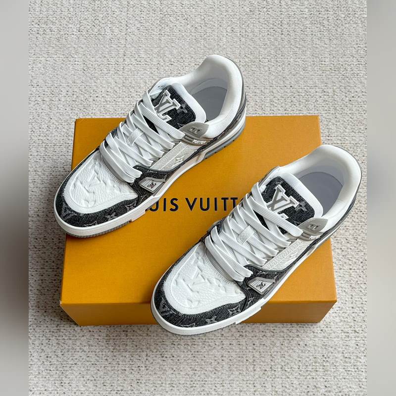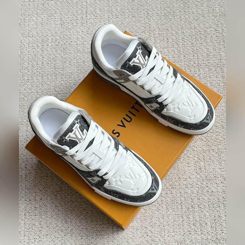 Tämä LV Trainer -lenkkari on valmistettu Monogram denimistä ja Monogram kohokuvioidusta rakeisesta lehmännahasta. Alkuperäisen suunnittelun on luonut Virgil Abloh. Monimutkainen päällinen ja erilaiset merkkielementit lisäävät tunnettuutta. LV-kirjaimet valaisevat kielen ja selän, ja Monogram-kukat kukkivat teknisessä kumipohjassa.