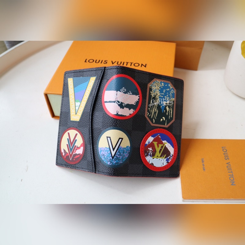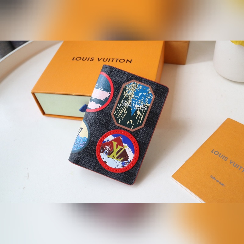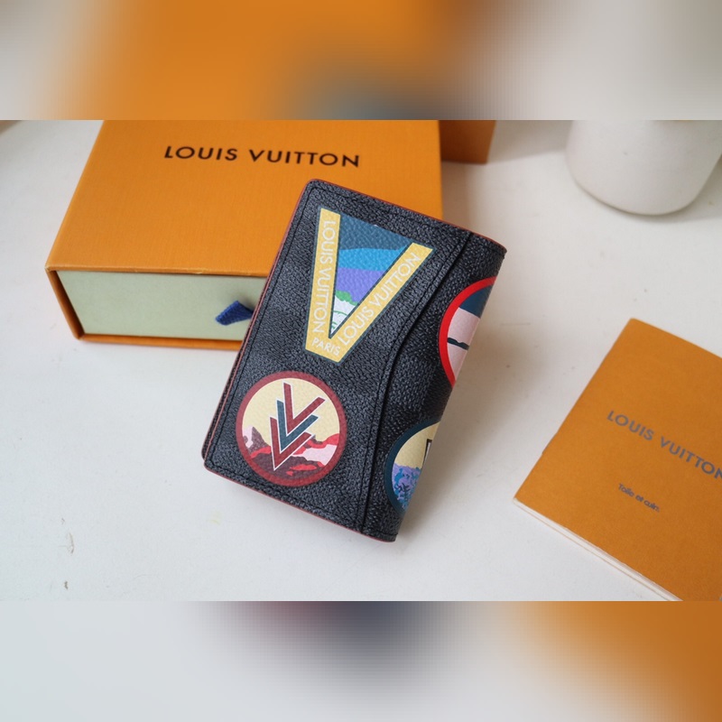 Damier Graphite -kankaasta valmistettu vuoden 2023 talvitaskulompakko on koristeltu kohokuvioiduilla nahkapaikoilla, joissa on alppimaisemia ja klassisia LV-logoteemoja. Se on kompakti ja tehokas, ja siihen voi tallentaa luottokortteja, seteleitä ja kuitteja. Koko: 11×8 cm