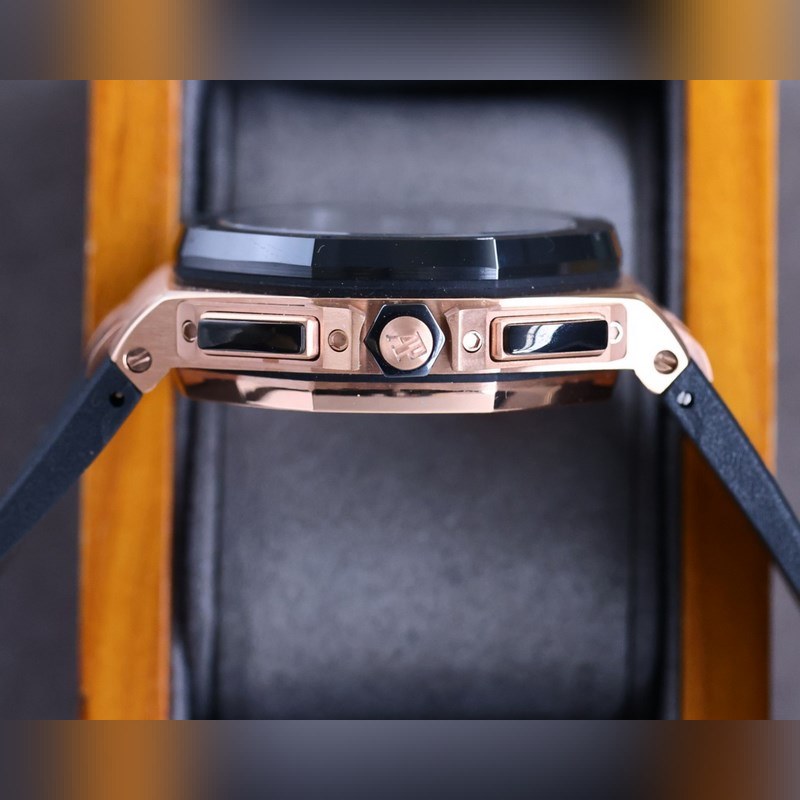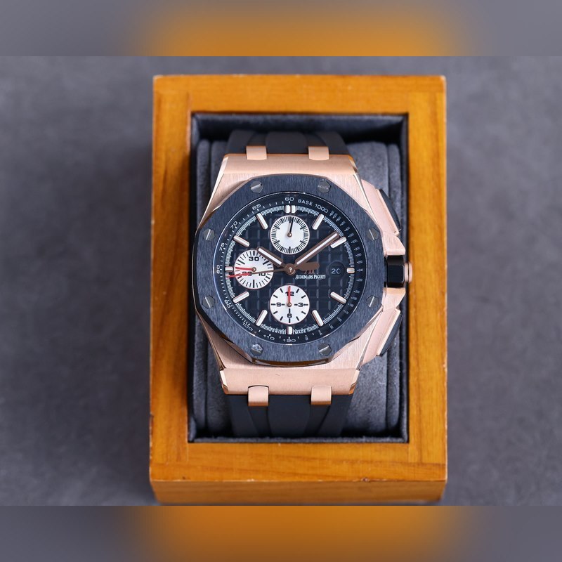 Kansi on sama kuin alkuperäinen, ja siinä käytetään tuotua keraamista kehystä. Kruunu on valmistettu kuusikulmaisesta keraamisesta materiaalista ja yläosa on harjattu ja kiillotettu. Liike on dominoivampi läpinäkyvän takakannen taustalla. Harmaamusta automaattiroottori on hyvin kerroksellinen, ja liikkeen pinta on upotettu jalokivillä. 7750 modifioitu 3126 täysin automaattinen kronografin mekaaninen liike. Kellopeili on valmistettu tuontisafiirilasista. Kellon runko on valmistettu maahantuodusta 316 ruostumattomasta teräksestä. Kellon ranneke on sovitettu maahan tuodun fluorikumirannekkeen ja alkuperäisen tappisoljen kanssa. Pakollinen koville miehille. Useiden kiillotus- ja kuorrutusprosessien jälkeen AP:n ainutlaatuinen kahdeksankulmainen kehys ilmaisee vihdoin terävät viivat. Tämä Audemars Piguetin lähtötason kello on erittäin suositeltavaa.