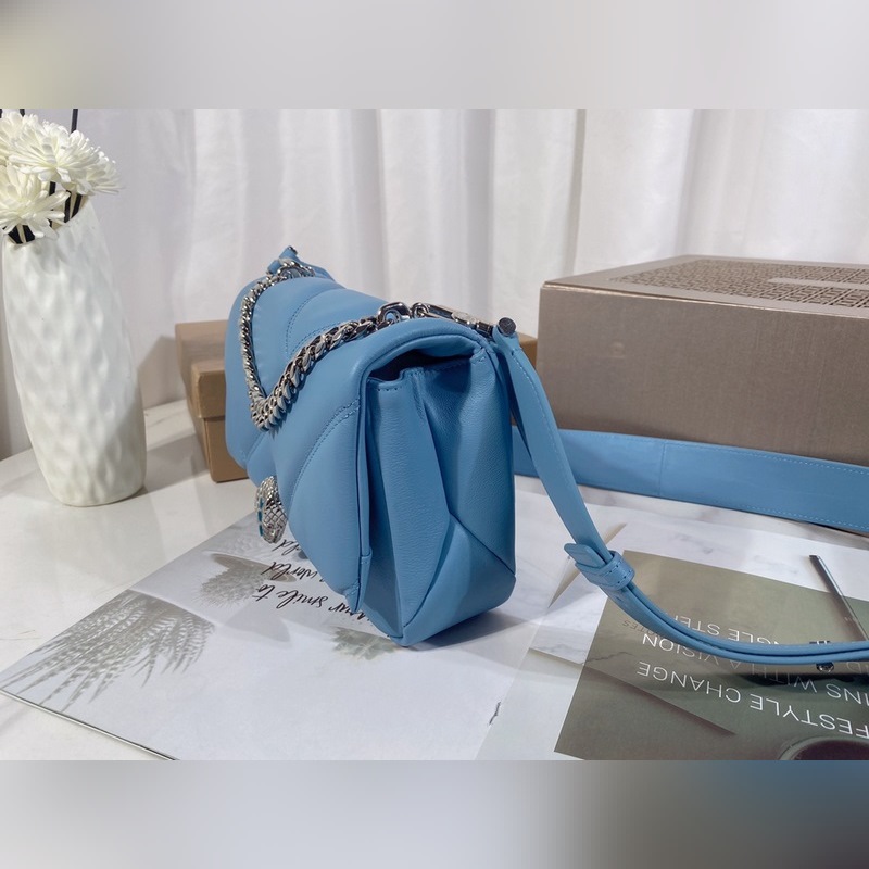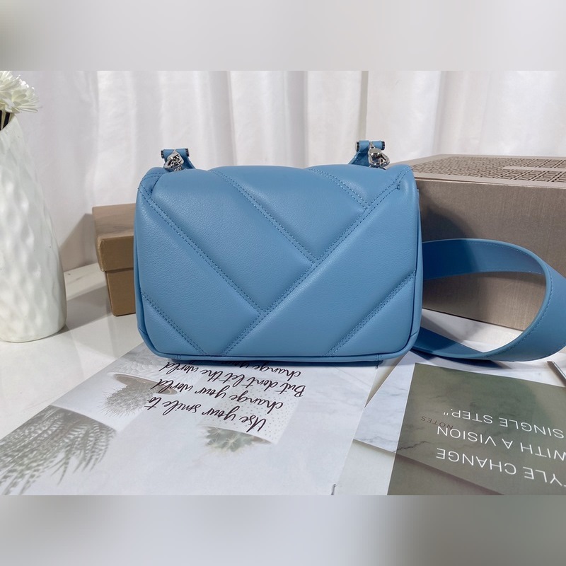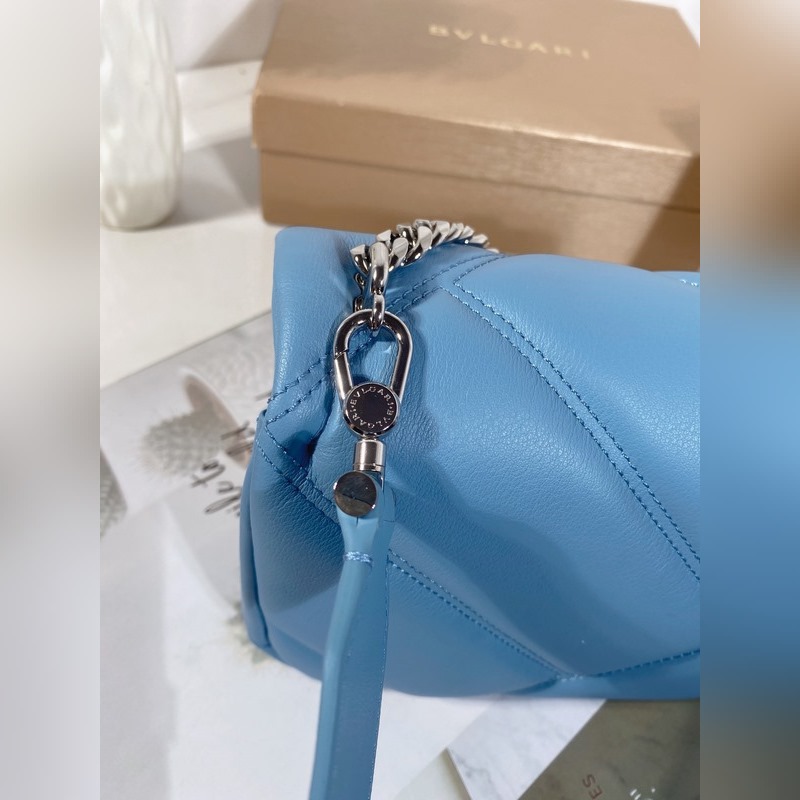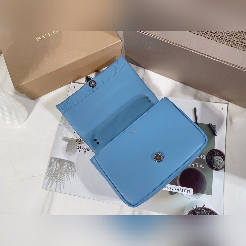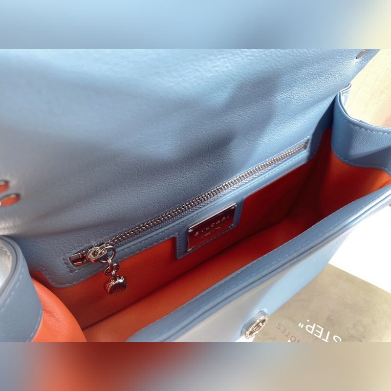 Med ett slående stort grafiskt mönster och djärva metalldetaljer är den här väskans kropp i safirblått kalvskinn ännu mjukare och slätare. Den palladiumpläterade mässingshårdvaran, inspirerad av en vintage Bvlgari-klocka från 1960-talet, har en delikat blå agatskala i mitten och röda emaljögon för en fräsch twist. Med en justerbar och avtagbar axelrem i läder kan den här väskan användas som handväska eller clutch, vilket gör den mångsidig och lämplig för dag och natt. Mellanstor med ett förvaringsfack, en intern ficka med dragkedja och en invändig öppen ficka. Namnskylt av metall på insidan med Bvlgari-märke.