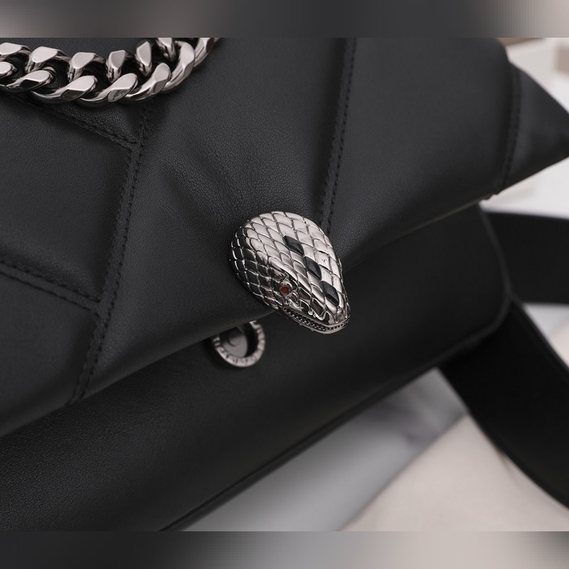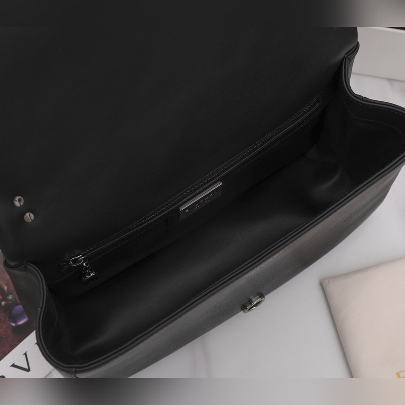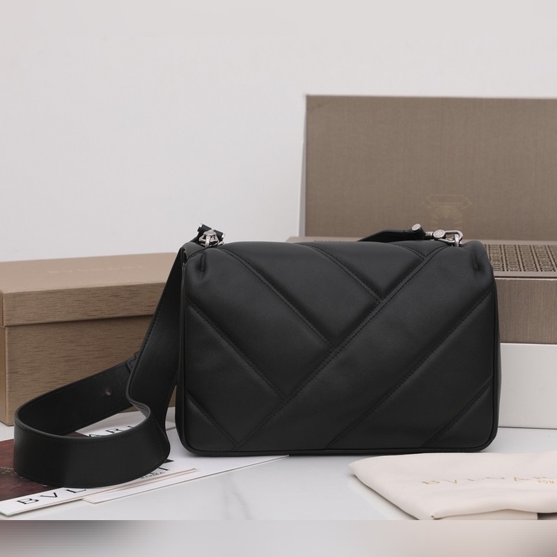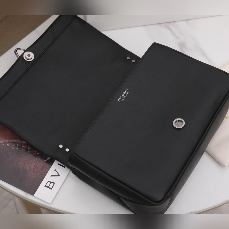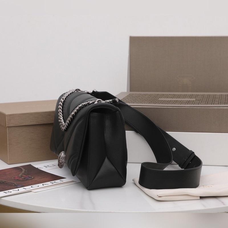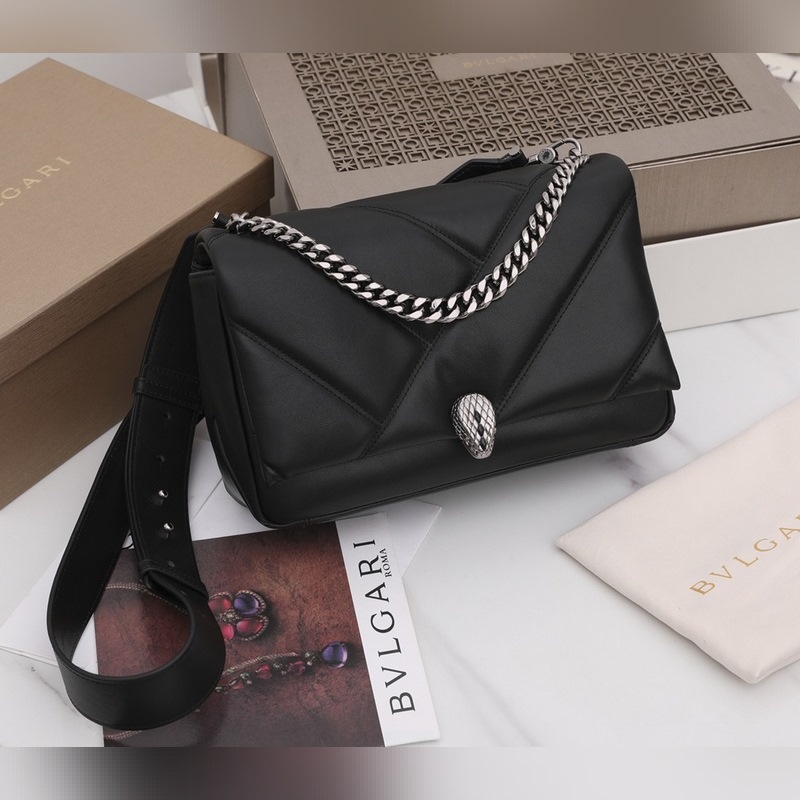 Med ett stort grafiskt mönster och djärva metalldetaljer är det svarta kalvskinnet på huvuddelen av denna väska ännu mjukare och slätare. Det ruteniumpläterade ormhuvudslåset i mörk mässing av SERPENTI, inspirerat av en Bvlgari vintageklocka från 1960-talet, är dekorerad med små svarta onyxfjäll i mitten och röda emaljögon, som visar en ny twist. Denna handväska är utrustad med en justerbar och avtagbar axelrem i läder, som kan användas som en handväska eller en clutch, för att uppnå mångsidiga funktioner, lämplig för dag och natt. Mellanstor, med ett förvaringsfack, en intern ficka med dragkedja och en invändig öppen ficka. Namnskylt av metall på insidan graverad med märkeslogotypen Bvlgari.