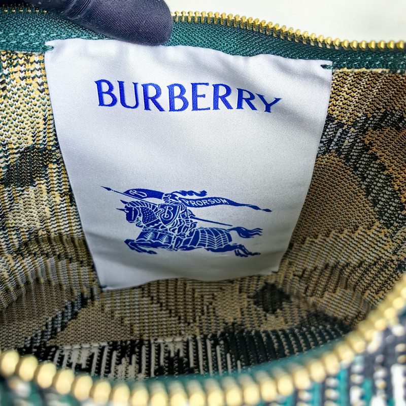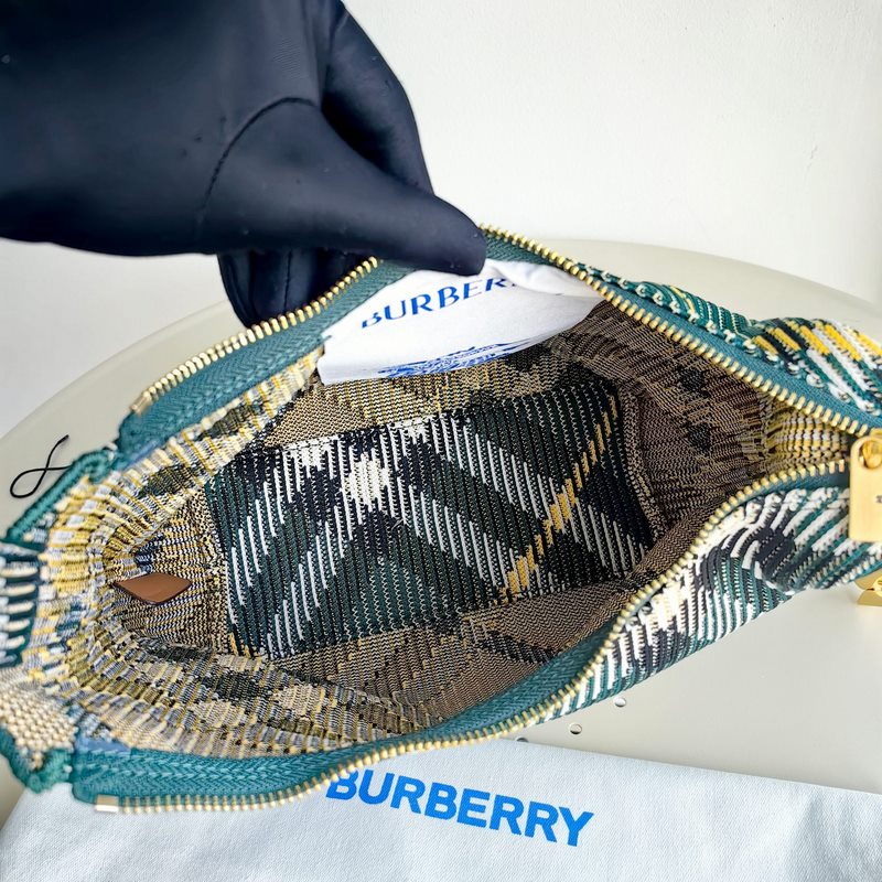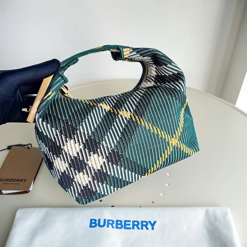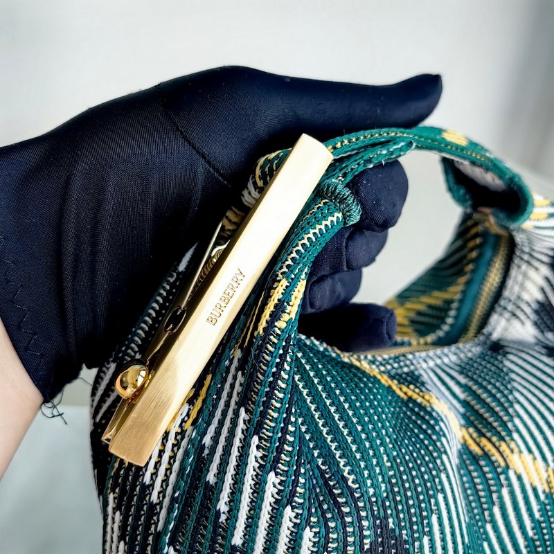 Pehmeä, strukturoitu Italiassa neulottu kassi Burberry-ruudulla. Kevyt ja vuoriton. Pyykkineulan muotoiseen lukkoon on kaiverrettu Burberry-logo ja se kiinnittää helposti kaarevan yläkahvan.