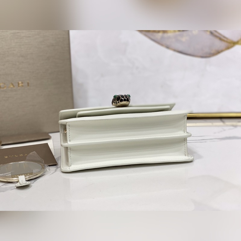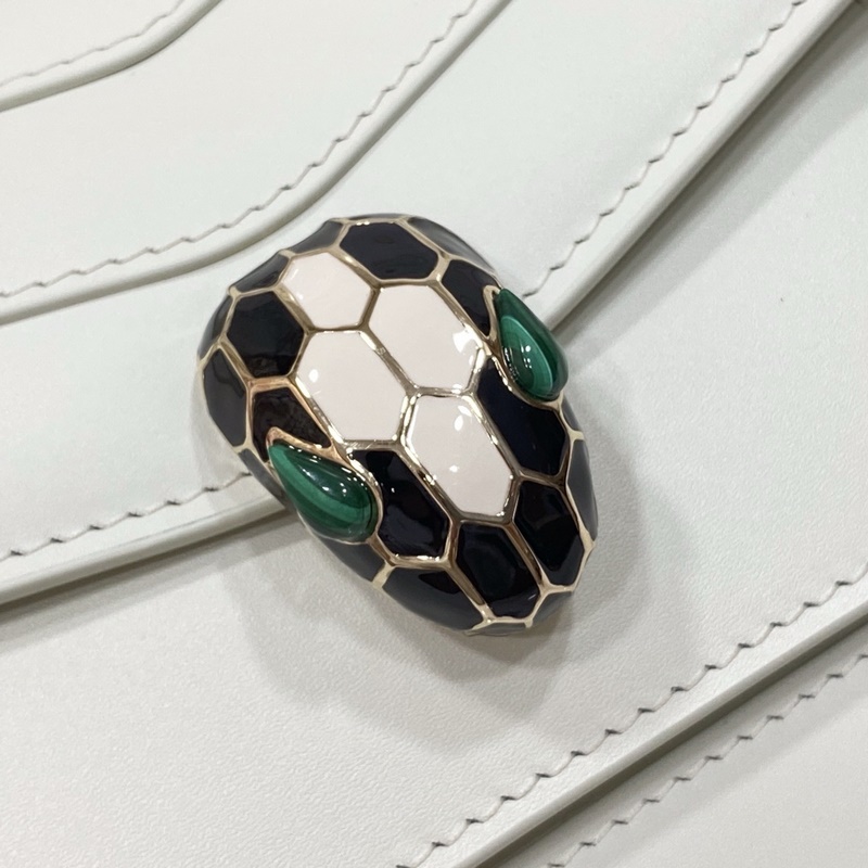 Korostaa urbaania tyyliä, muodikas ja vaihteleva, lisää ainutlaatuista trendiä ja muotia Serpenti-maailmaan. Tämä laukku on valmistettu huippuluokan vasikannahasta, ja siinä on vaaleat kullatut messingiset tarvikkeet, mustavalkoinen akaattiemali ja vihreät malakiittiset sensuellit silmät, jotka koristavat klassista käärmepään solkia hurmaavalla viehätysvoimalla. Säädettävä käärmeen muotoinen ketju ja nahkainen olkahihna, joka sopii helposti yhteen muodikkaiden päivävaatteiden kanssa, kaksi säilytyskerrosta ja pieni meikkipeili, irrotettava luottokorttiteline, suutasku, vetoketjullinen tasku ja kaksi ulkotaskua. Mitat: 20×13×7cm Numero: SD96181280