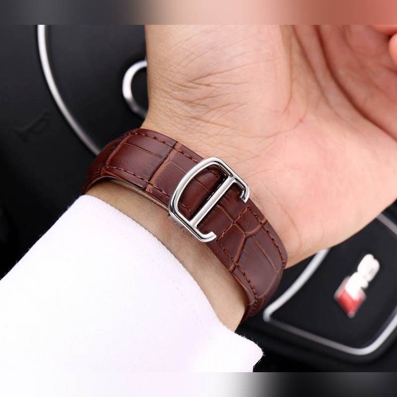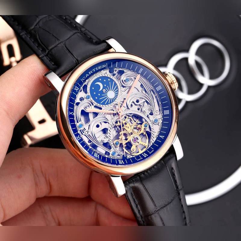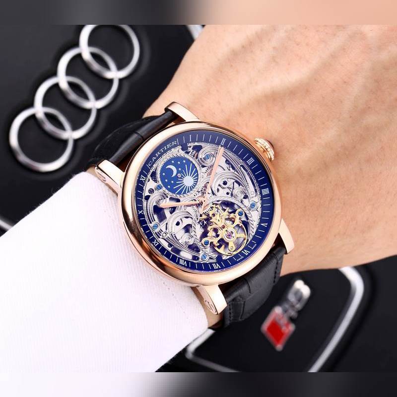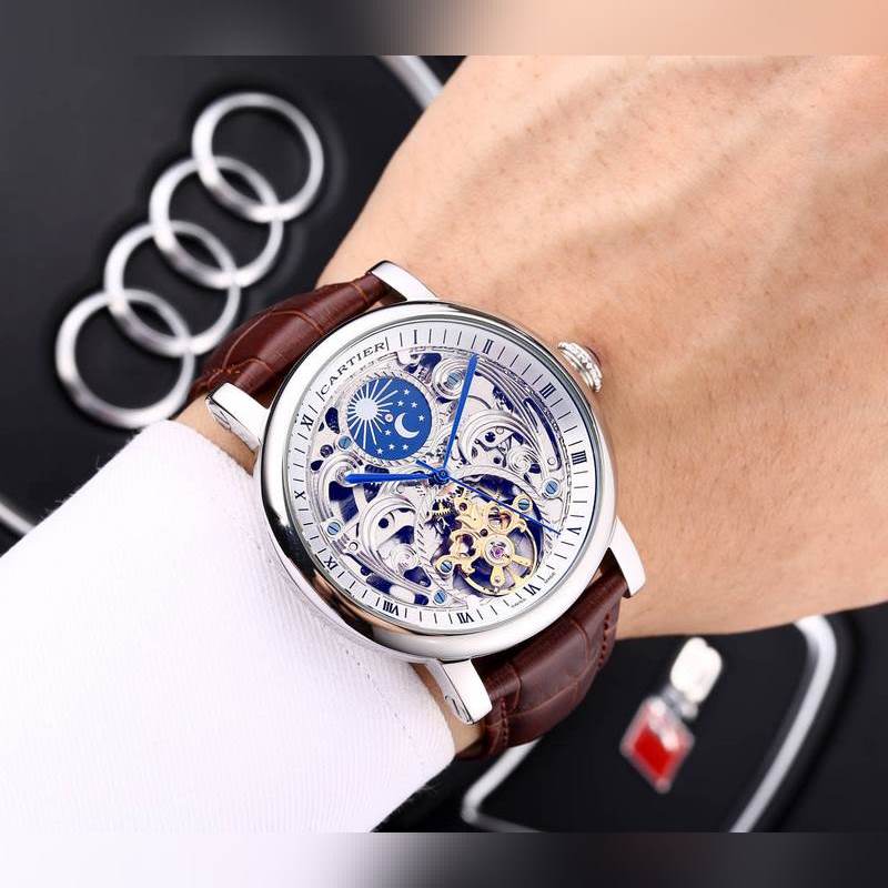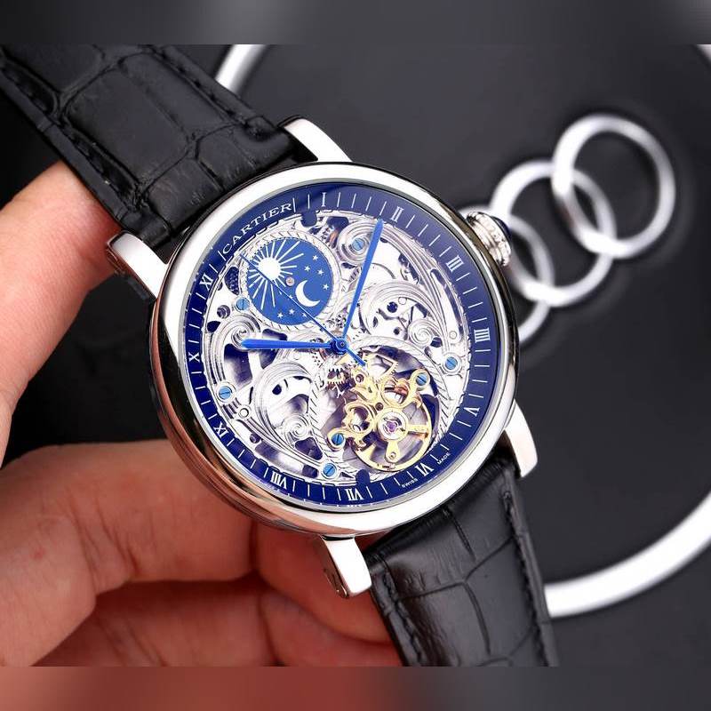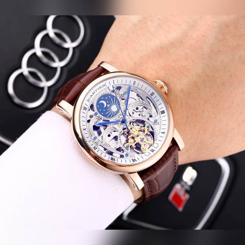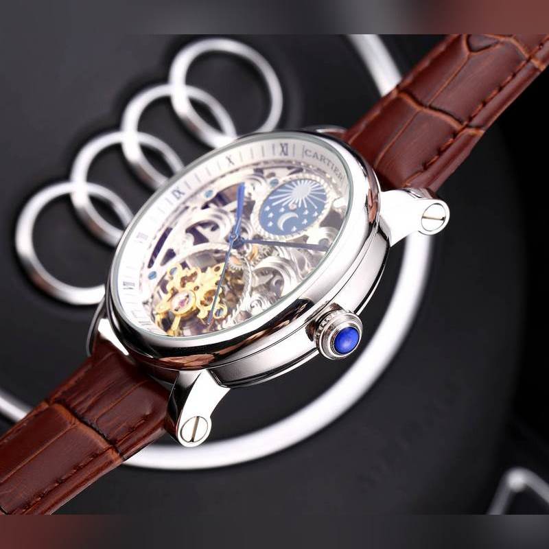 Yksinkertainen kolmen käden yhteensopiva ontto vauhtipyörä, 316 ruostumattomasta teräksestä valmistettu kotelo, täysin automaattinen mekaaninen liike, koko: 42 mm paksu 12 mm, ylhäältä tuotu nahkaranneke, varustettu alkuperäisellä solkimineraalipeilillä