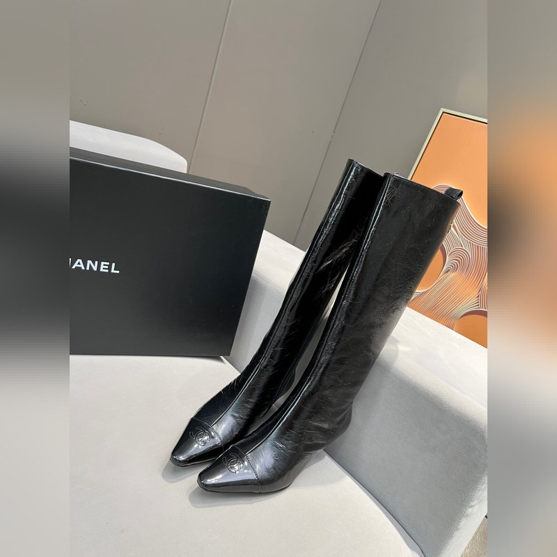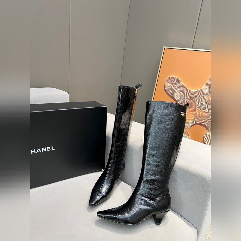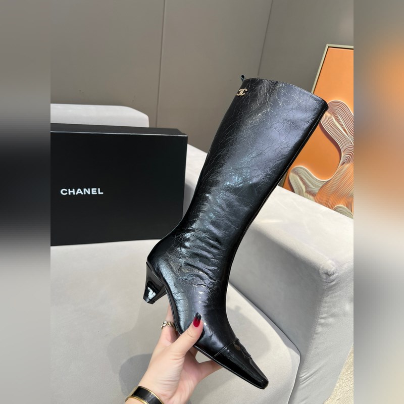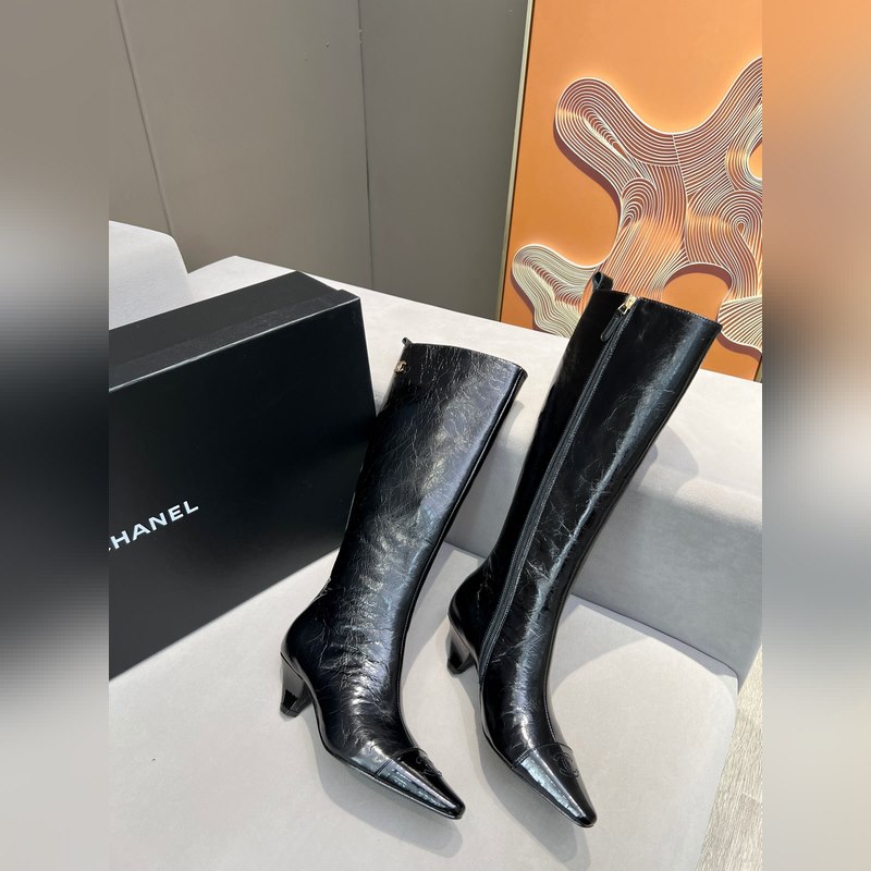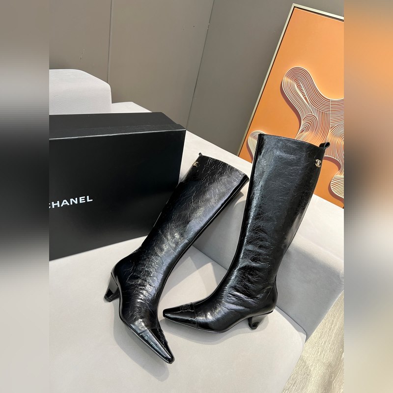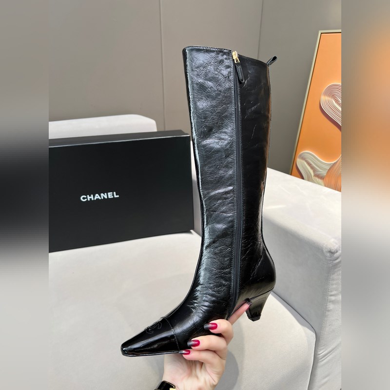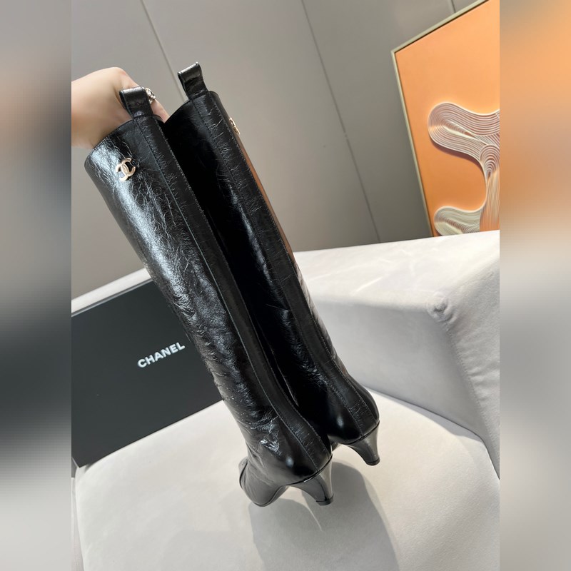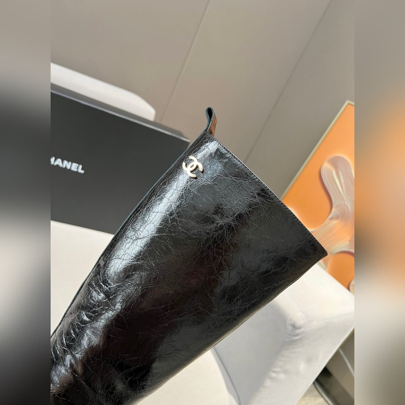 Chanel/Chanel Double C teräväkärkiset muotisaappaat, kangas: Chanelin erikoisnahka: vahattu nahka, saappaan korkeus: 16 tuumaa, vuori: lampaannahka; väri: kokonaan musta: kohokuvioitu musta. vahattu musta, koko: 5-40 (voidaan mukauttaa 41, räätälöity, ei palauteta