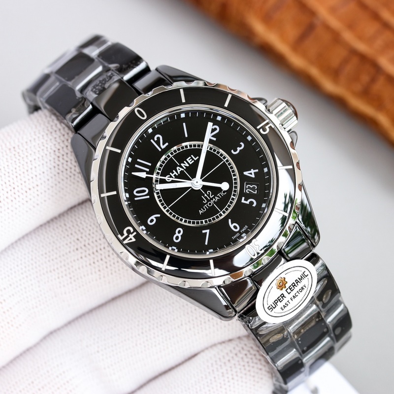 . EAST Super Ceramic – Chanel J12 Series 38 -kello, jonka halkaisija on neutraali koko 38, on helppo käyttää sekä miehille että naisille. Se on valmistettu korkeatiheyksisestä karkaistusta keraamisesta materiaalista, joka on yhdenmukainen alkuperäisen version kanssa, joka on kevyt, kulutusta kestävä, allergiaa aiheuttamaton eikä koskaan haalistu. Ulkonäköväri on lämmin kuin jade ja on äärettömän lähellä alkuperäistä versiota (erilainen kuin muiden markkinoilla olevien versioiden kellertävä väri). Varustettu Sea-Gull 2892 automaattisella mekaanisella liikkeellä, siinä on tiivis pohja ilman vikoja. Kellotaulun ammattitaito vastaa myös alkuperäistä versiota. Se on ainoa markkinoilla, joka käyttää gelatiiniliuskoja, mikä eroaa muista metalliruiskutusta käyttävistä versioista. Koko kellon rakenne on täynnä vilpittömyyttä, jopa korvat on valmistettu alkuperäisestä muotista ja tuote on täysin varustettu. Valittavana on pieniä 33 mm ja suuria 38 mm kokoja pelataksesi Chanelin mustavalkomuodilla