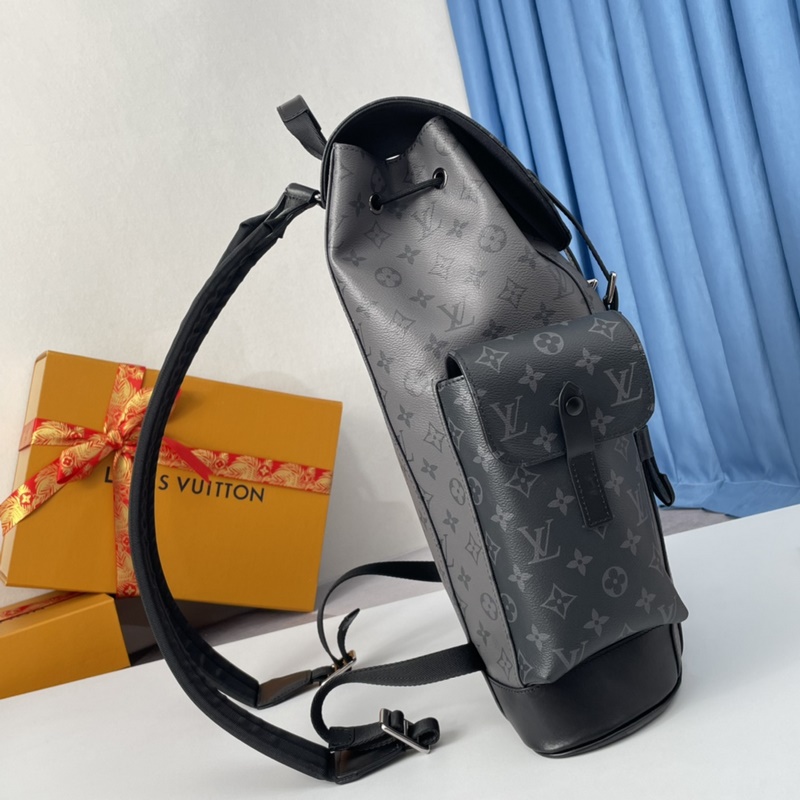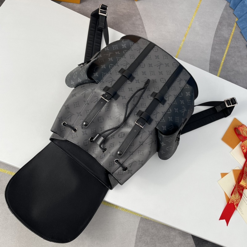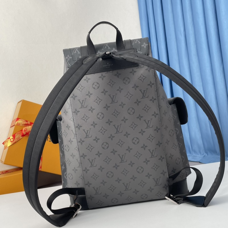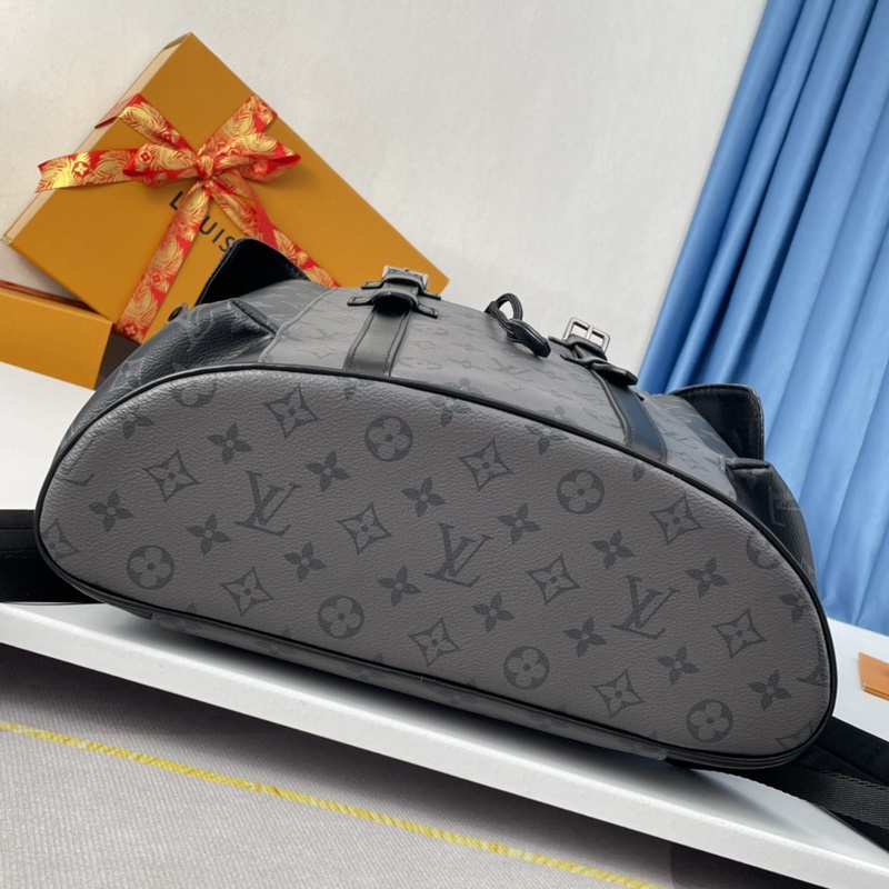 Eksklusiivisia kuvia merentakaisesta alkuperäisestä M45419 Christo Herin pienestä reppusta on tehty komeasta Monogram Eclipse -kankaasta ja Monogram Eclipse Reverse -kankaasta, ja siinä on musta nahkaverhoilu, mikä tulkitsee uudelleen vaellusreppujen hengen. Harmaan ja mustan sävyt yhdistetään hopeanvärisillä napeilla ja vetoketjuilla. Laukussa on useita taskuja ja nahkainen napeilla varustettu läppä, jotka varmistavat laukun sisällön turvallisuuden. Koko: 38×44×21 cm