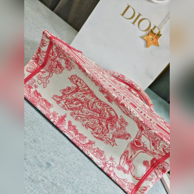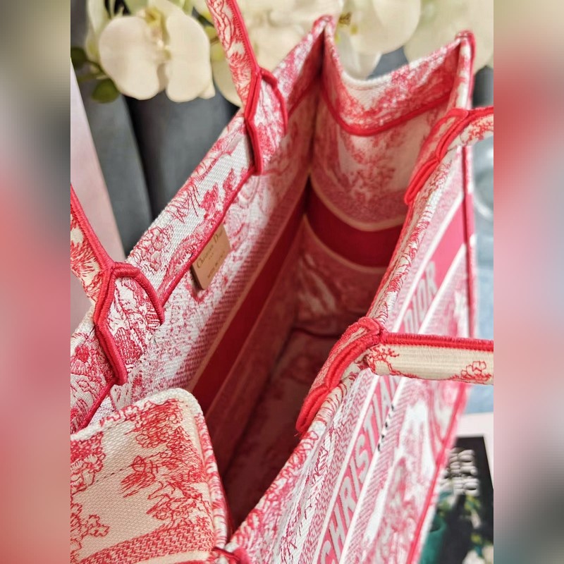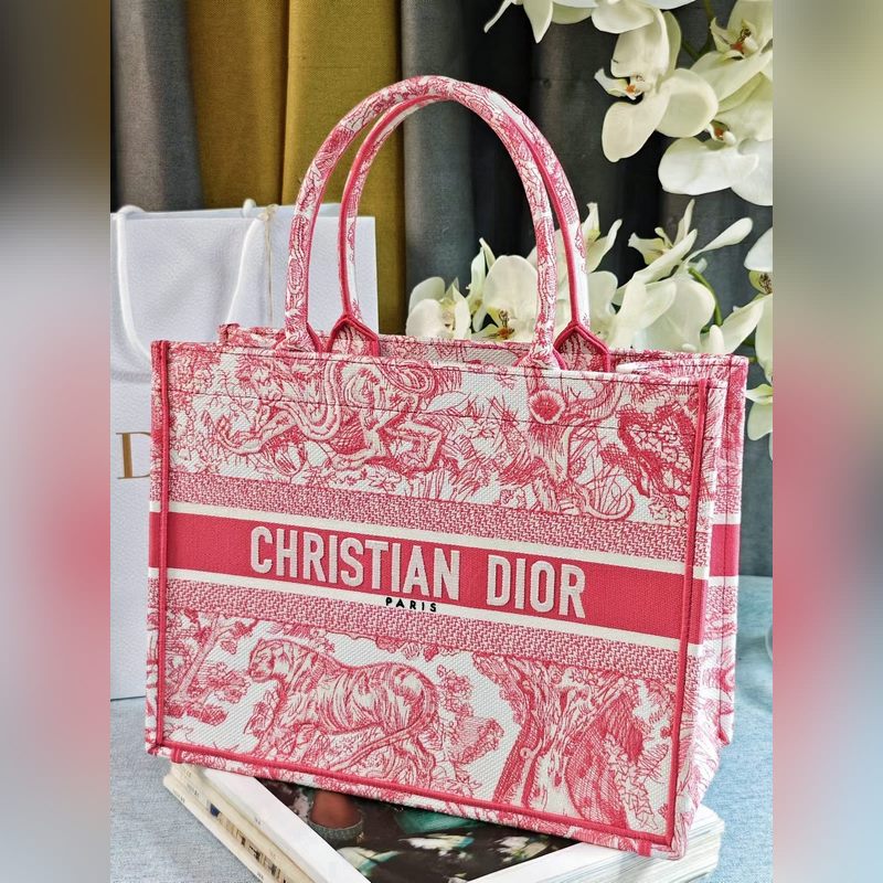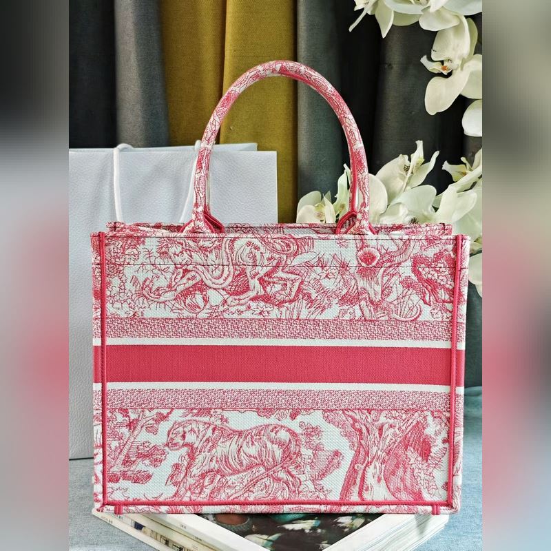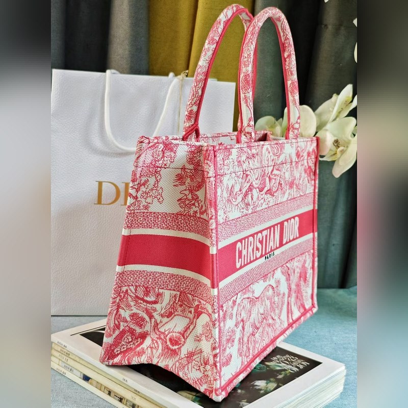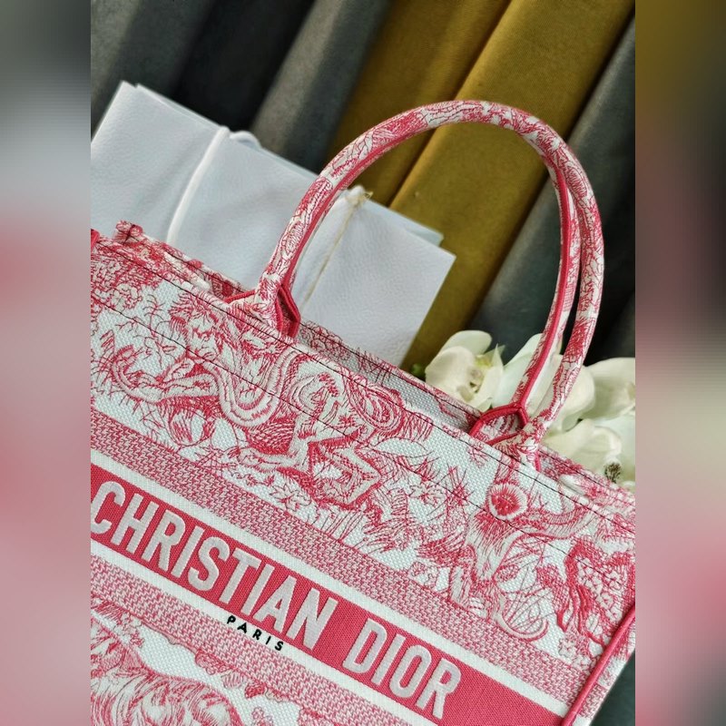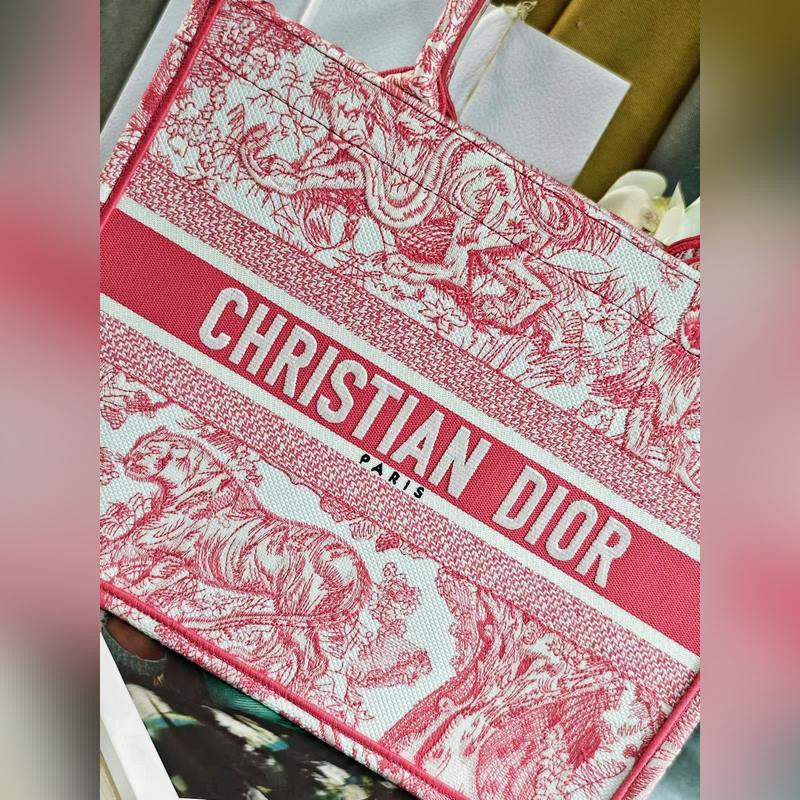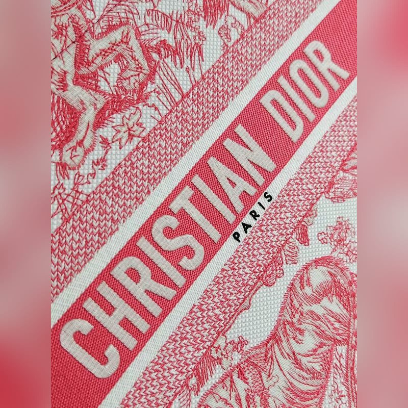 Dior Women’s Collections -kokoelman luovan johtajan Maria Grazia Chiurin suunnittelema Book Tote on Diorin estetiikkaa. Kirjailtu Reverse Jouy -printillä pionin vaaleanpunaisena ja luonnonvalkoisena. Se on uusi ote klassiseen kuvioon, käänteisillä väreillä, joihin mahtuu kaikki päivittäiset tarvikkeet. Keskikokoinen, Christian Dior Paris -logo edessä, nyökkäys Diorin savoir-faire -malliin, voidaan kantaa käsissä tai olkapäällä.