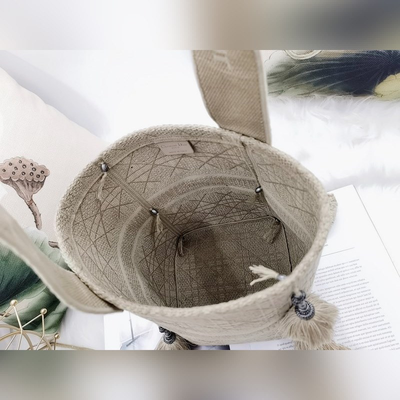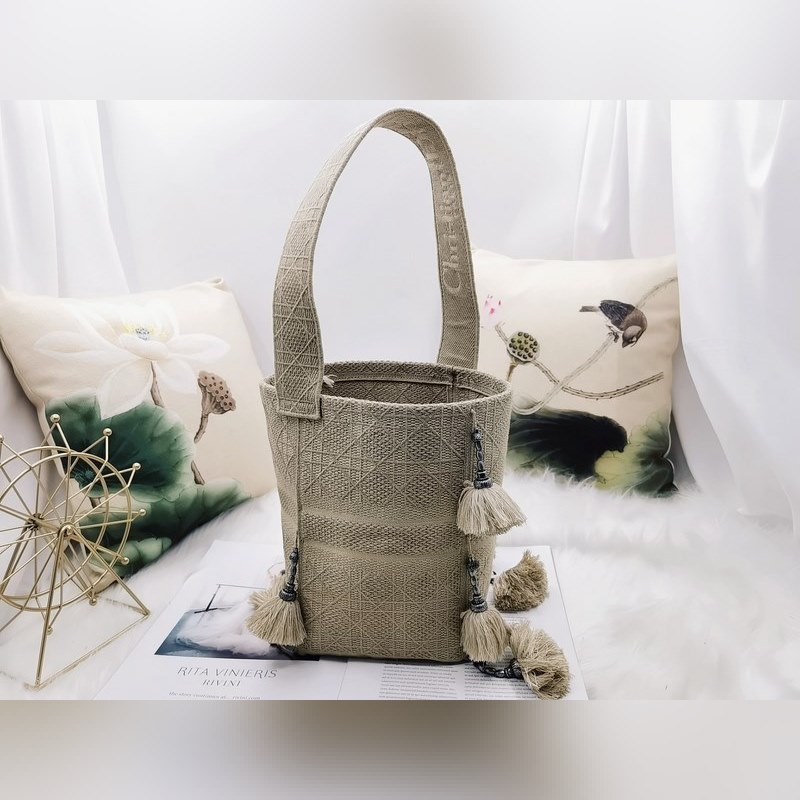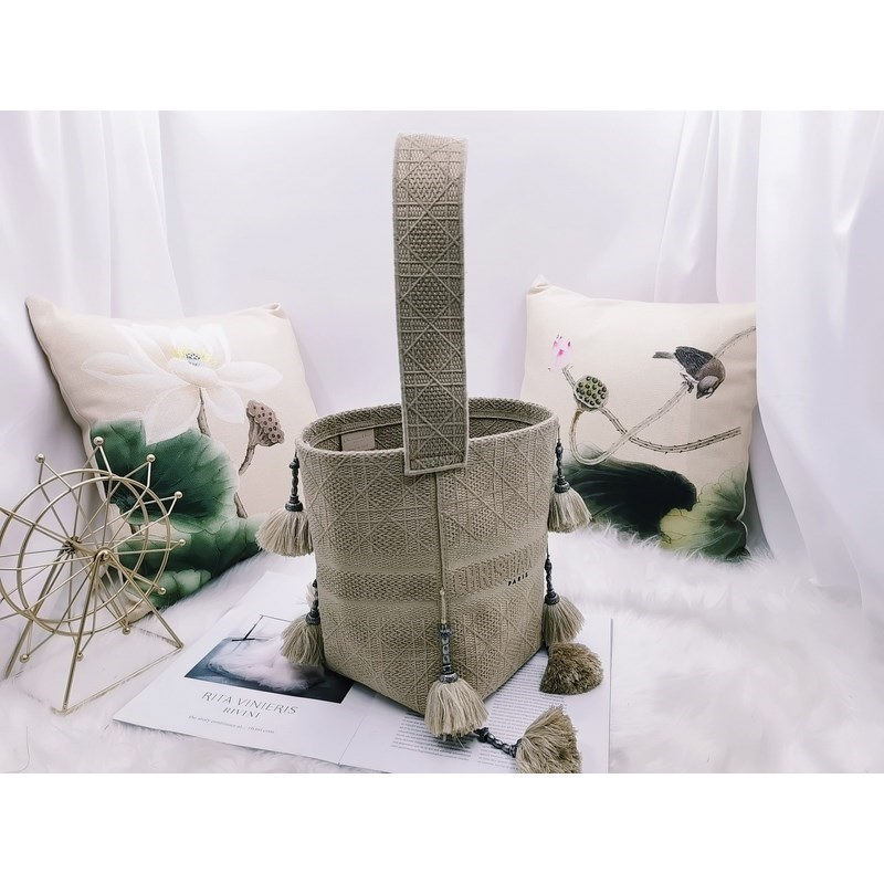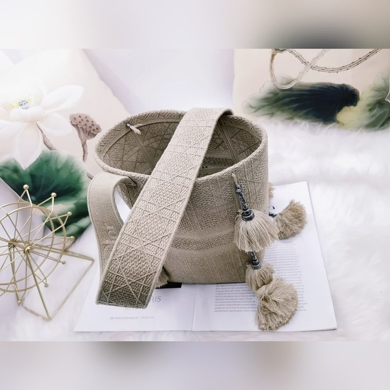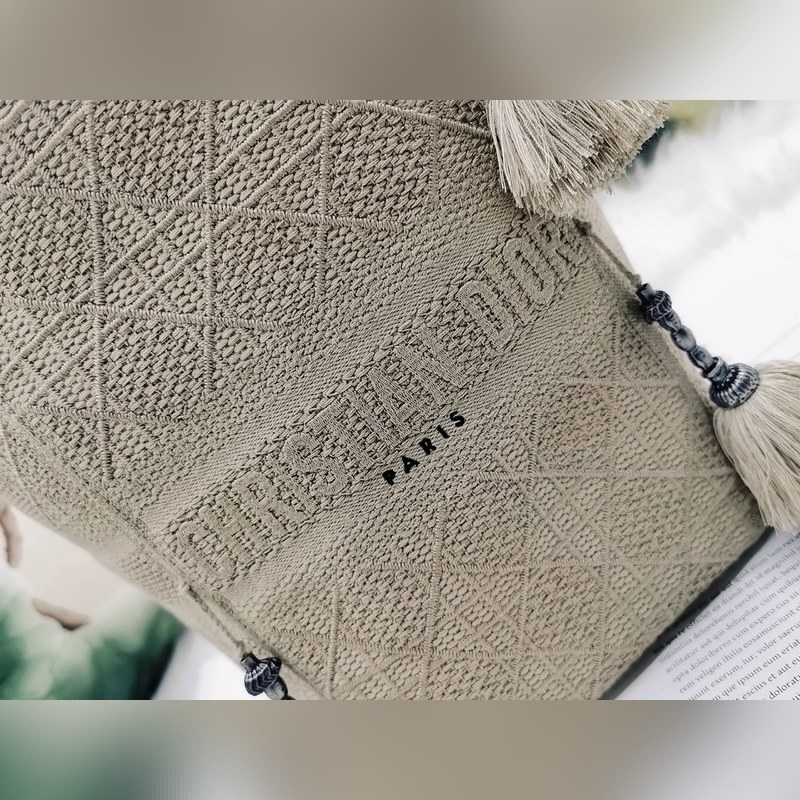Moderni ja tyylikäs, se tuli upeasti esitykseen. Se on koristeltu sekavärisillä efekteillä Dior Paisley -kuviokirjonnalla kauttaaltaan ja sinisellä “Christian Dior” -logolla edessä. Leveän olkahihnan ansiosta sitä voidaan kantaa käsissä tai olkapäällä. Käsintehty pompon koristelu lisää ketteryyttä. Pompomiin yhdistetään antiikki hopeanväriset metalliyksityiskohdat. Edessä olevaa “Christian Dior” -logoa voidaan kantaa käsissä tai olkapäällä
