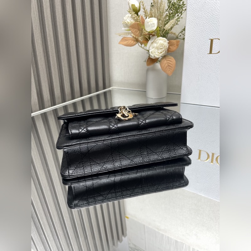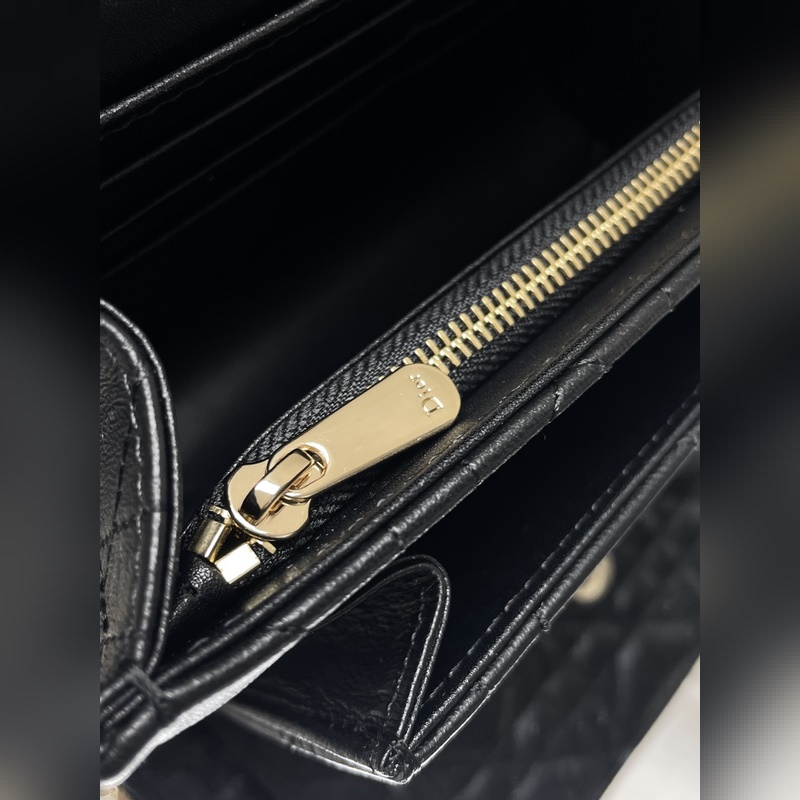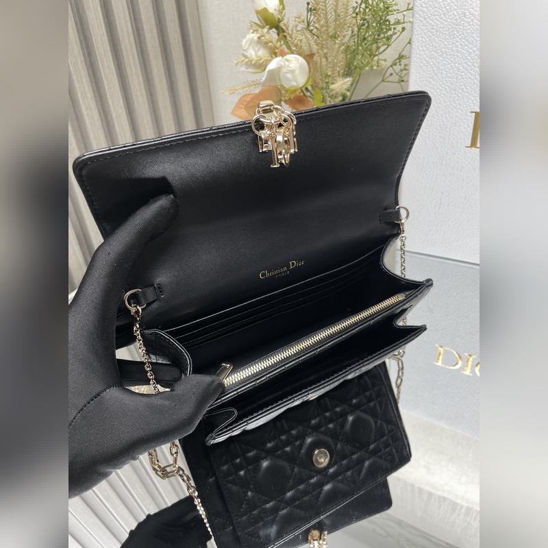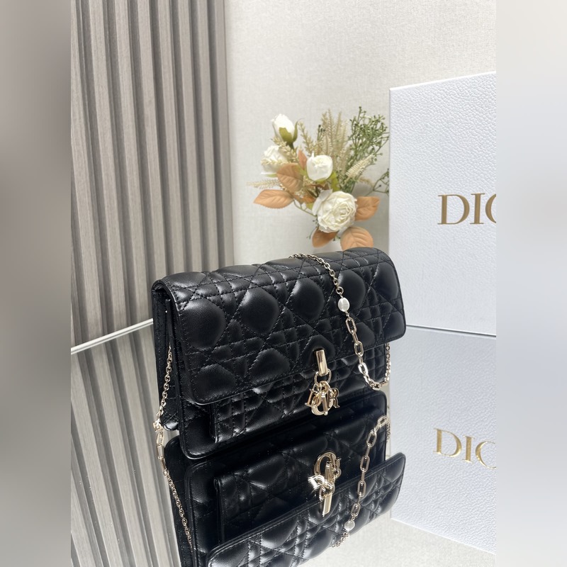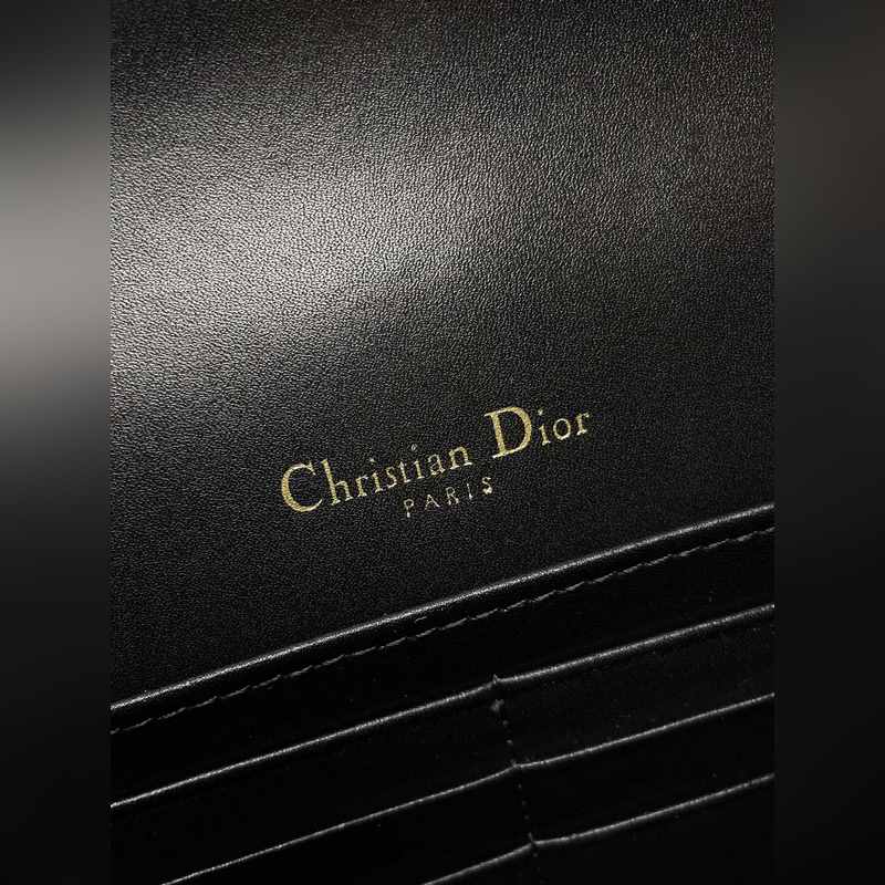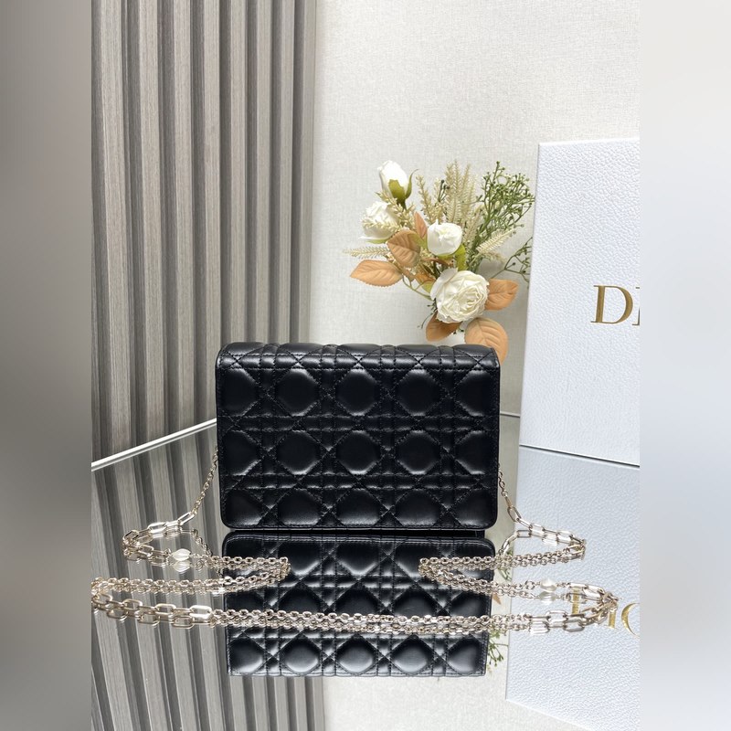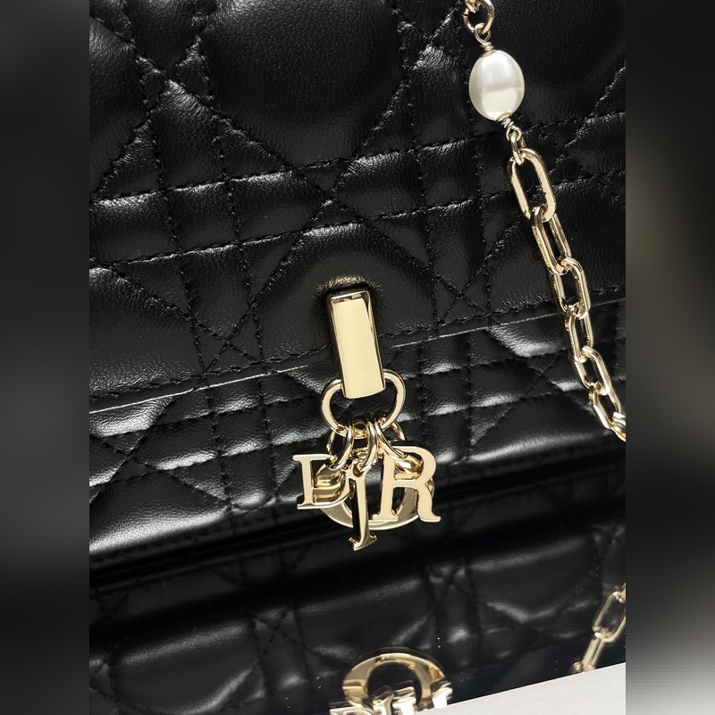 Tämä Lady Dior -kytkin on upeasti suunniteltu ja tilava. Se on valmistettu mustasta lampaannahasta, se on koristeltu cannage-ompeleilla ja koristeltu “D.I.O.R.” charmia, joka huokuu muodikasta ja klassista charmia. Moniosastoinen muotoilu on käytännöllisempi ja siihen mahtuu erilaisia päivittäisiä tarpeita. Ketju on koristeltu helmillä, mikä sopii olkapäälle tai poikkivartalolle.