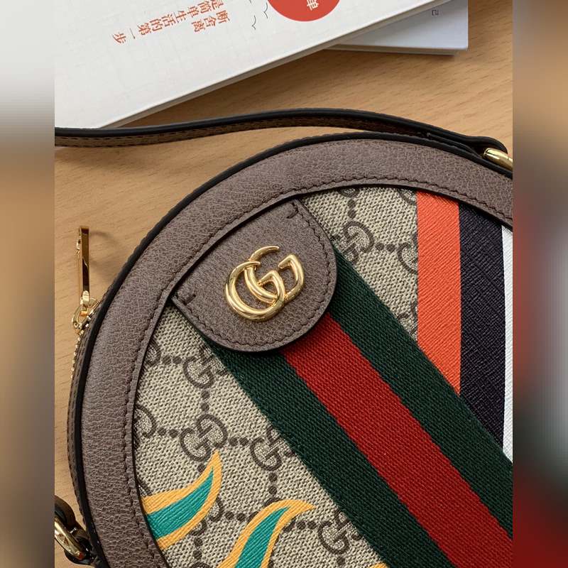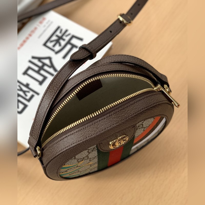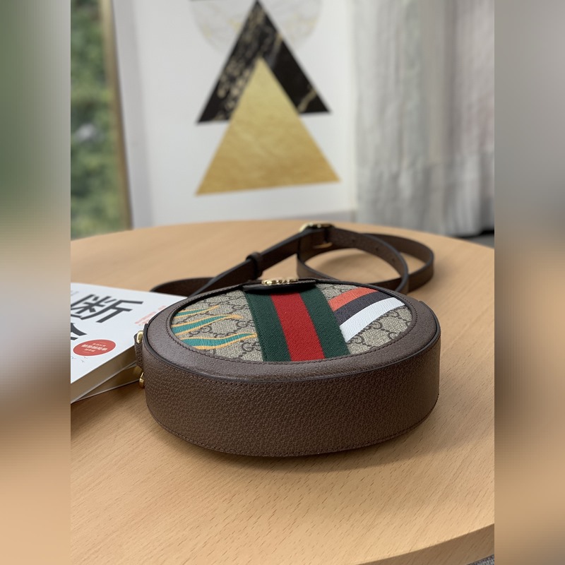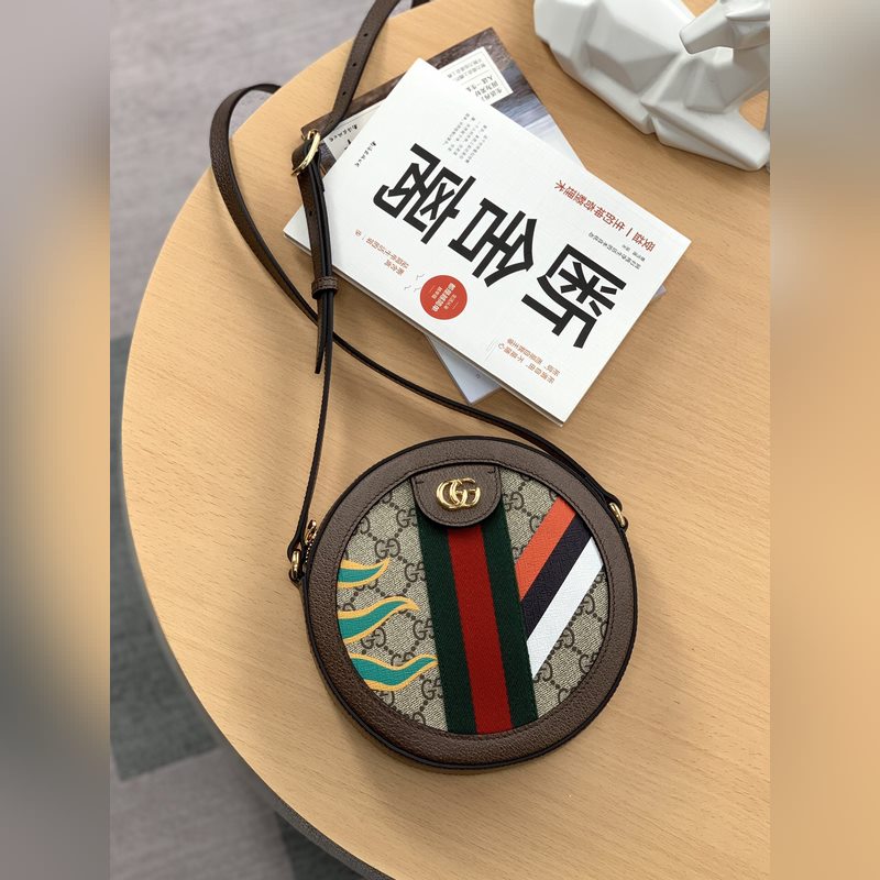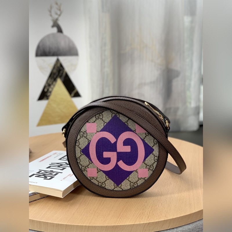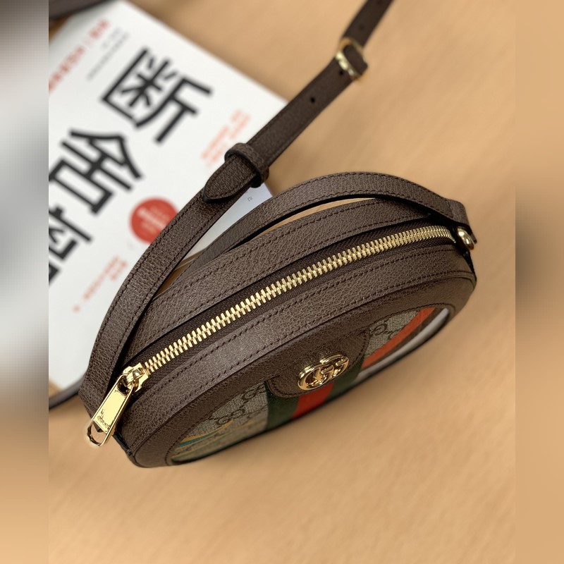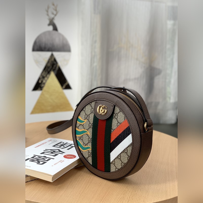 Pyöreiden olkalaukkujen sarja, värikkäillä ja kirkkailla geometrisilla kuvioilla – raidat ja liekkiprintit, pyöreät käsilaukut ketjun olkahihnoilla, ikoniset punaiset ja vihreät nauhat kaksinkertaisilla koristeellisilla vetoketjusoljilla, mallinumero: 574978 ruskea silkkipaino, koko 19x19x5, numero: HY9618850