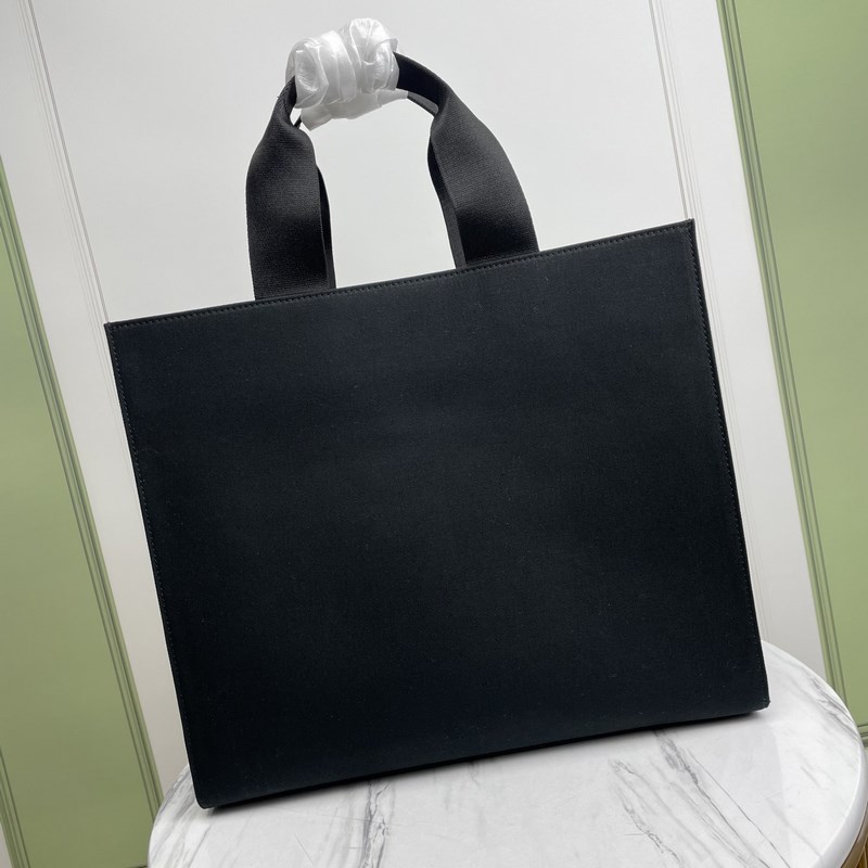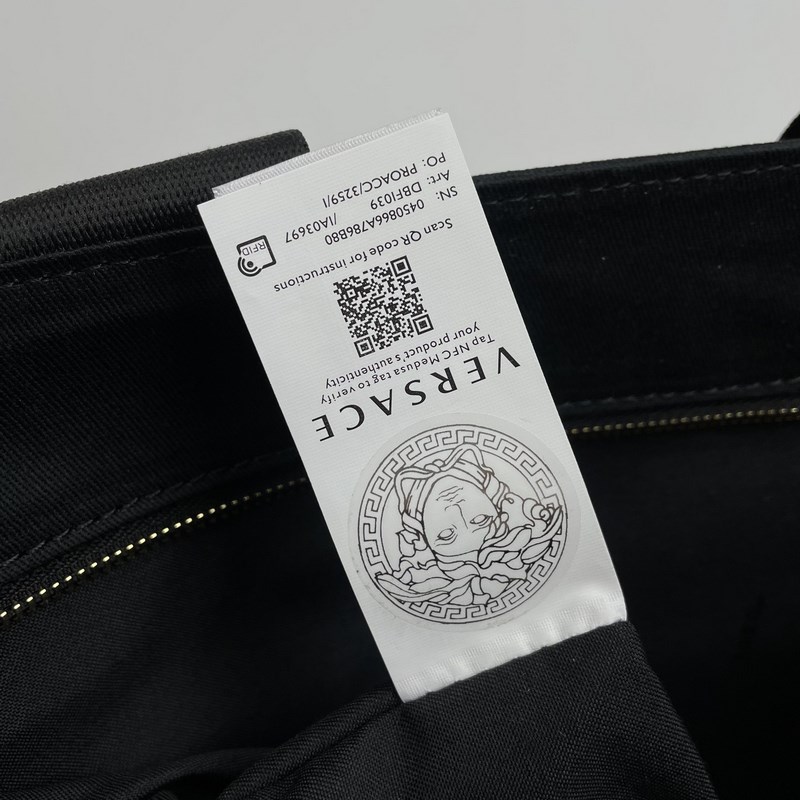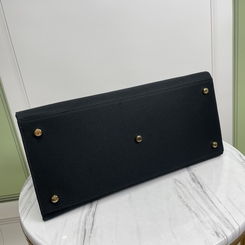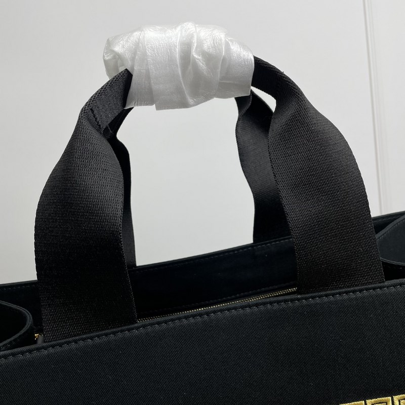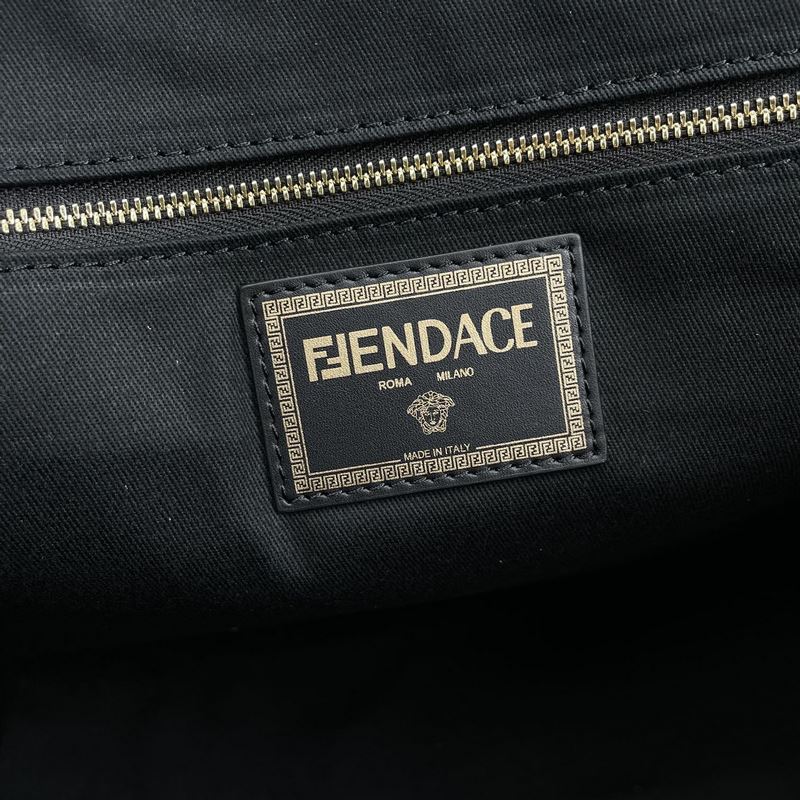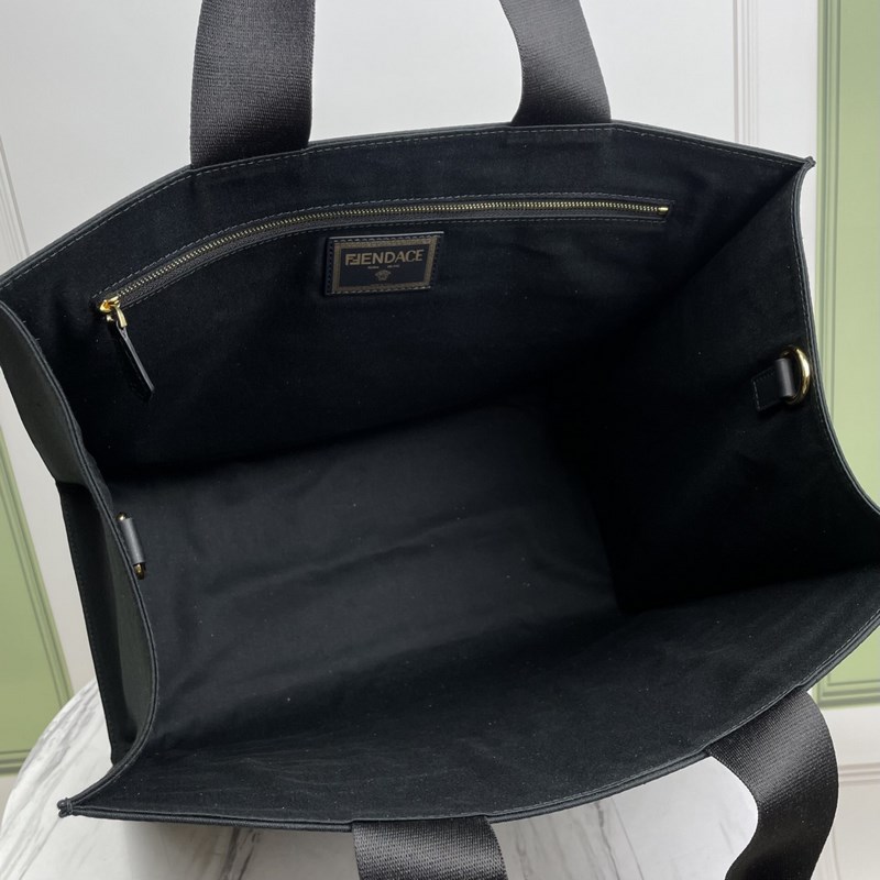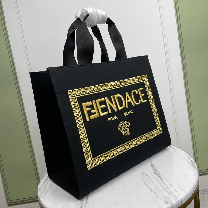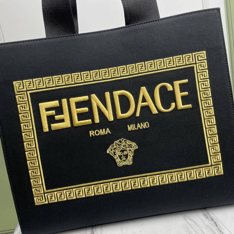 Stor väska, gjord av svart canvas. Guldtrådsbroderi presenterar Fendace-logotypen, symbolen för det kreativa samarbetet mellan Fendi och Versace. Svarta läderdetaljer, innerficka med dragkedja och guldmetalldetaljer. Utrustad med handtag och avtagbar axelrem, kan bäras för hand eller på axeln.
