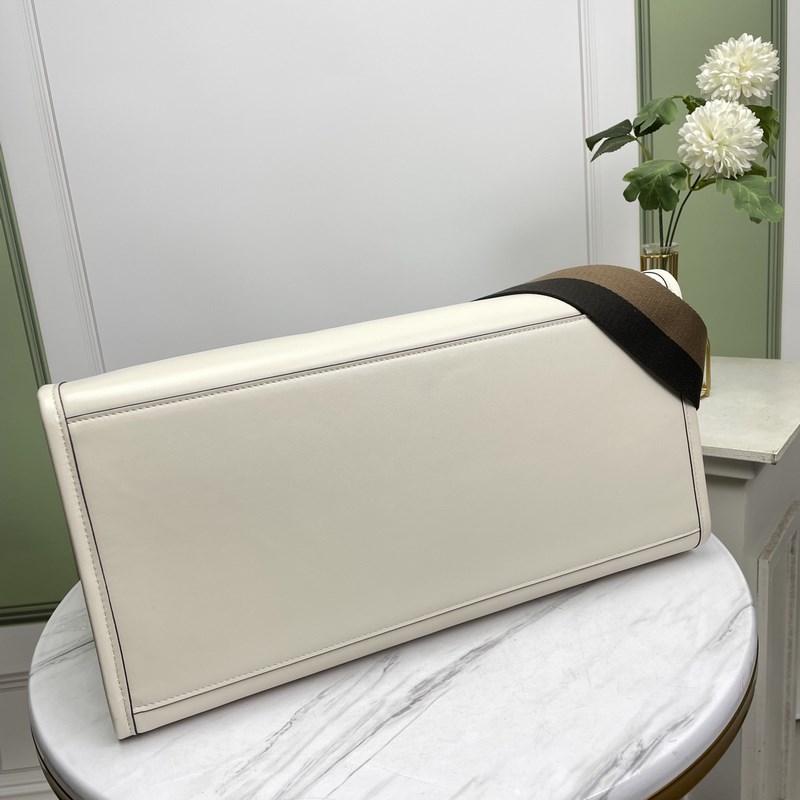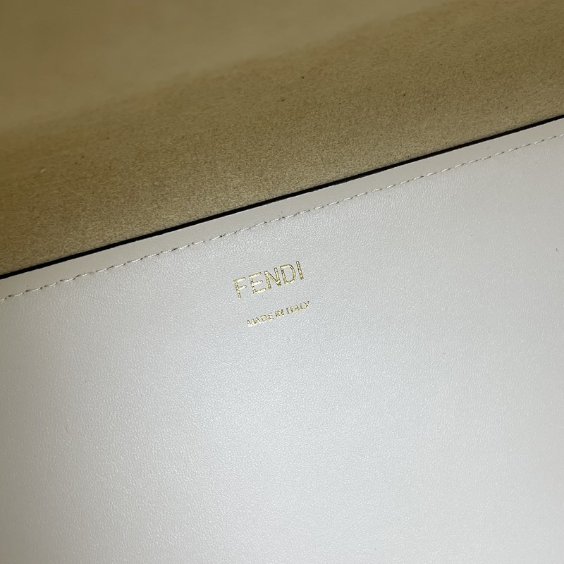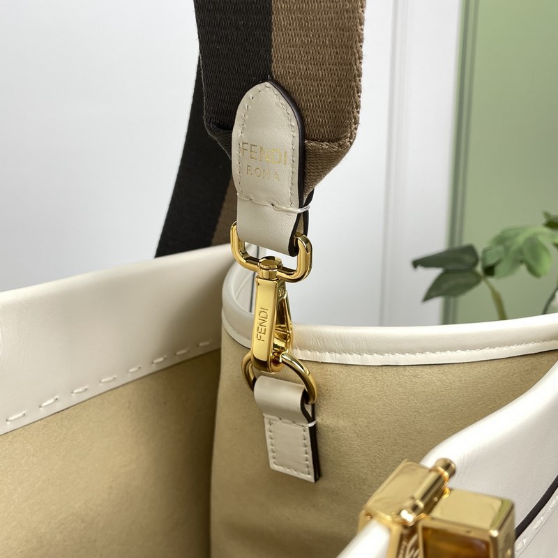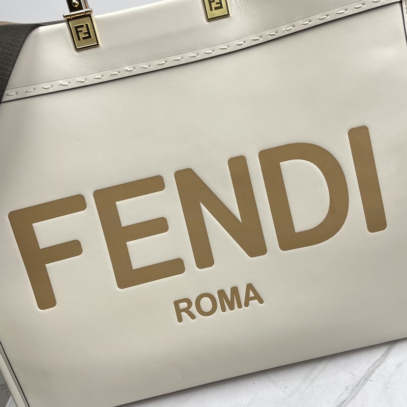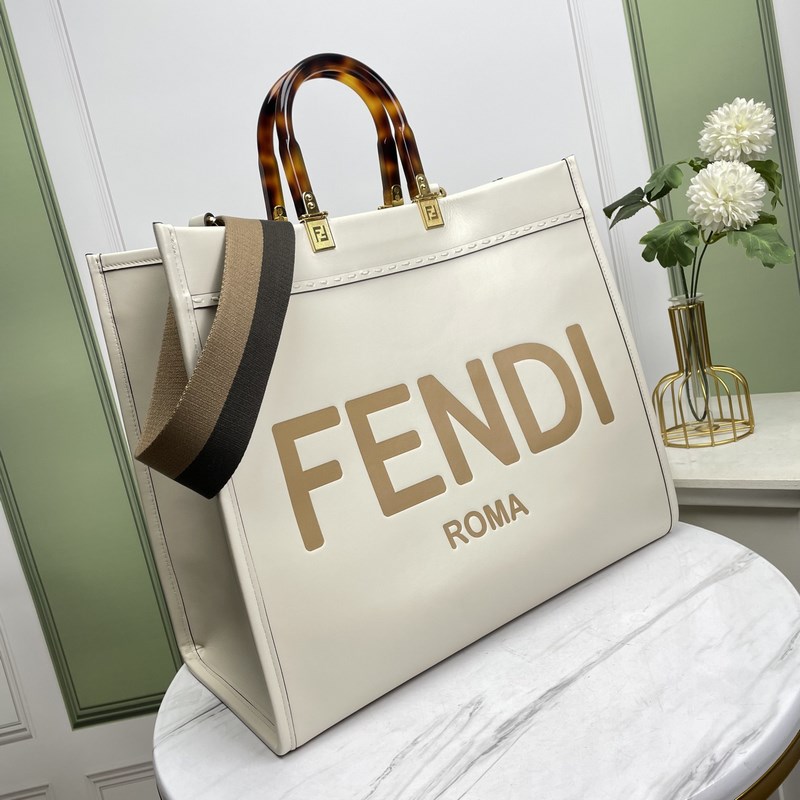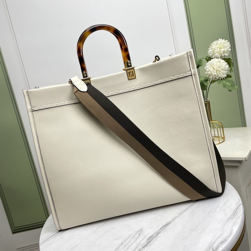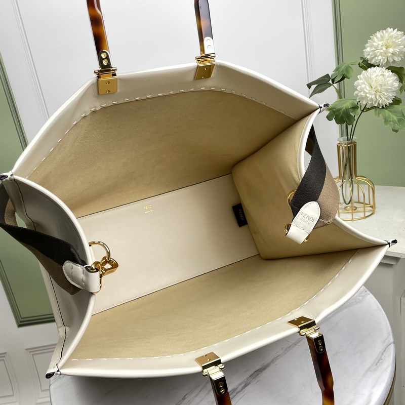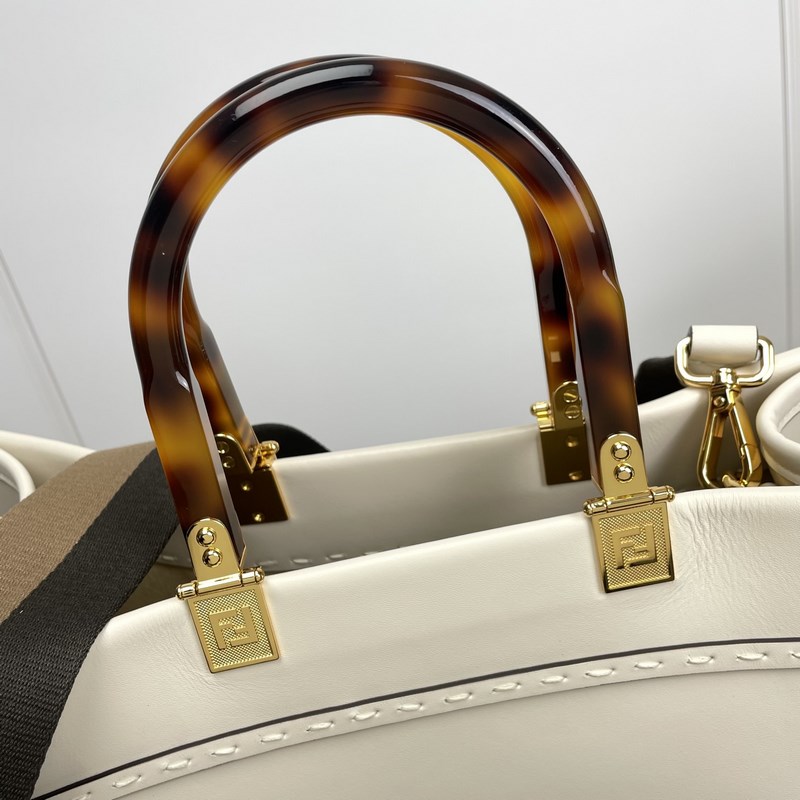 FEND1TOTE Tygväska Dubbla handtag, sköldpaddsskal hårt plexiglas, vitt lädermaterial dekorerat med varmstansat FEND1 ROMA mönster, brunt Alcantara-färgad metallkant, guldkant i FF-färgad metall. läder Storlek: 40*35*21,5cm
