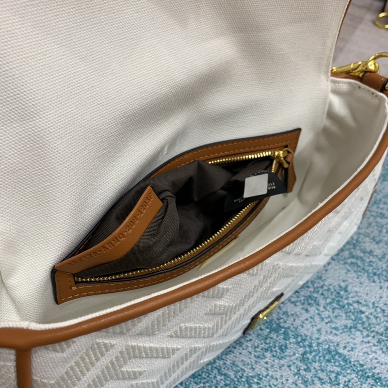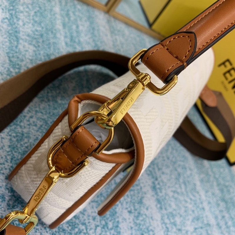 Vuorattu vetoketjullisella taskulla Varustettu irrotettavalla olkahihnalla, voidaan kuljettaa käsin tai pukeutua poikkivartaloon Beige kangas brodeeratulla FF-kuviolla Koristeltu kullanruskeilla nahkayksityiskohtillaPequin kangas olkahihna. 26cm nro: BD96181200
