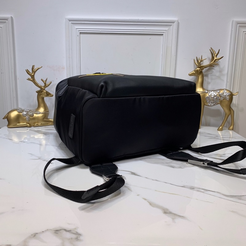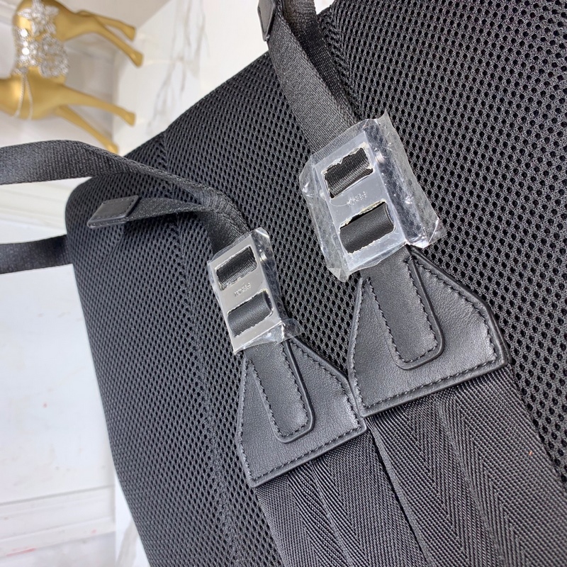 Takaosa on valmistettu hengittävästä high-tech verkkokankaasta, olkahihna on säädettävä, kaksinkertainen vetoketju, sisäänrakennettu tasku on mustaa nylonia, nahkatasku on koristeltu kohokuvioiduilla applikaatioilla ja metallipinnoilla, metallin muotoiset silmät ja metalliset nastat. 33*14*39cm. Numero: BD96181150