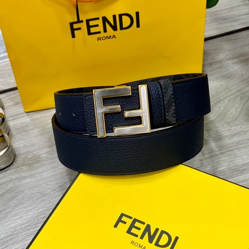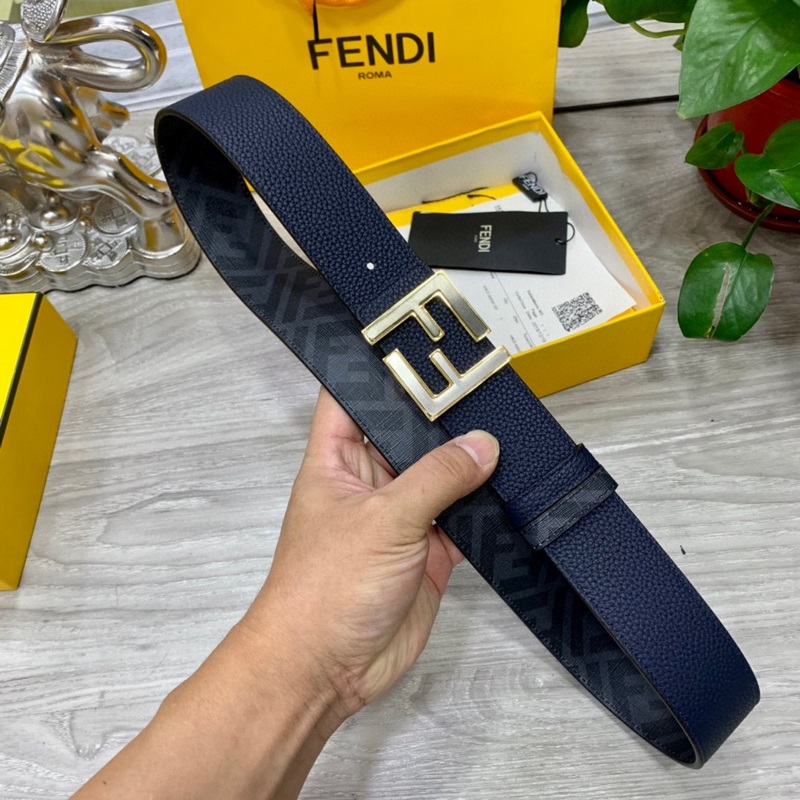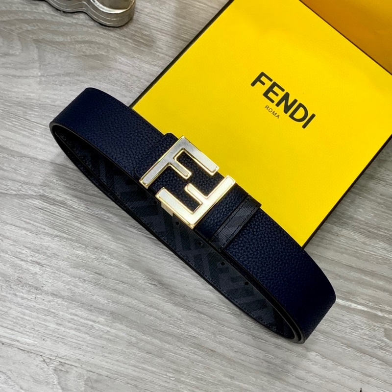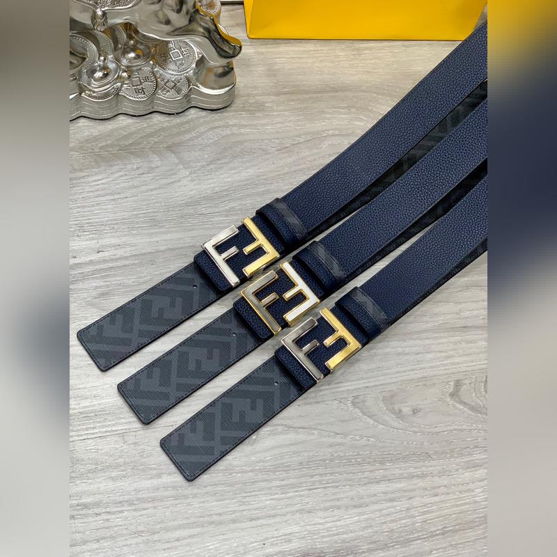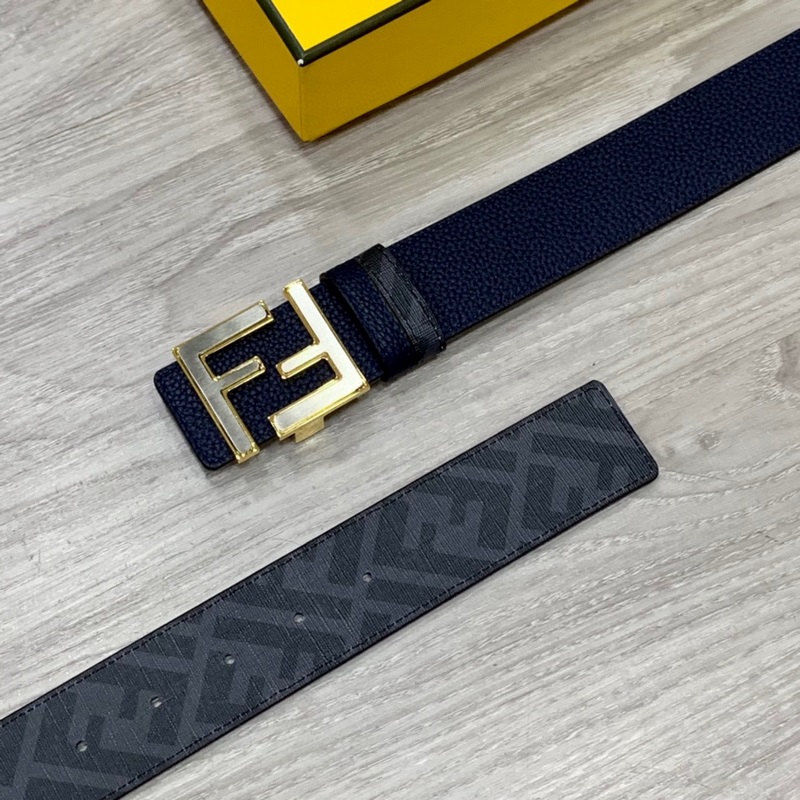 FENDI vastatyyli 4,0 cm leveä kaksisilmukkainen käännettävä vyö FF solki Sininen Cuoio Romano -naha Selkäkangas tupakankeltaisella ja mustalla FF-kuvio Musta emalimetalliviimeistely Muodikas ja klassinen All-match -tyyli