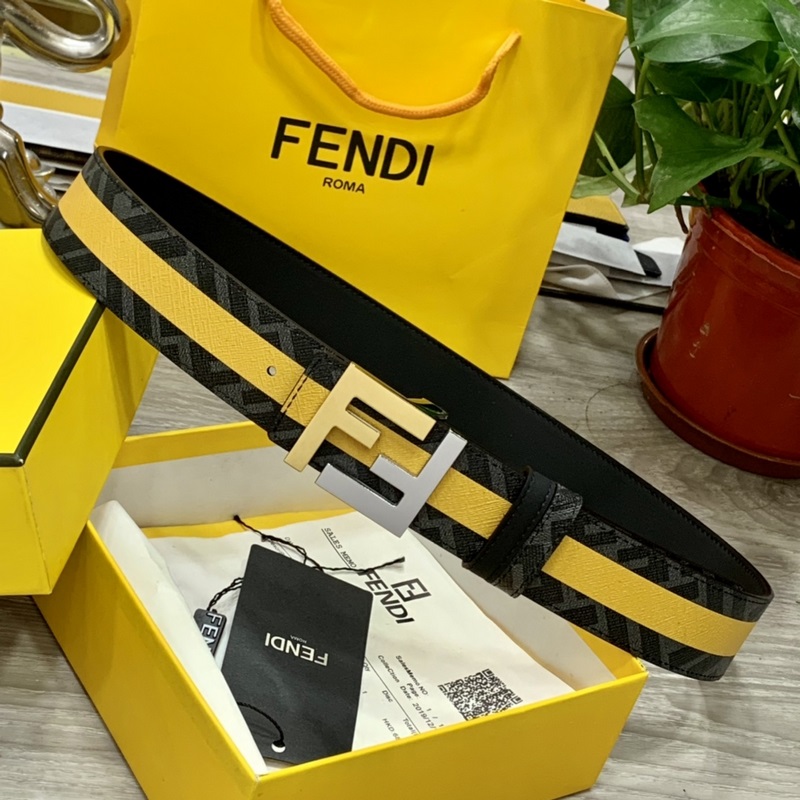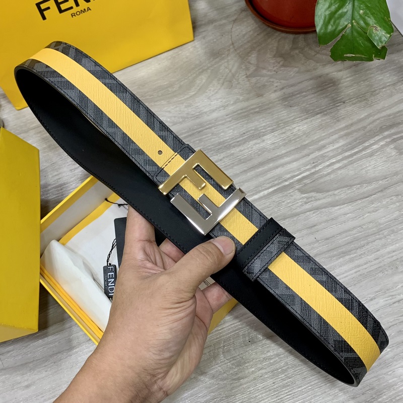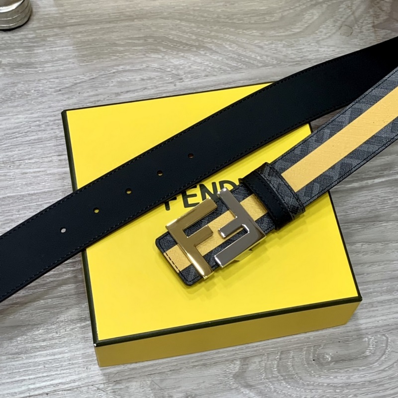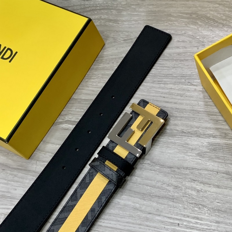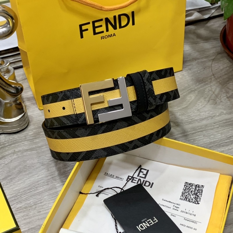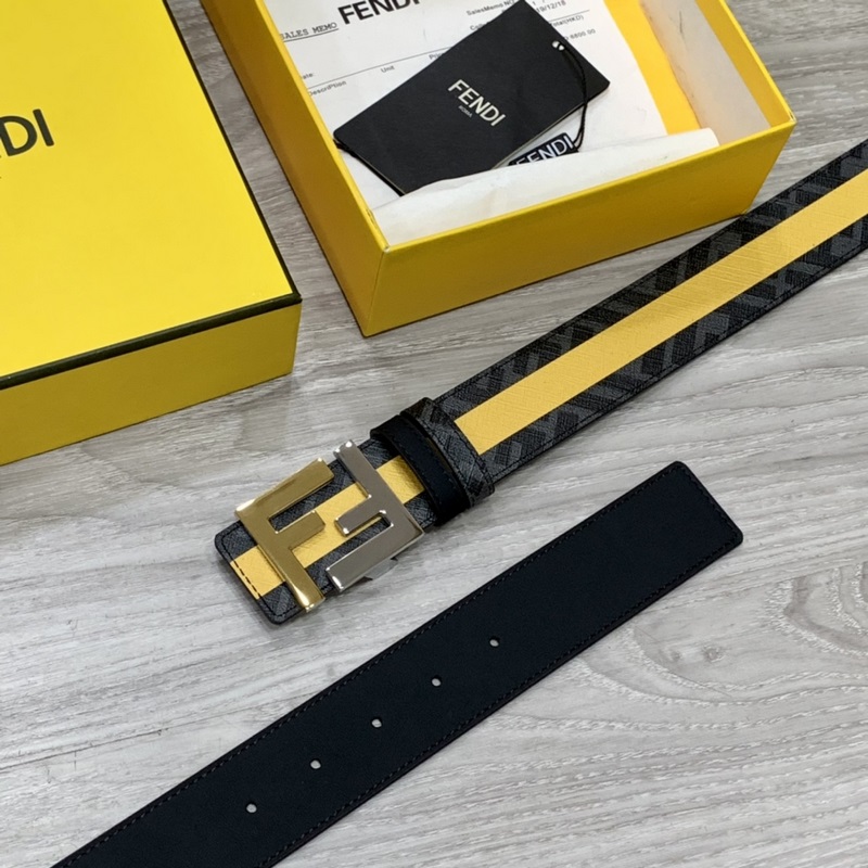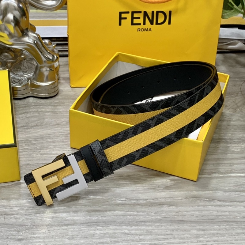 FENDI vastatyyli 4,0 cm leveä kaksisilmukkainen käännettävä vyö FF-solki Musta Cuoio Romano nahkamateriaali Tupakankeltainen ja musta FF-kuvio kääntöpuolella Neliönmuotoinen timanttimetalliviimeistely Muodikas ja klassinen All-match-tyyli