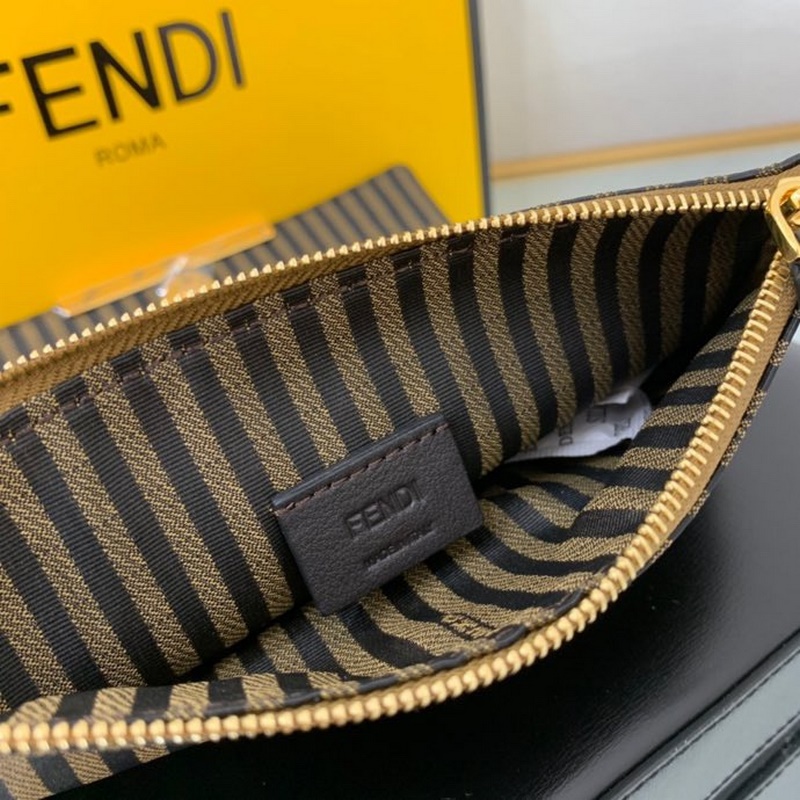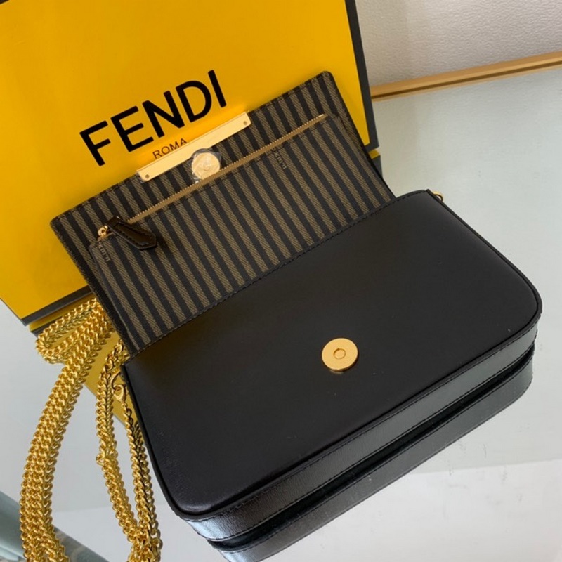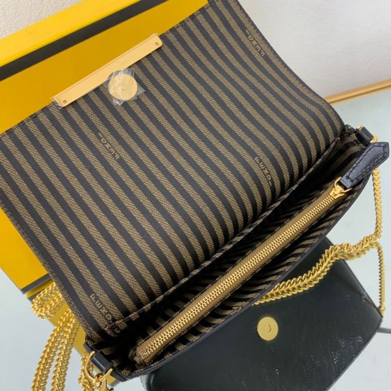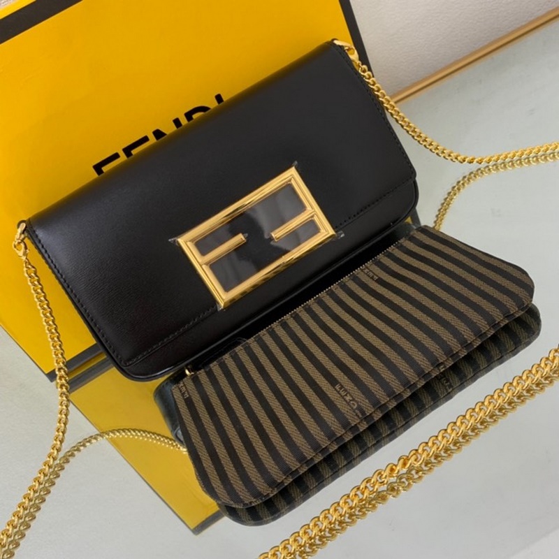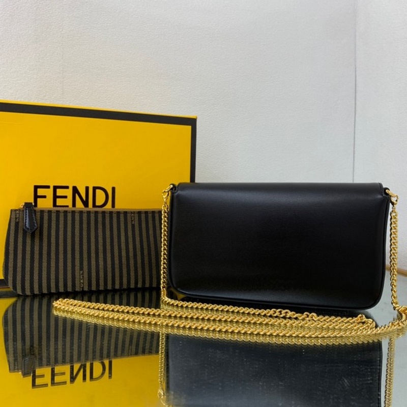 Sisustettu metallisella FF-koristeläpällä ja nepparikiinnikkeellä Kangastausta ja litteä tasku irrotettavalla vetoketjulla Kangassisätasku Kultaviimeistellyt metalliosat irrotettavalla ketjun olkahihnalla voidaan pitää kädessä tai olkapäällä Koko: 21,5*3*13cm No.8:16061.