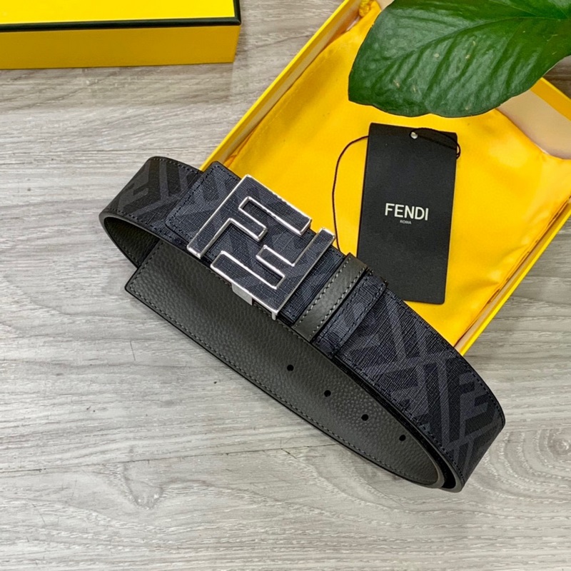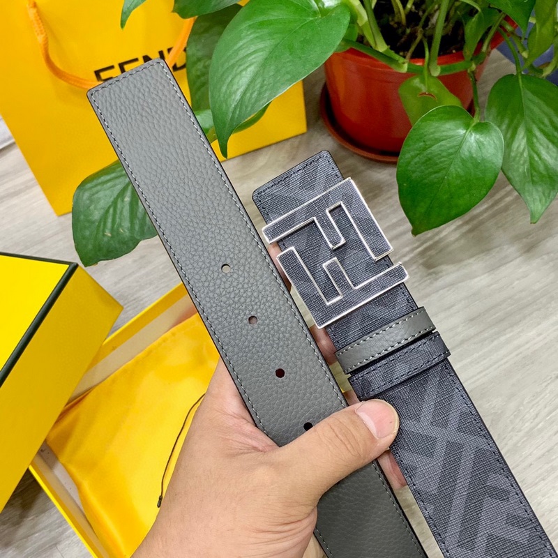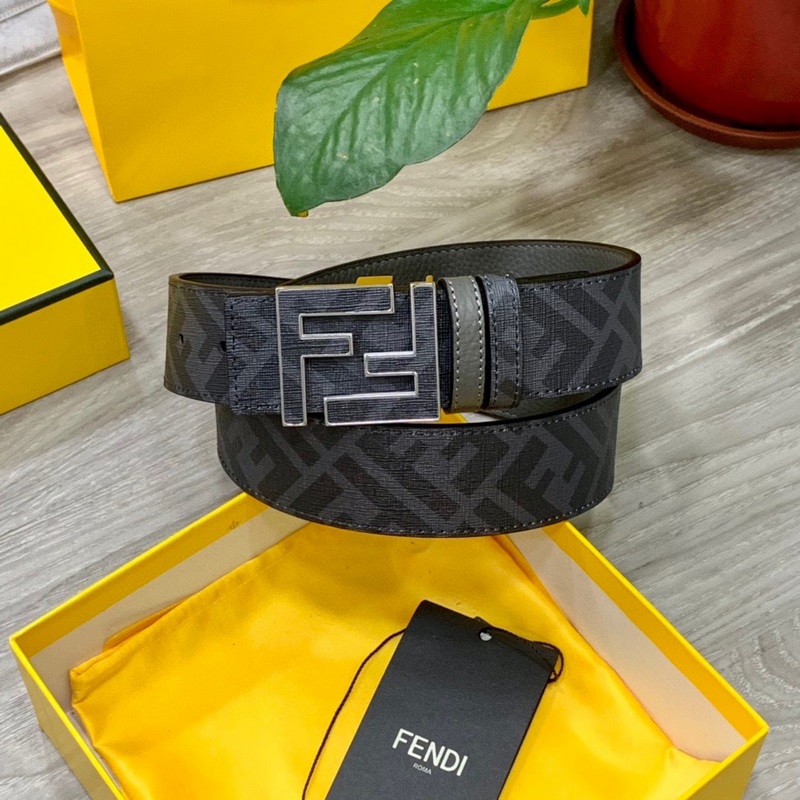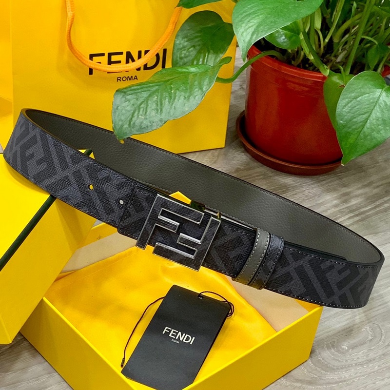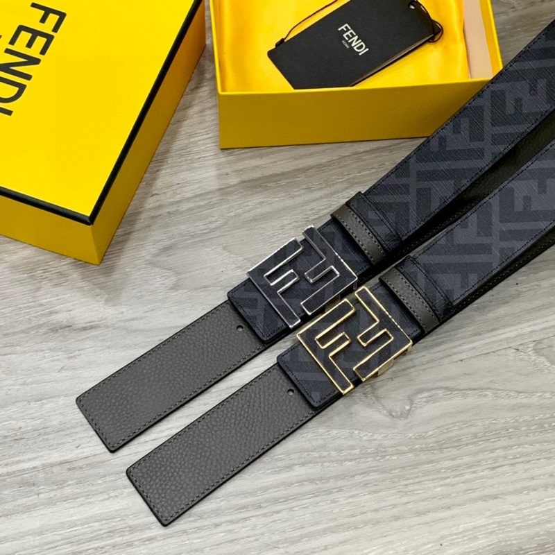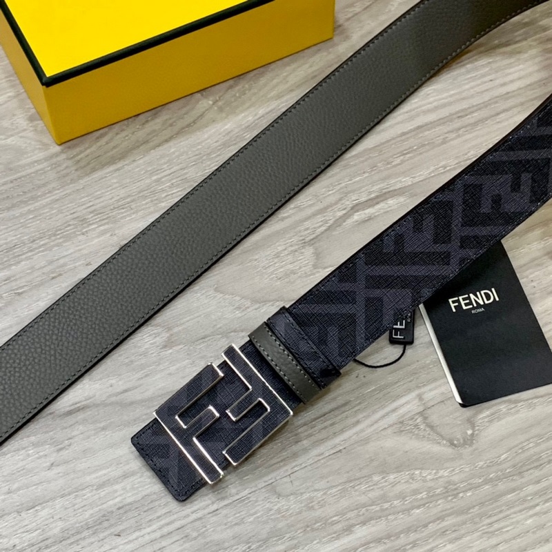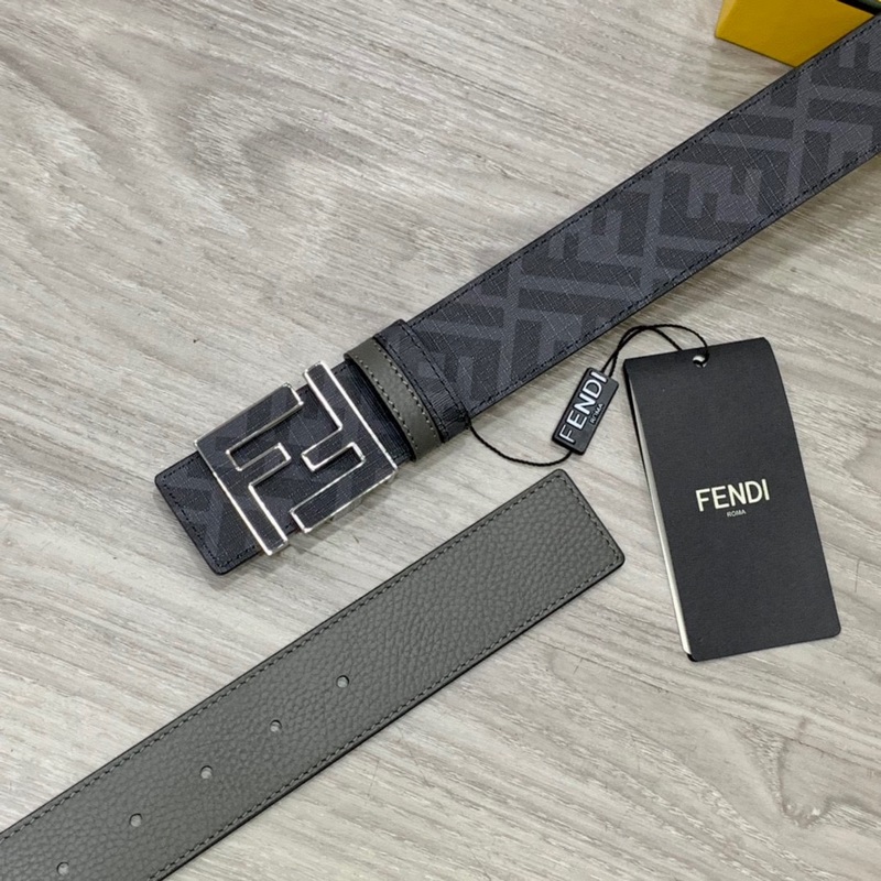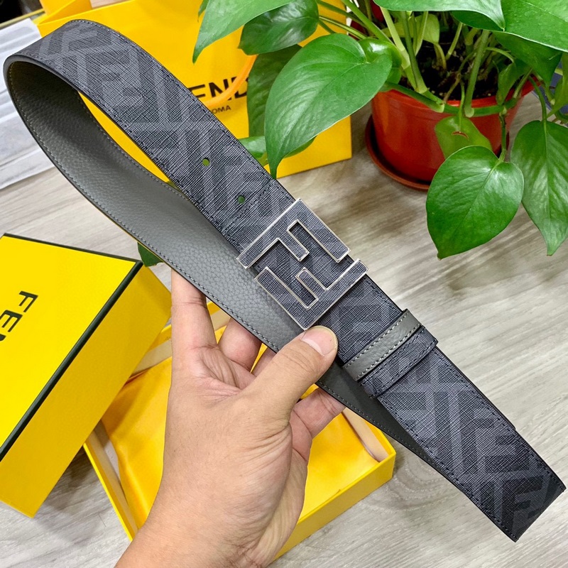 FENDI vastatyyli 4,0 cm leveä kaksisilmukkainen käännettävä vyö FF solki Musta Cuoio Romano nahkamateriaali Tupakanharmaa ja musta FF-kuvio kääntöpuolella Musta emalimetalliviimeistely Muodikas ja klassinen Monipuolinen tyyli