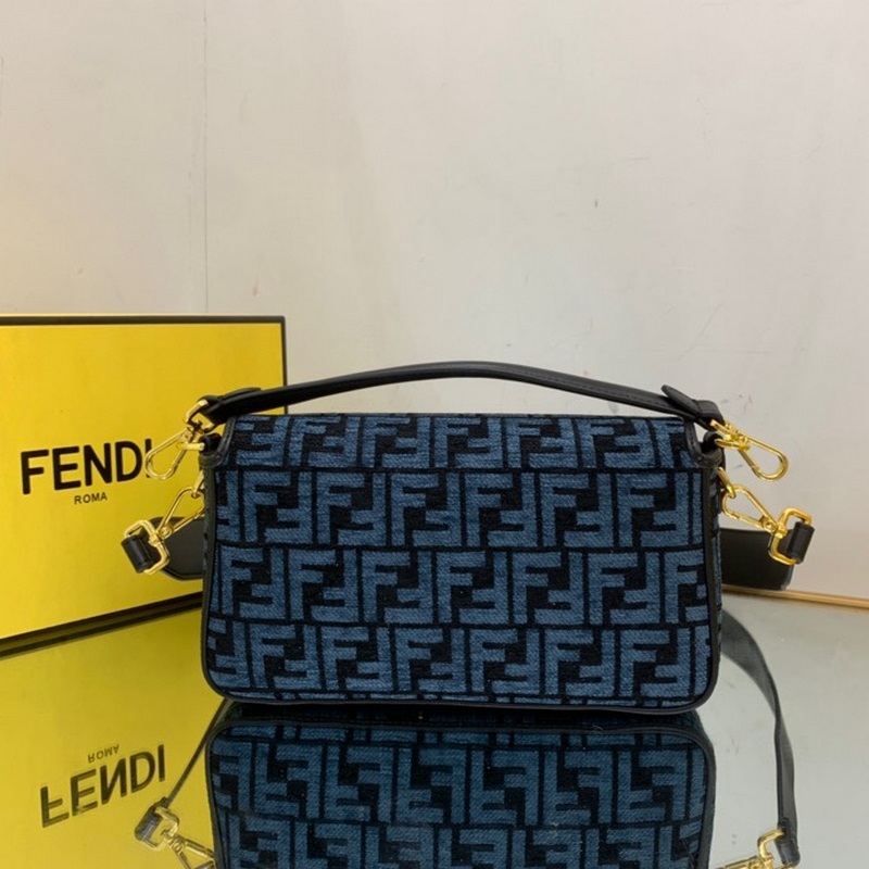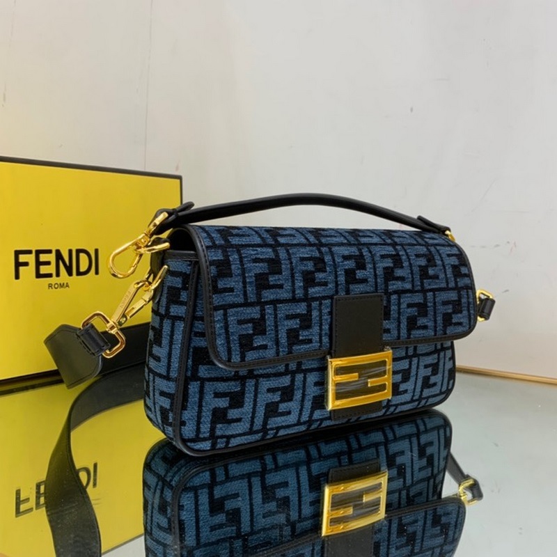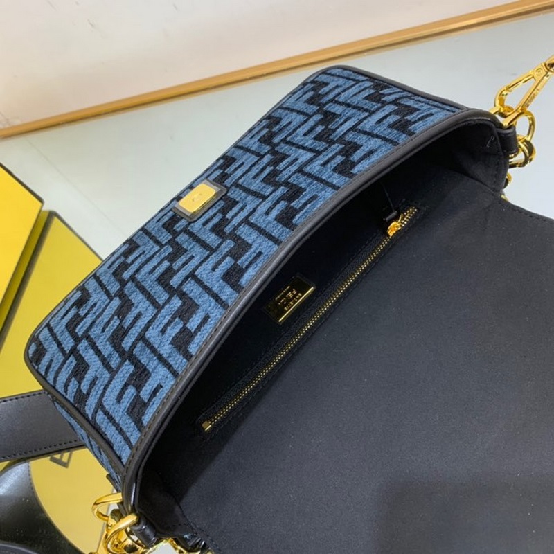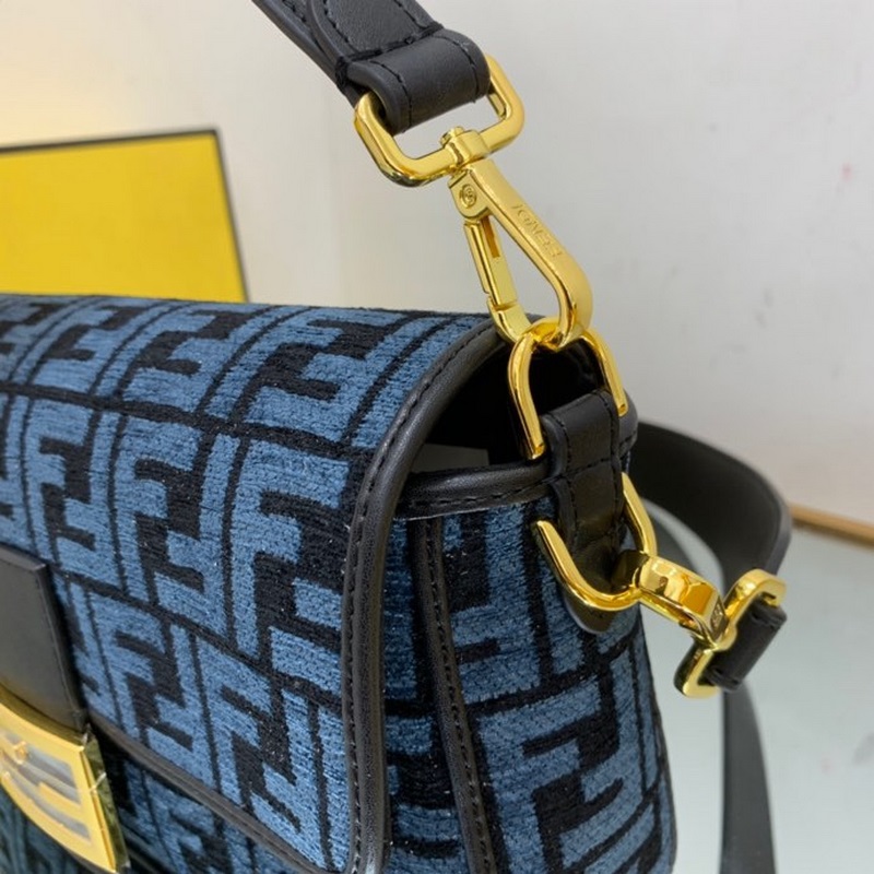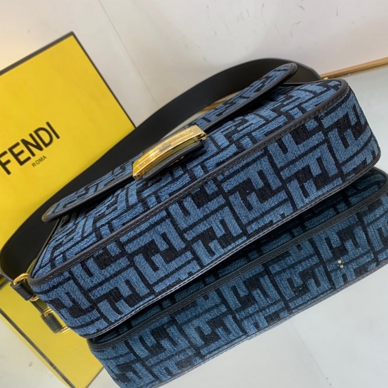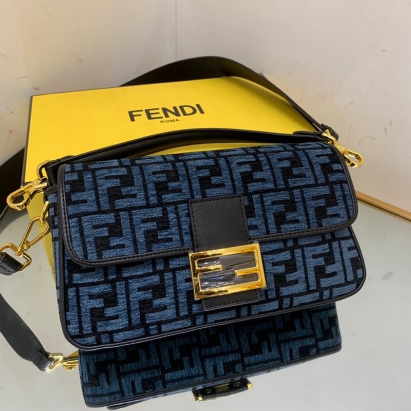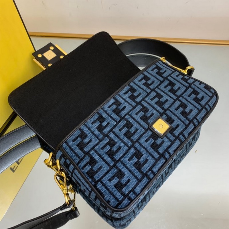 Keskikokoinen käsilaukku chenilleä, jossa sininen FF-brokaadikuvio. Koristeltu sävy-sävyllä nahkayksityiskohtiin ja koristeltu FF-soljella. Etuläppä, magneettilukko, mokkanahkavuorella varustettu sisätasku ja vetoketjutasku, vintage-kultainen laitteisto. Laukussa on irrotettava nahkainen kahva ja olkahihna käsi-, olka- tai crossbody-käyttöön. Koko 27*6*15cm Style 8BR sininen mokka