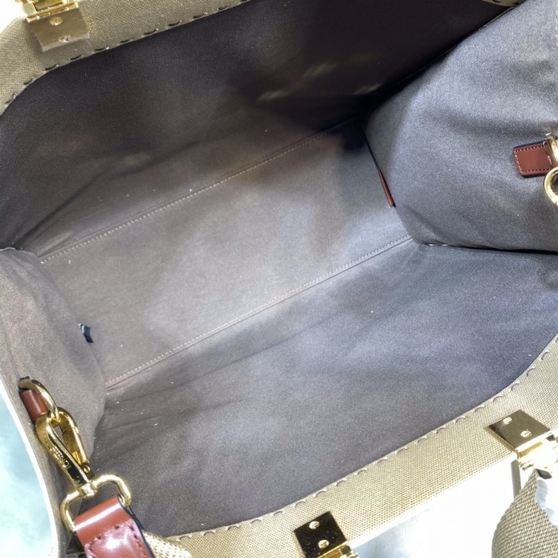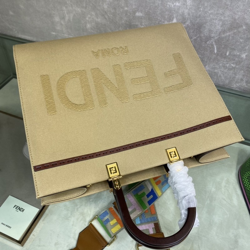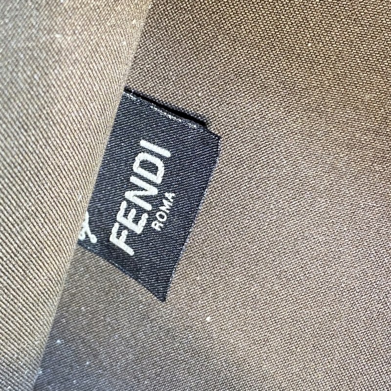 Koristus samanvärisellä “FENDI R·MA” -kuvioidulla brodeerauksella + kovat nahkakahvat Tilavat sisäosastot, ruskeat nahkayksityiskohdat ja kultaiset metalliosat Mukana kahvat ja irrotettava kangasolkahihna – käsi/olkapää