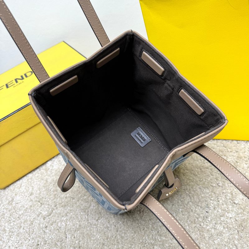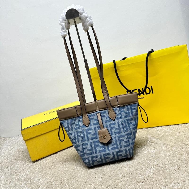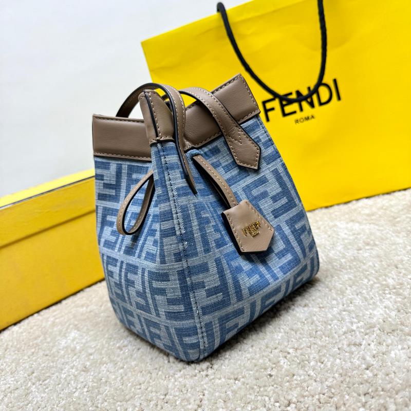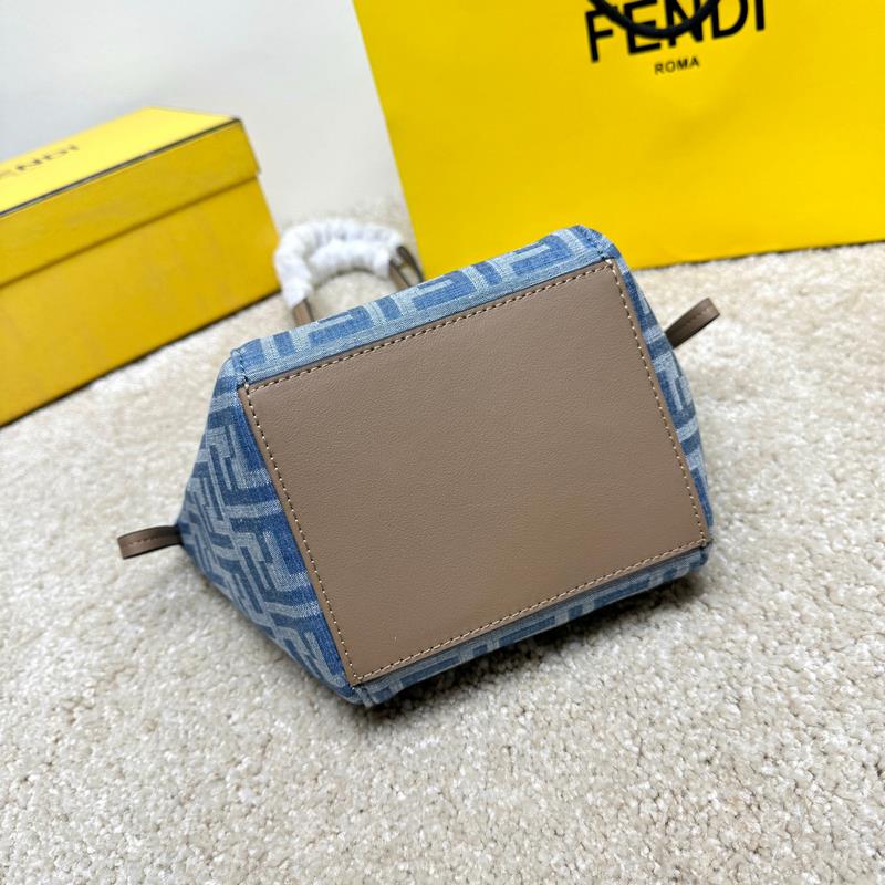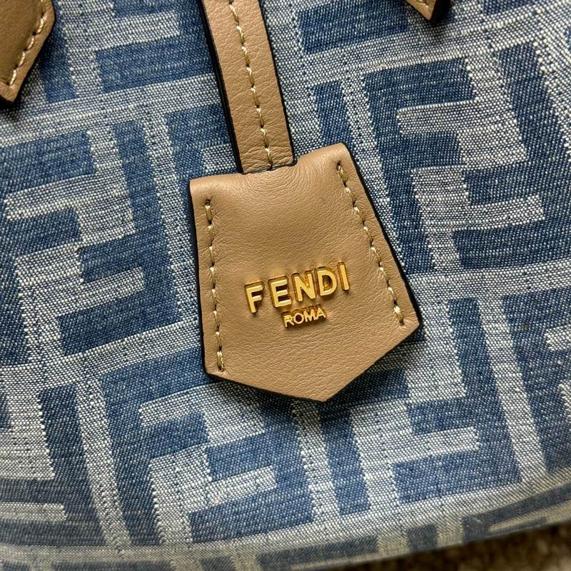 Medium Origami -laukku farkkumaista vaaleansinistä kangasta, jossa FF-kuvio. Tämä tyyli korostaa FENDIN kaksinaisuutta ja luovuutta sen innovatiivisella, muunnettavissa olevalla muotoilulla: siinä on joustava mekanismi, joka koostuu kahdeksasta magneettisoljesta, jotka voidaan taittaa origami-tyyliseksi ämpärilaukuksi. Kun magneetit ovat vetäytyneet keskimmäiseen magneettisolkeen, vedä varovasti molemmilla puolilla olevien lyhyiden olkahihnojen nahkasolmuja muuttaaksesi sen käsilaukuksi.
