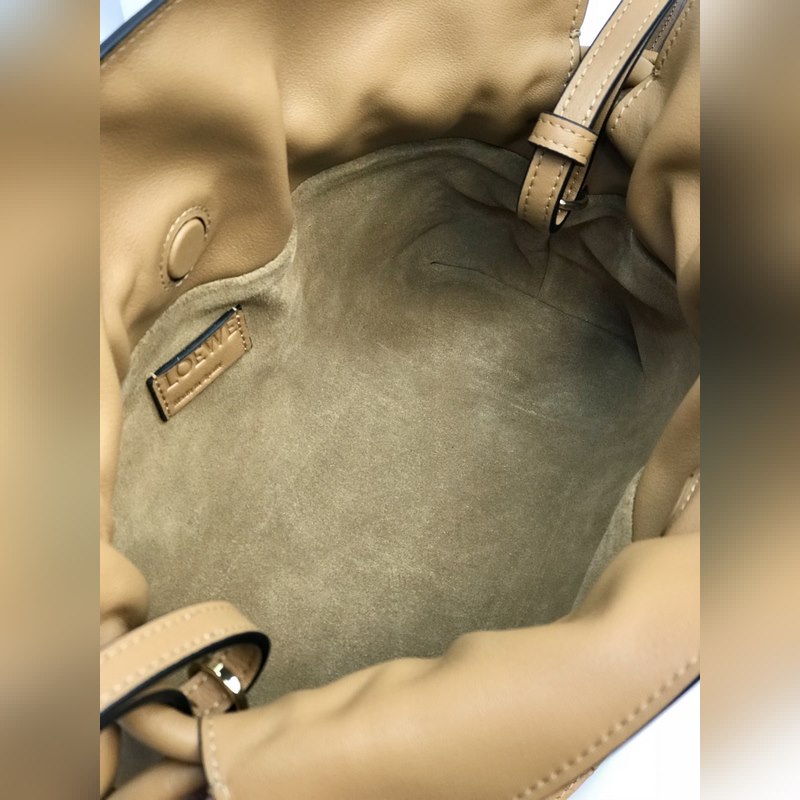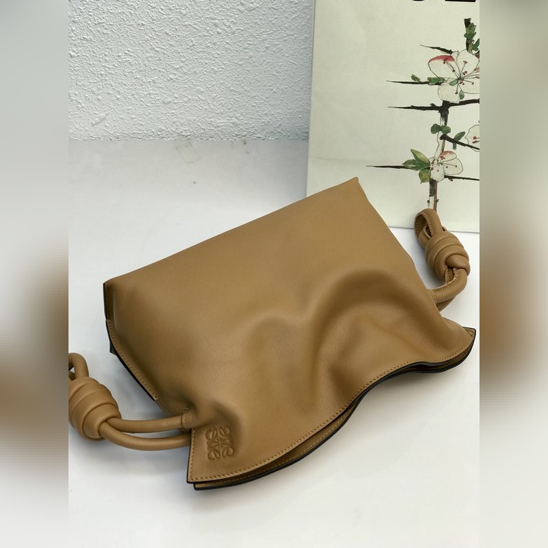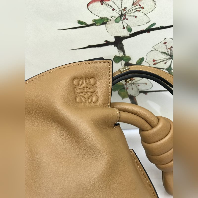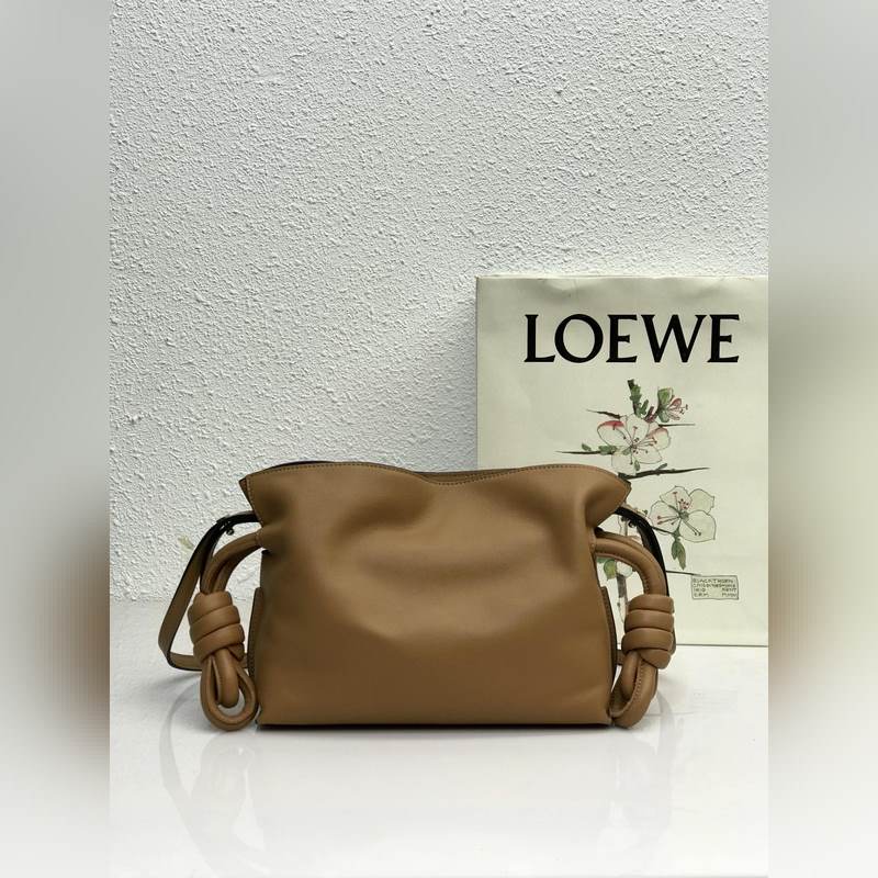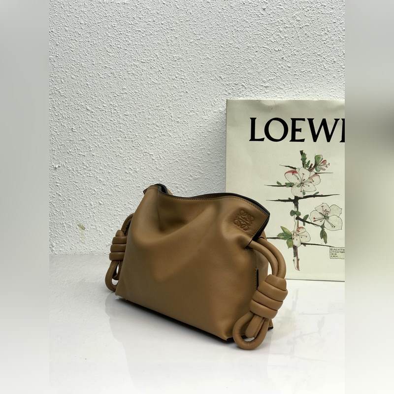 Flamenco Mini Lucky Bag Brown on valmistettu pehmeästä ja herkästä vasikannahasta, jossa on kiristysnyöri ja tunnusomainen kierretty solmu. Sitä voidaan kantaa olkapäällä, poikkivartalolla tai käsin irrotettavalla ja säädettävällä olkahihnalla, magneettisoljella ja mokkavuorella. Mini mallinumero 10855, koko 22,5*18*9