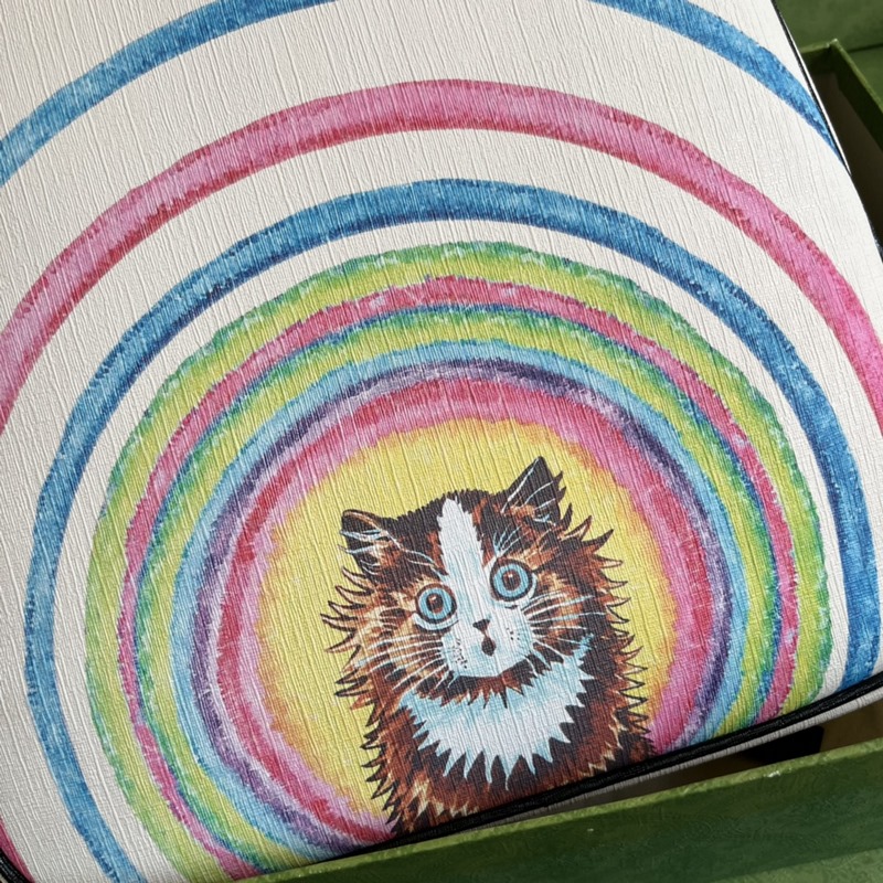 Rainbow Cats -reppu, joka on saanut inspiraationsa Fredrick Warnen lasten satukirjojen maalauksista ja tulkitsee Gucci Love March -kokoelman maagista ja unenomaista maailmaa. Tämä reppu on esitetty hassulla printillä. Repun etuosa on koristeltu leikkisällä kissojen printillä sateenkaaripensaiden ympäröimänä, ja kontrastiväriset olkahihnat tuovat eloisan ilmeen koko designiin. Ivory Supreme -kangas, ympäristöystävällinen materiaali, Fredrick Warne The Estate of Cicely Mary Barker, 2023. Käytetty Frederick Warne&Co:n luvalla. Sisällä vetoketjullinen tasku, vetoketjukiinnitys. Mallinumero: 433578.
