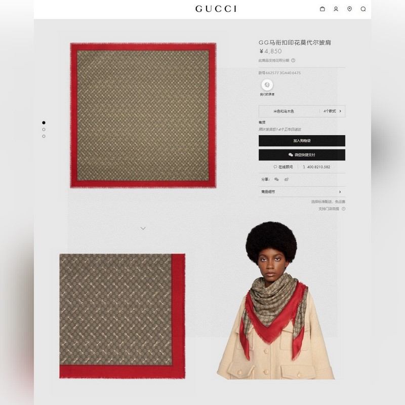GG-kashmir-kashmir-neliöhuivi 90-prosenttisesti hapsutettu kashmir-kuvioinen neliömäinen huivi, jossa on käytetty klassista GG-kuviota, jossa on keltainen horsebit-printti ja yksivärinen reunus, joka osoittaa runsaan ja elegantin luonteen. GG-kuvio on kunnianosoitus brändin perustajan Guccio Guccin poikkeukselliselle kokemukselle, ja hevoskuvio korostaa merkin ratsastusalkuperää. Neliömäinen huivi: 140*140cm 100% kashmir neliöhuivi Italialainen luomus