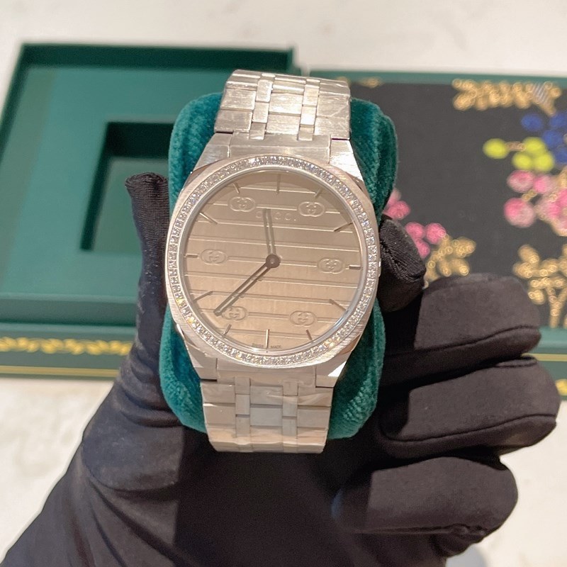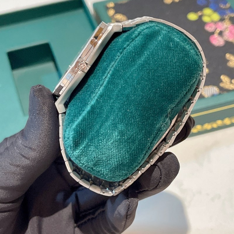 On ilmeistä, että muotoilu on tyyliltään samanlainen: ainutlaatuinen ja hyvin tunnistettava ulkonäkö, integroitu rannekoru ja viivoja kaikkialla. Nimi GUCCI 25H tulee brändin luovalta johtajalta Alessandro Micheleltä, joka pitää “25” onnennumerona ja amulettina ja heijastaa tätä lukua jatkuvasti erilaisissa Gucci-sarjoissa. Meille 25H voi olla myös pieni toive saada joka päivä ylimääräinen tunti. GUCCI 25H -sarjassa on hyvin erottuva tyyli ja erittäin tunnistettava muotoilu. Virtaviivainen muotoilu on saanut inspiraationsa nykyaikaisen arkkitehtuurin sileästä muodosta. Kellossa on monikerroksinen kotelorakenne, ja harjatussa ja kiillotetussa kotelossa ja kehyksessä on selkeä rakenne. Kellotaulu on yksinkertainen, siinä on tangon muotoinen tuntimerkki ja tikun muotoinen osoitin. Raidallinen kuvio on itse asiassa harjattu, mikä muodostaa ainutlaatuisen visuaalisen tehosteen käsittelemättömällä kellotaululla. Brändin kaksois-G-logon ansiosta ihmiset voivat tunnistaa kellon identiteetin yhdellä silmäyksellä. Samaan aikaan kellossa on piilotettu kruunumuotoilu, mikä tekee kokonaiskuvasta harmonisemman ja kauniimman. Koko 38mm.