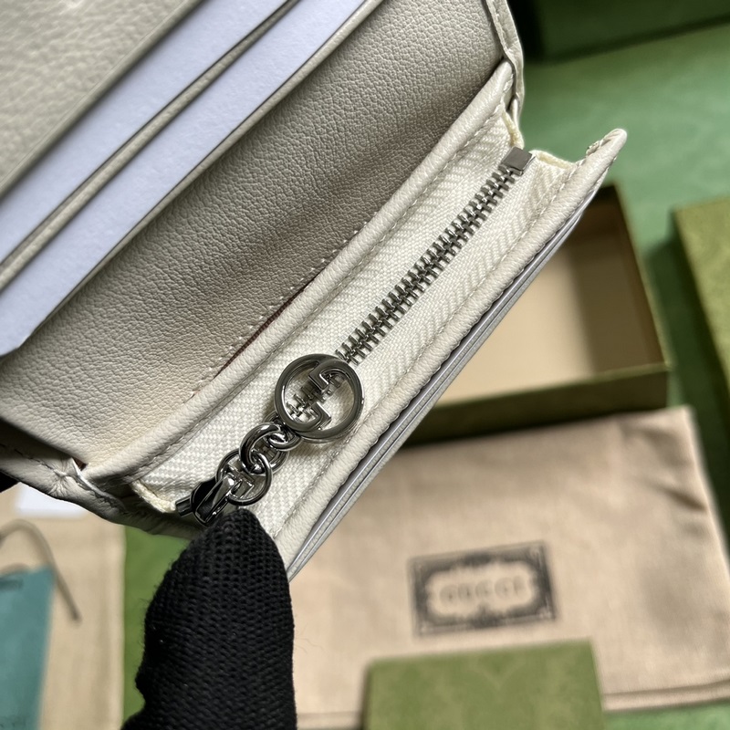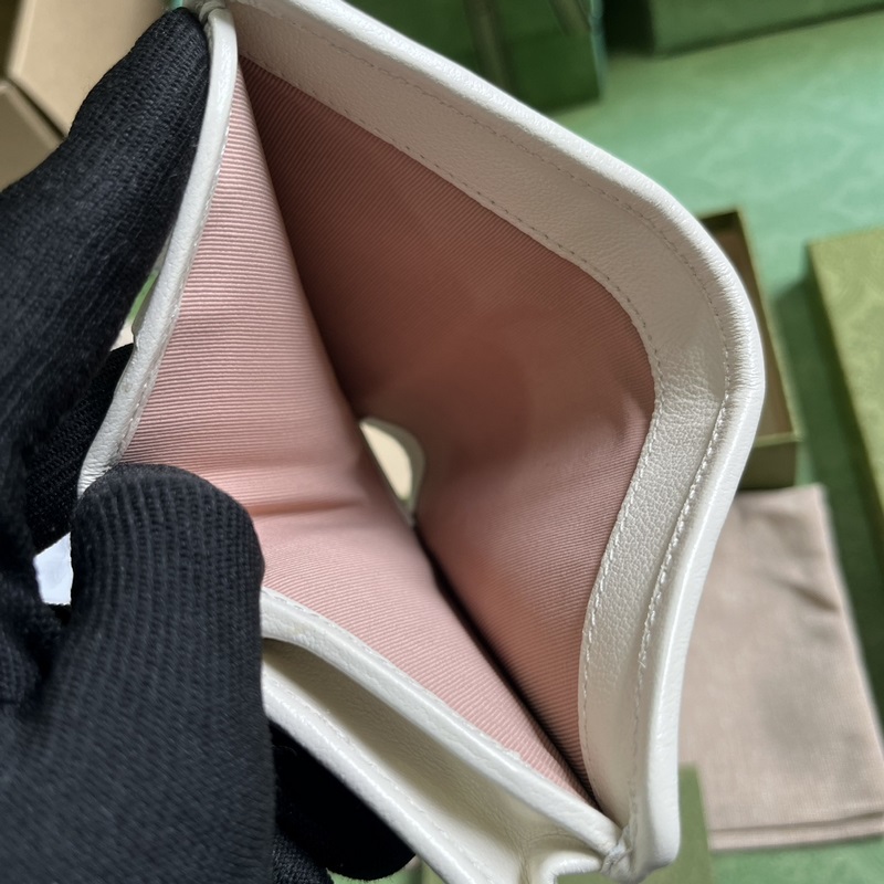 Gucci Blondie -sarjan korttiteline. Gucci Blondie -sarjassa käytetään merkin rohkeaa kuviota ja samanväristä nahkakuviota, joka huokuu hienovaraista ja hillittyä tunnelmaa kaikkialla. Sarja integroi nerokkaasti pyöreän geometrisen tyylin toisiinsa lukittavan kaksois-G: n, mikä osoittaa Guccin modernin esteettisen muotoilun. Tämän valkoisen nahkaisen korttipidikkeen logon yksityiskohta on näkyvästi esillä laukun rungossa. Valkoinen nahka, taftivuori, pyöreä lukittava kaksois-G-nahkamerkki, sisäpuoli: viisi korttitaskua, yksi avotasku ja yksi vetoketjutasku, nappikiinnitys ja sulkeminen. Paino: noin 0,2 kg.