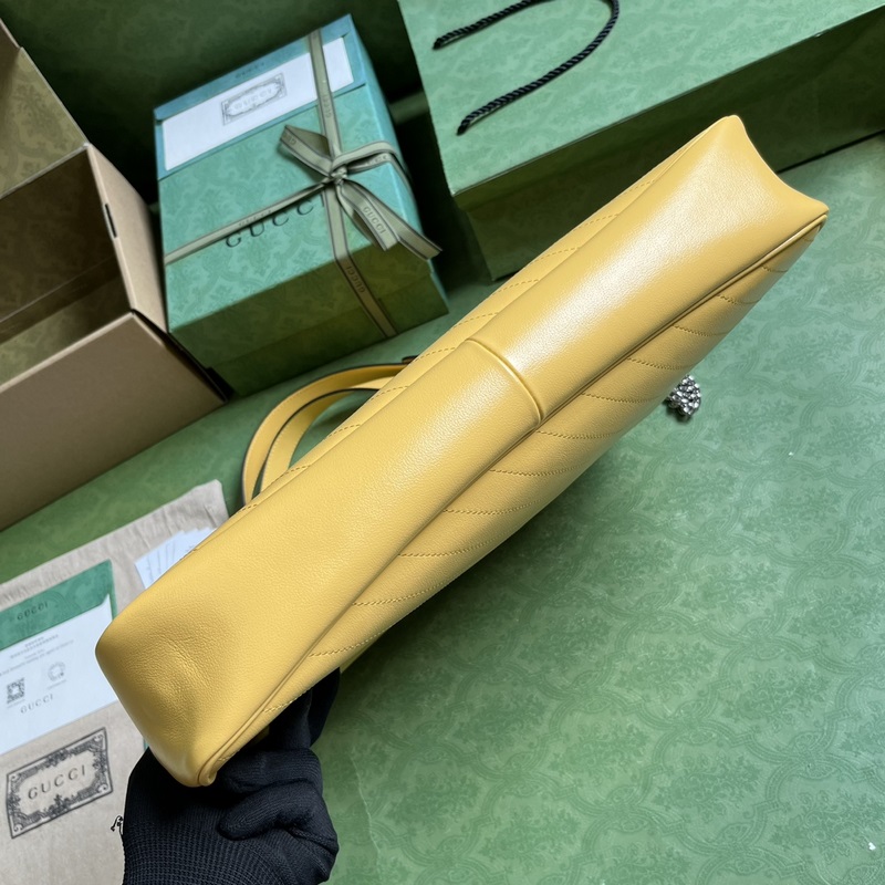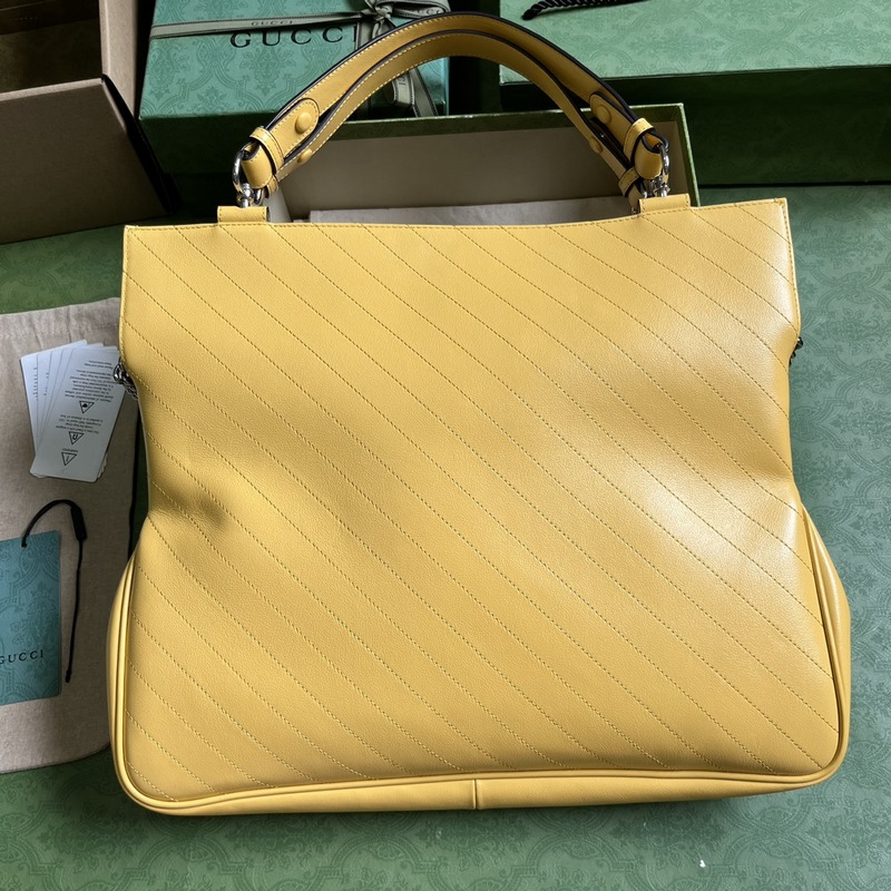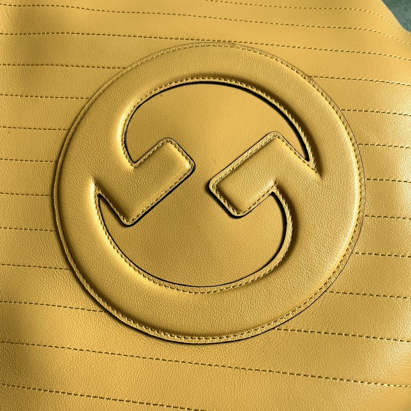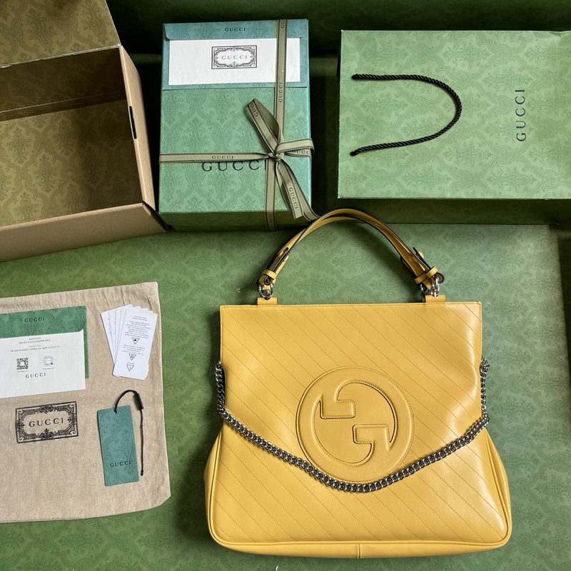 Gucci Blondie keskikokoinen laukku. Gucci Blondie -sarjan laukut on koristeltu nerokkaasti pyöreällä toisiinsa lukittavalla kaksois-G-elementillä, joka on saanut inspiraationsa brändin arkistoiduista symbolisista elementeistä. Tässä Gucci Blondie -sarjan kantolaukussa on yläkahva ja ketjullinen olkahihna, ja laukun runkoa koristaa silmää hivelevästi nahkapaikoista tehty logo. Keltainen nahka-, puuvilla- ja pellavavuori, pyöreät toisiinsa lukittavat kaksinkertaiset G-nahkapaikat, sisäpuoli: 3 pääosastoa ja 1 vetoketjutasku, yläkahva (20 cm korkea) ketjun olkahihna (42 cm korkea). Paino: Noin 1,2 kg.