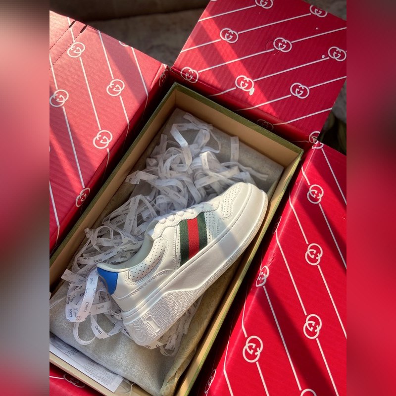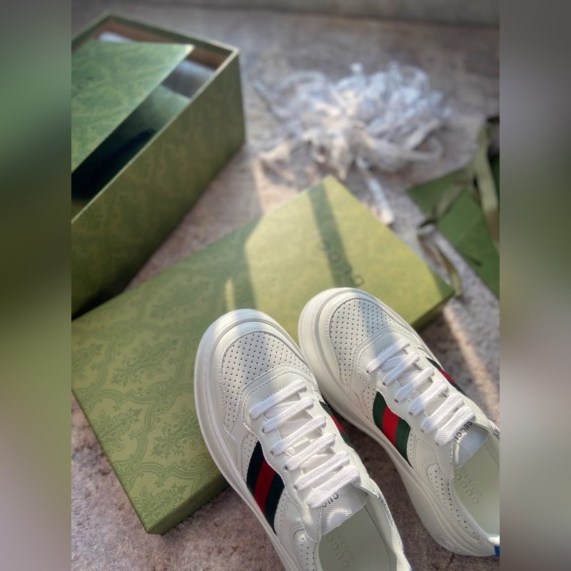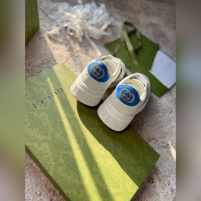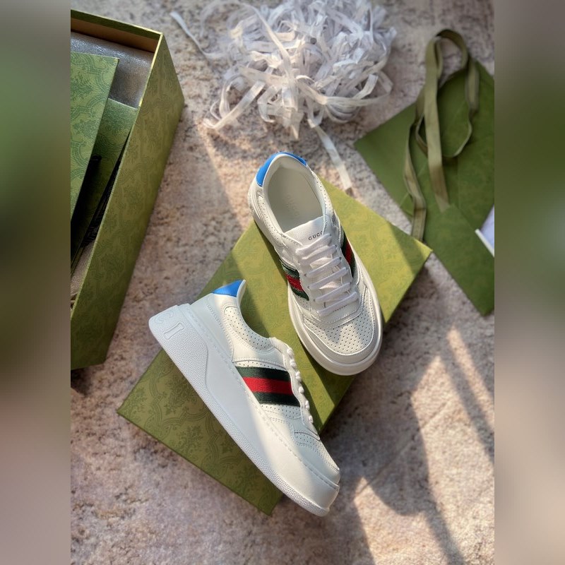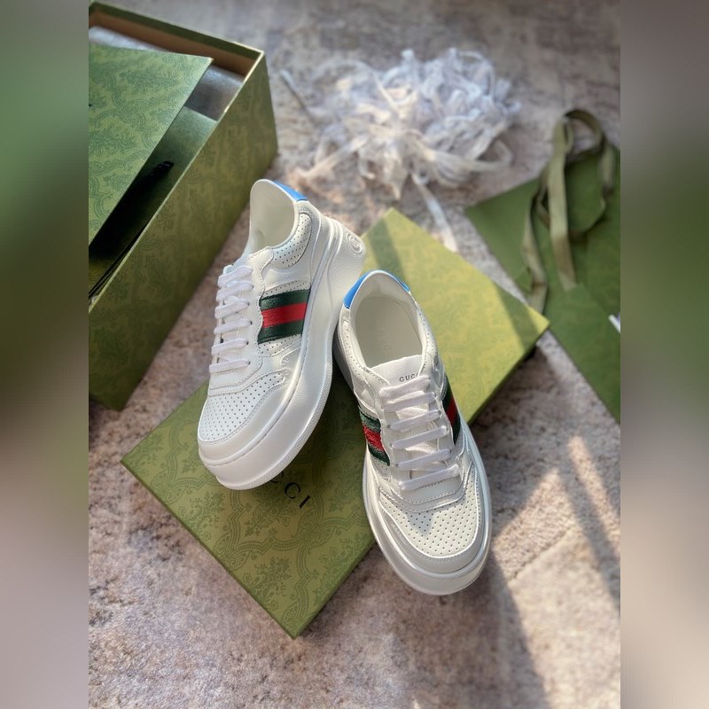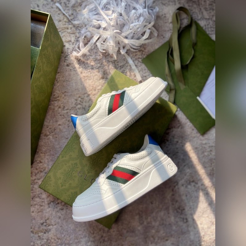 Syksyllä ja talvella Gucci Couples Uudet Chunky B-sarjan lenkkarit – Intohimoiset retrotunnelmat, sama tyyli mies- ja naispareille, pakollinen romanttiselle matkalle alkutalvella, paksu pohja, joka muistuttaa klassisten valkoisten kenkien päivitettyä versiota, alkuperäinen mittatilaustyönä tehty lehmännahkakangas (klassinen vanha kukkakangas, iso rei’itys, Guccissa on alkuperäinen logo ja emboss GG-logo kantapäässä, 4 cm korotettu paksu pohja
