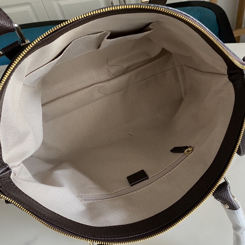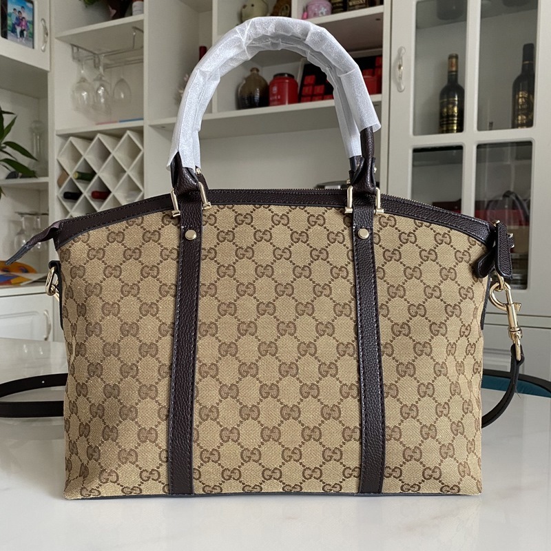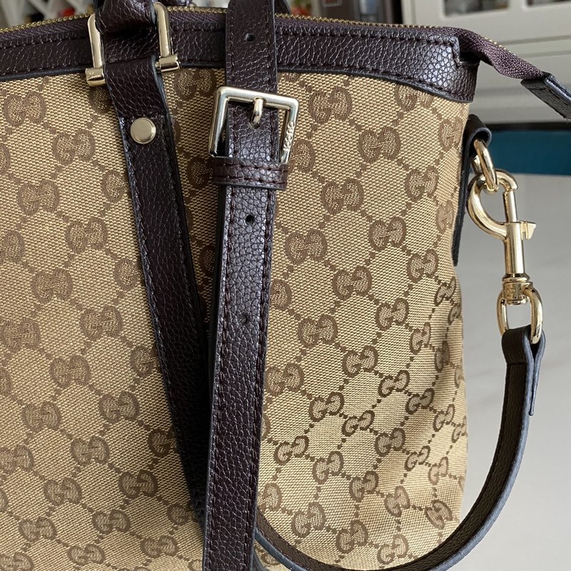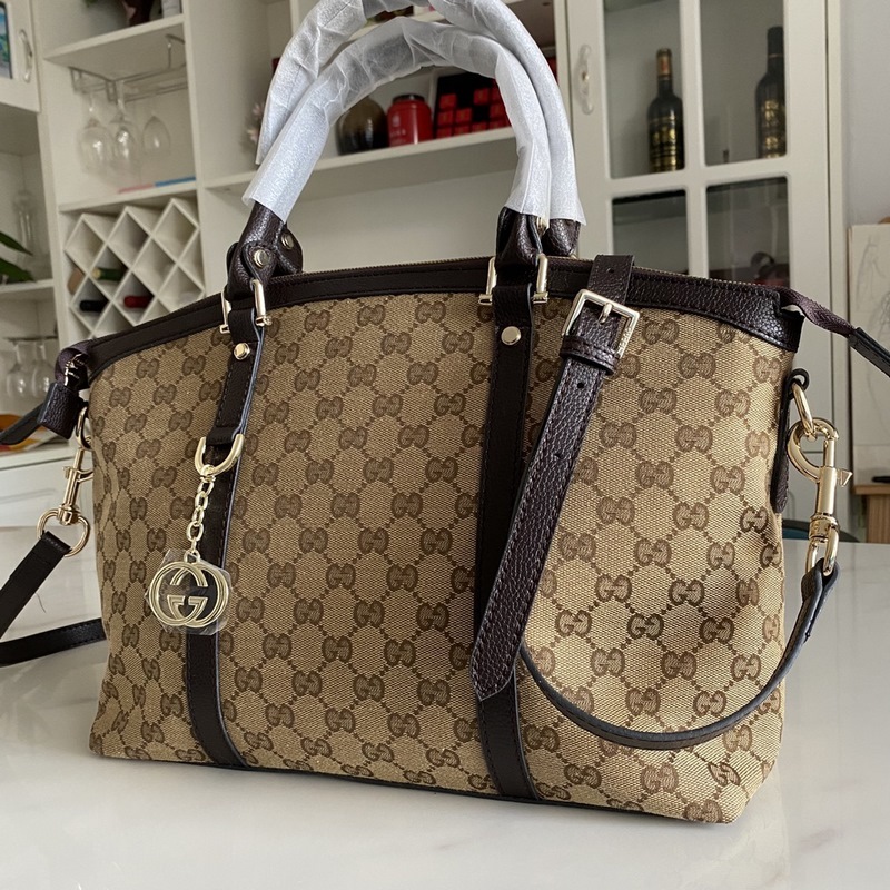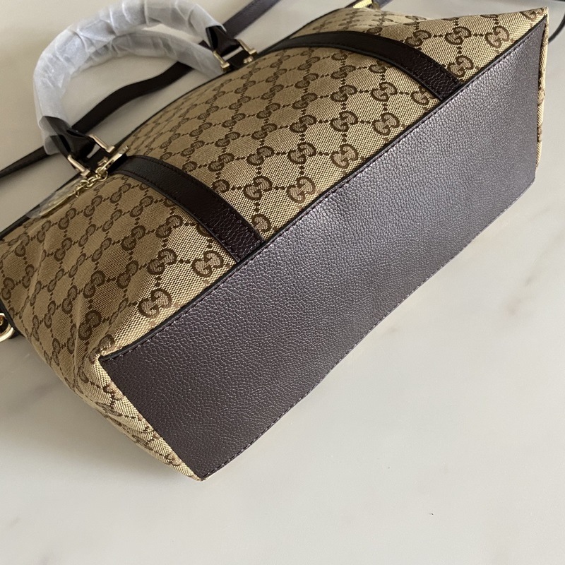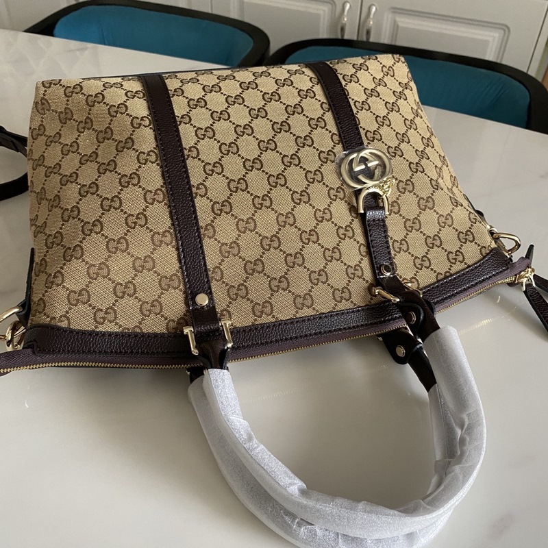 Tämä suuri strukturoitu kanvaskassi on valmistettu GG Supreme -kankaasta, jossa on ruskea nahkaputki, ja siinä on kaksi kantovaihtoehtoa: yläkahva ja olkahihna