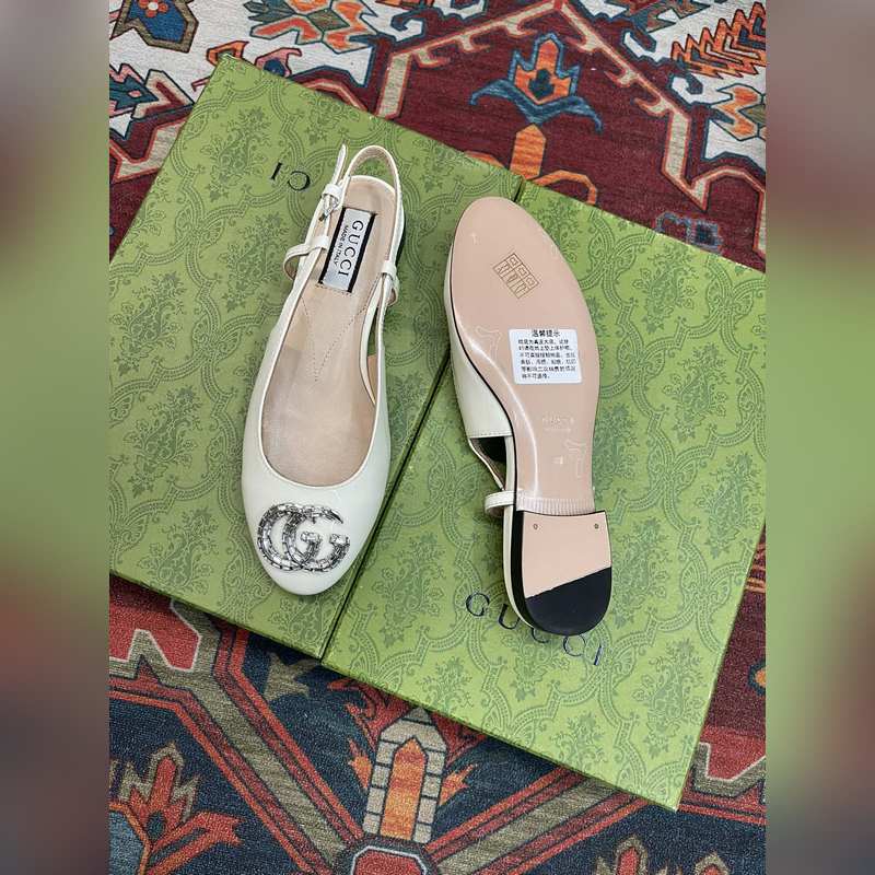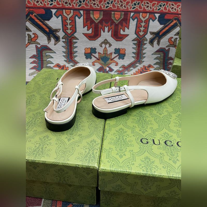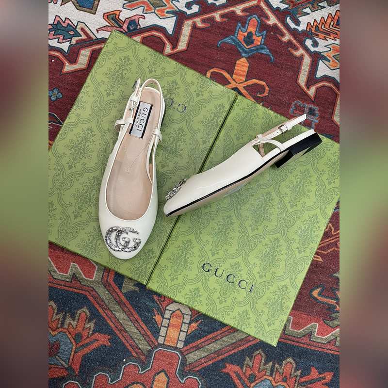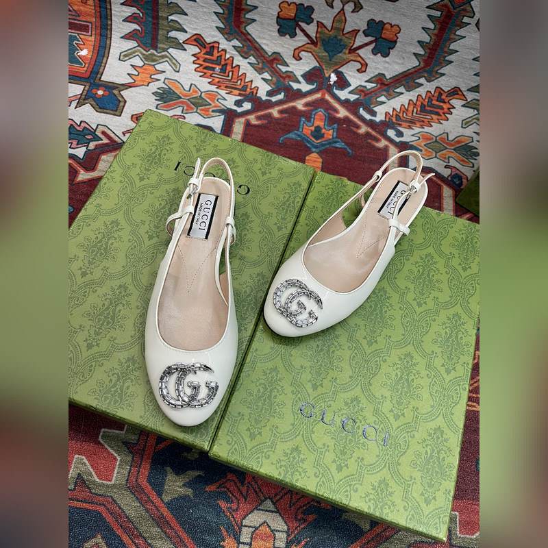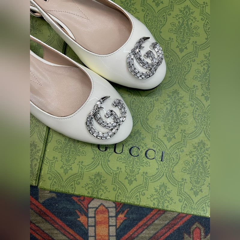 Guccin kristallilla koristellut Double G G:n muotoiset asusteet tuovat modernia ilmettä naisten kenkiin. Häikäisevät asusteet koristelevat kirkkaasti erilaisia kenkiä (sandaalit ja yksittäiset kengät) liukumäistä alustapumppuihin, ja ne asetetaan värikkään kiiltonahkaa tai metallinahkaa vasten esitelläkseen ylellistä luonnettaan. Nämä balettikengät on valmistettu kiiltävästä kiiltonahasta ja koristeltu katseenvangitsevilla merkkilogoyksityisillä päällisessä.