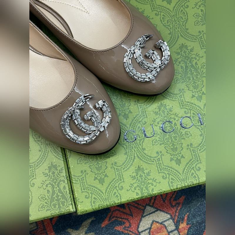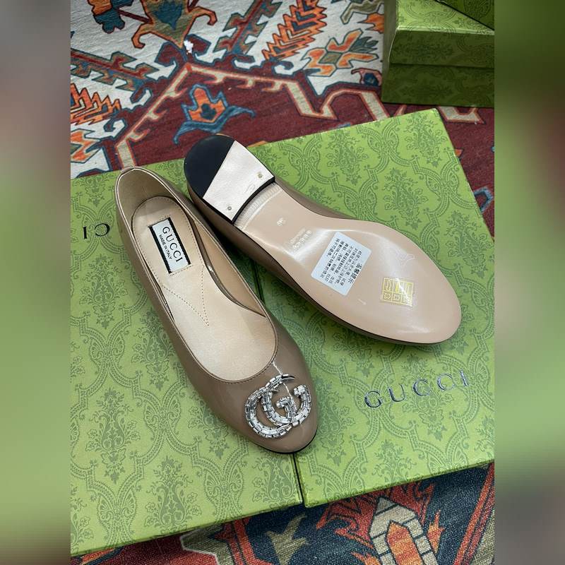 Guccin kristallilla koristellut Double G G:n muotoiset asusteet tuovat modernia ilmettä naisten kenkiin. Häikäisevät asusteet koristelevat kirkkaasti erilaisia ​​kenkiä (sandaalit ja yksittäiset kengät) liukumäistä alustapumppuihin, ja ne asetetaan värikkään kiiltonahkaa tai metallinahkaa vasten esitelläkseen ylellistä luonnettaan. Nämä balettikengät on valmistettu kiiltävästä kiiltonahasta ja koristeltu katseenvangitsevilla merkkilogoyksityisillä päällisessä.