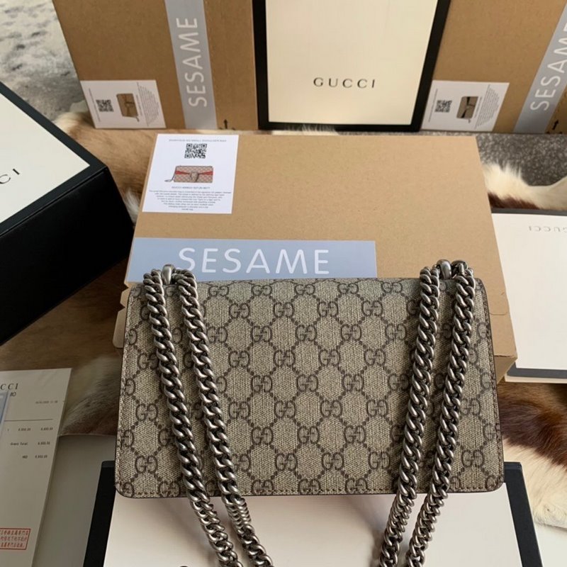 Gucci-laukun mallinumero: 499623Dionysus-sarjan pieni olkalaukku koristeltu GG-kuvioidulla tiikeripään soljella lisää kiiltoa tähän strukturoituun olkalaukkuun Liukuva ketjulaukku, jossa on useita kantomenetelmiä, voidaan vapaasti muuttaa olkapään ja käsilaukun väliin. pakkaus