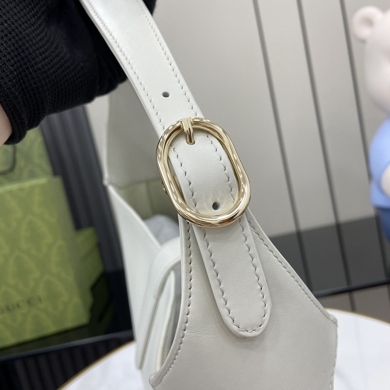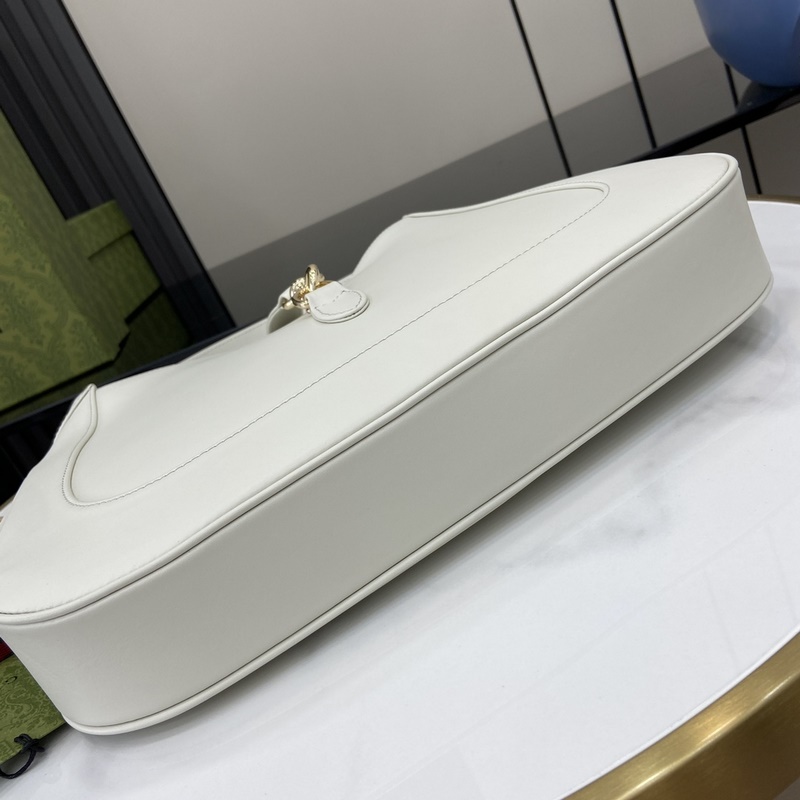 Uusi Gucci Jackie Medium olkalaukku. Tämä hienoimmasta premium-nahasta valmistettu Gucci Jackie -olkalaukku kevät/kesä 2025 mallistosta esittelee merkin klassisten olkalaukkujen käsityötaitoa, puolikuun muotoa ja nykyaikaista muotoilua. Vaalean kullan sävyinen laitteisto, nahkaiset putket ja ylimääräinen punainen ja vihreä verkkohihna antavat tälle Gucci Jackie Medium -olkalaukulle valkoista nahkaa entistä enemmän muotoilumahdollisuuksia. Valkoinen nahka, vaalean kullan sävyinen laitteisto