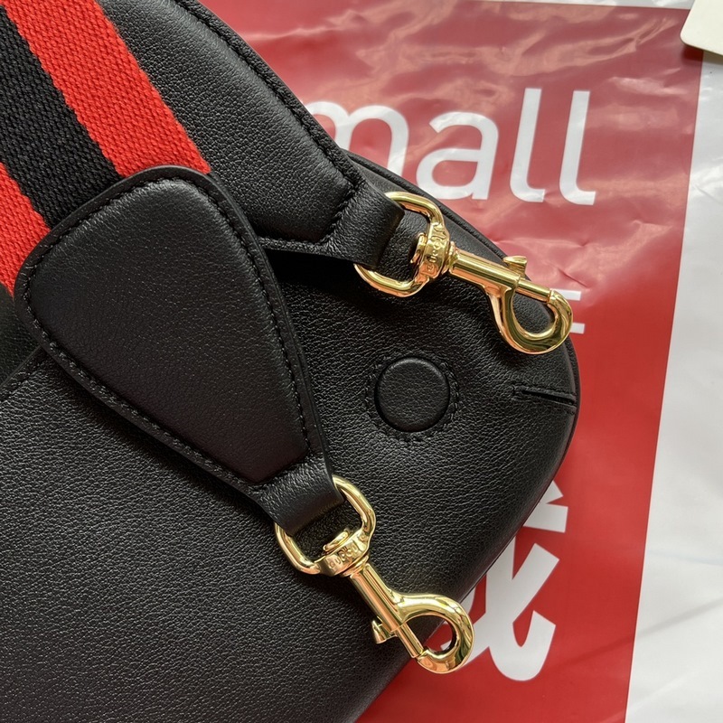 GG “Gucci Love March” uusi muotisarja valitsee brändin kokoelman elementtejä, tulkitsee uudelleen toisiinsa kytkeytyvän kaksois-G-logon geometrisilla muodoilla ja esittelee erilaisia ainutlaatuisia esineitä. Kullansävyiset asusteet lisäävät tähän esineeseen ripauksen eleganttia retrotyyliä osoittaen klassista ja ajatonta muotoilutyyliä, aivan kuten tämän muotinäytöksen paikka. Tämä vaaleanruskea nahkainen minikäsilaukku on yhdistetty kahdella vaihdettavalla olkahihnalla, mustalla alkuperäisnahkalla tai raidallisella verkolla, mikä auttaa tulkitsemaan erilaisia tyylejä ja ulkoasuja