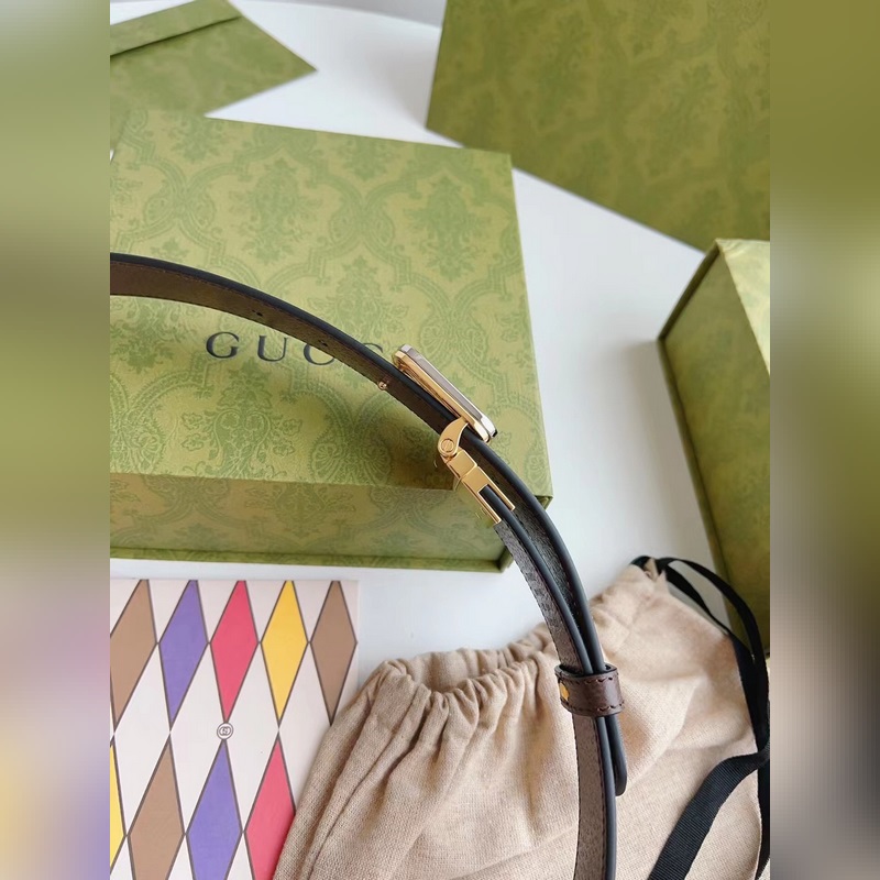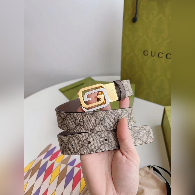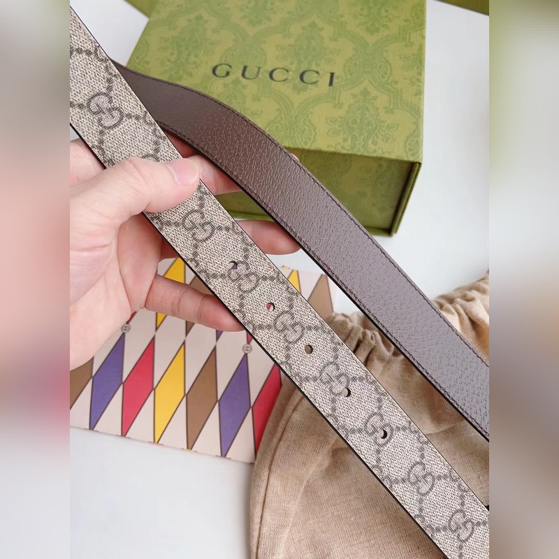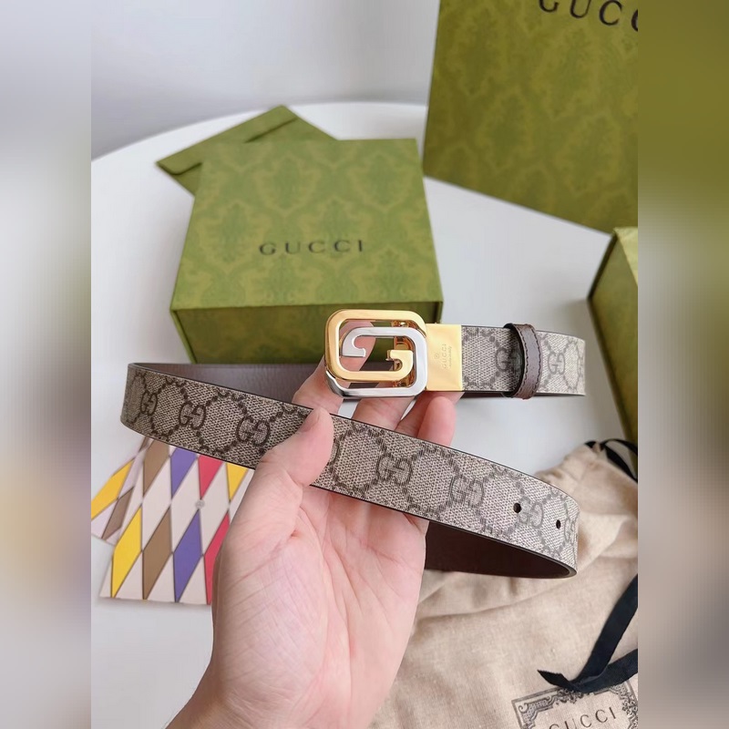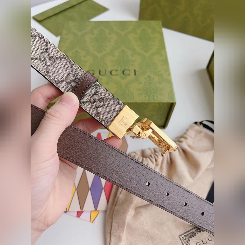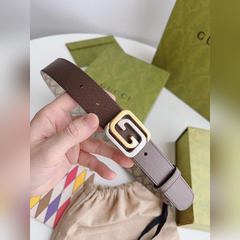 Guccin uusinta ruskeaa kangasnahkaa ruskealla possunnahalla voidaan käyttää molemmin puolin. Leveys 3,0 cm Neliömäinen G-solki