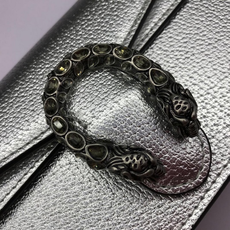 Strukturoitu nahkaketju supermini käsilaukku avaimenperällä, jolla voidaan kiinnittää se toiseen suurempaan käsilaukkuun. Suljin on koristeltu kuvioidulla tiikeripään kannussoljella – tämä ainutlaatuinen yksityiskohta on saanut inspiraationsa kreikkalaisesta jumalasta Dionysuksesta