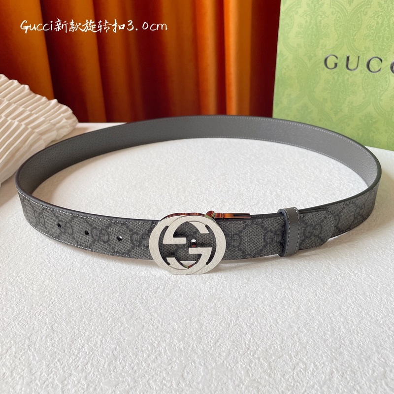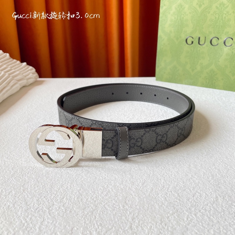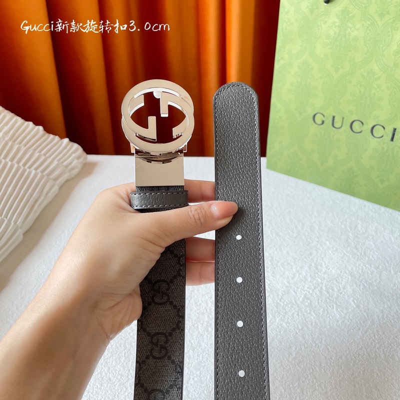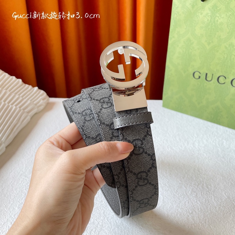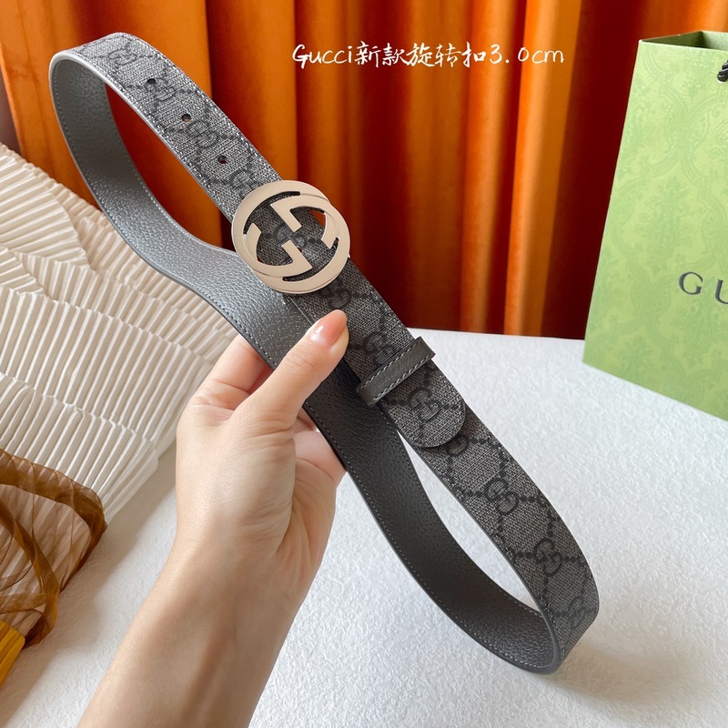 Guccin uusi tuote. Toisella puolella on uusi harmaa ja musta PVC-painatus. Toinen puoli on tuonut maahan harmaata siannahkaa. Kääntyvä hieno kuparisolki. Kaksipuolinen. Voidaan leikata. Kaistanleveys 3,0 cm