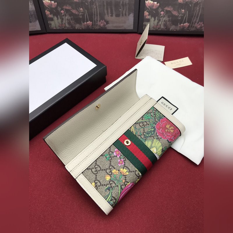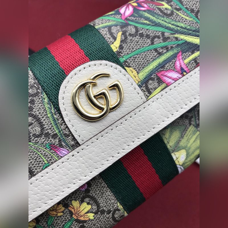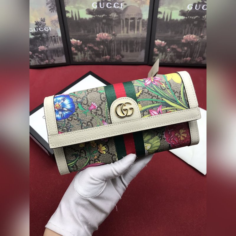 Ophidia-sarjan kukkakangas pitkä lompakko on valmistettu GG Supreme edistyksellisestä kukkaprinttikankaasta ikonisella kuviolla ja raidallisella nauhalla [aurinko] merentakaisten huippulaitteiden hienostunut malli 523153 valkoinen kukka/valkoinen nahka. Koko: L19×K10,5×s3cm. Tuotenumero: