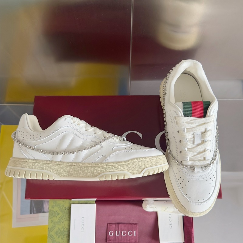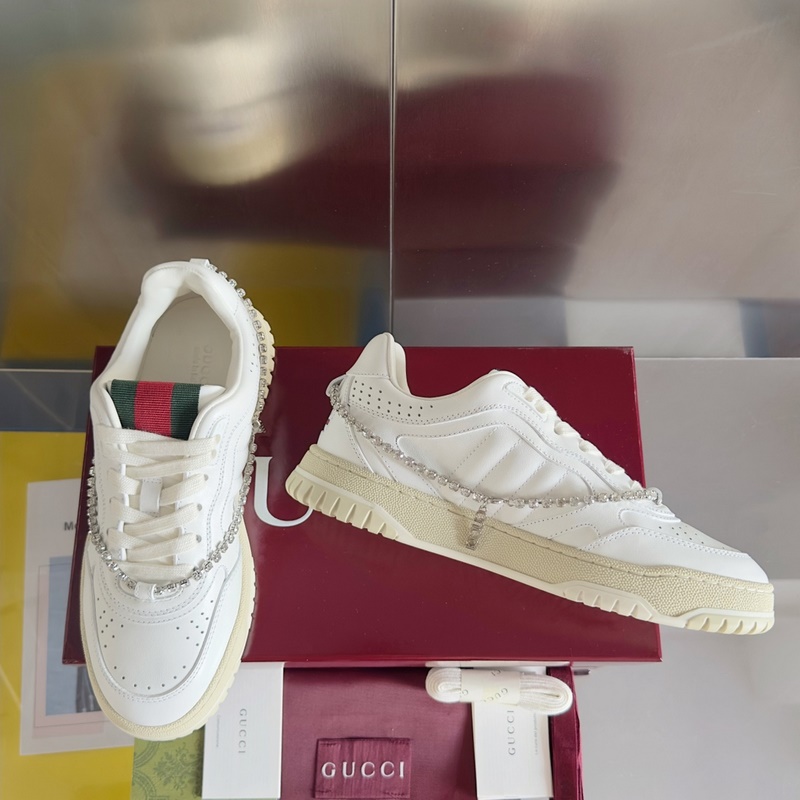 Alkuperäinen osto, kehitys ja tuotanto Sabato De Sarnon ensimmäisenä Guccille luomana tennarina, Re-boltesd-sarjan strippi- ja strippisarjan uudelleentulkinnat esteettömät tyylikkäät yksityiskohdat luovat modernin siluettisuunnittelun. Nämä lenkkarit on valmistettu valkoisesta nahasta ja koristeltu huolellisesti kristalliketjuyksityiskohtien kanssa Gucci-riipusilla. Useiden klassisten yksityiskohtien kekseliäisyyden ansiosta uudet lenkkarit ovat katseenvangitsijaa