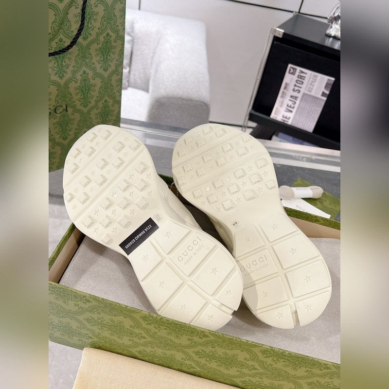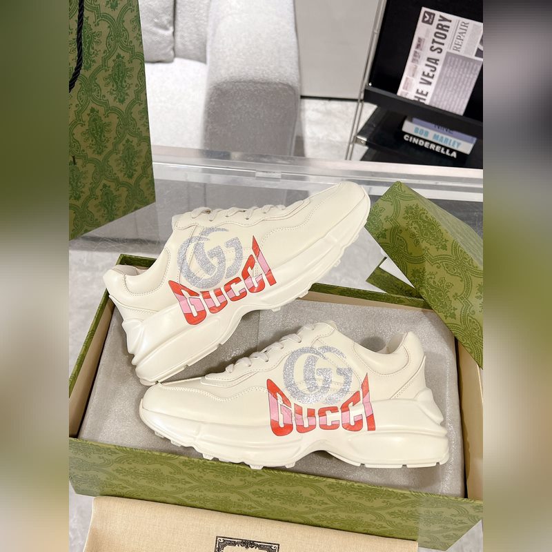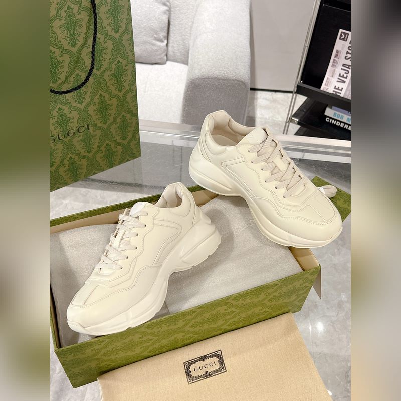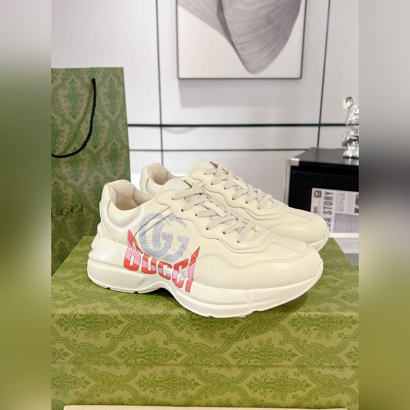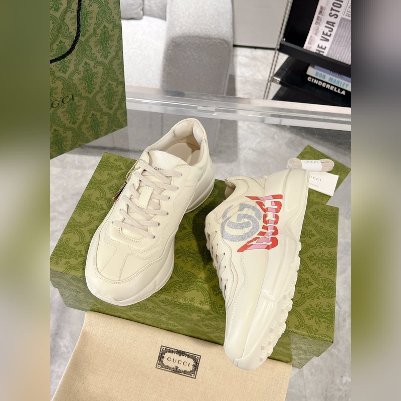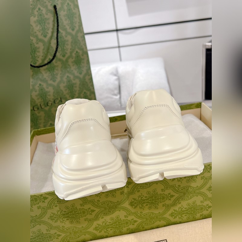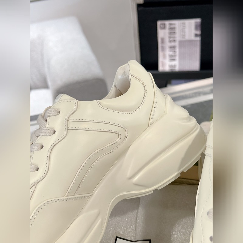 Rhyton-sarja lanseeraa uuden norsunluunvärisen nahkatyylin, jossa yhdistyvät taitavasti sarjan ikoninen ylisuuri pohja ja paksu rakenne. Tämä klassinen kenkä on koristeltu ikonisella lukittavalla kaksois-G:llä, joka tulkitsee tuotemerkin logon konnotaatiota.