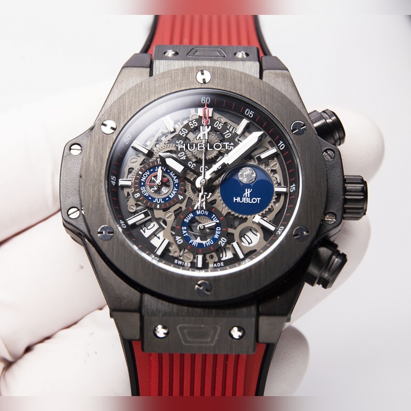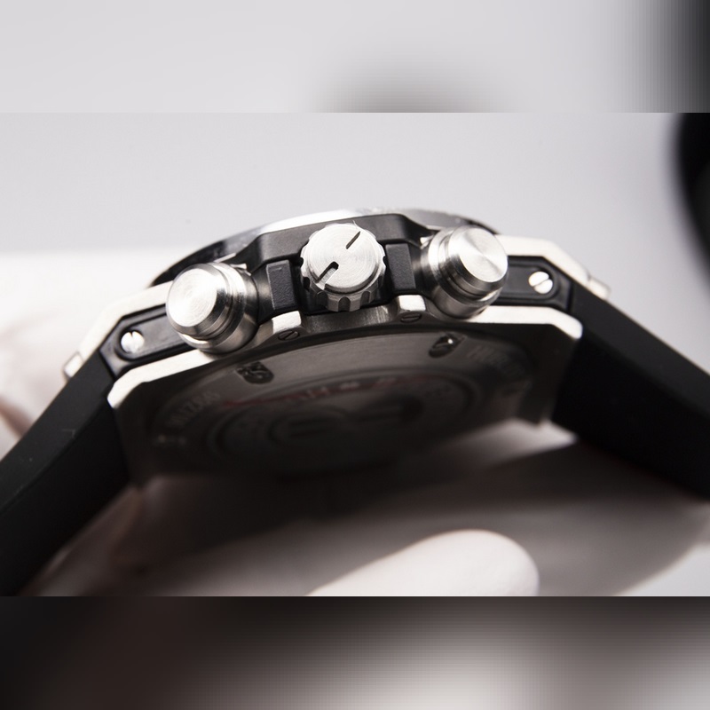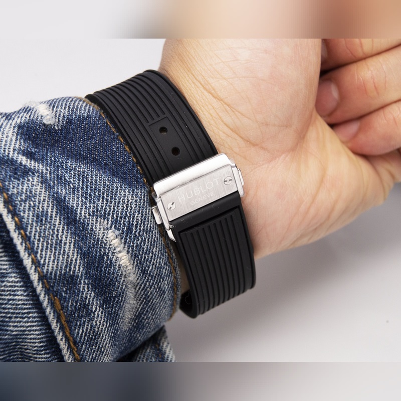 Miesten kellon 316 ruostumattomasta teräksestä valmistettu kotelo Kotelo on kiillotettu hienoksi CNC-tekniikalla varmistaakseen yksityiskohdat kaikkiin suuntiin. Kehys korostaa Hublotin ainutlaatuista harjattua ammattitaitoa. Hihnassa on käytetty maahantuotua kumihihnaa ja päällyskerrosta vasikannahkaa.